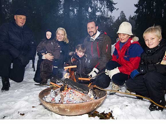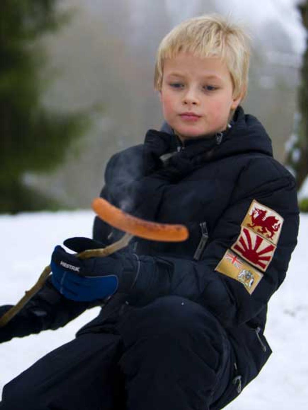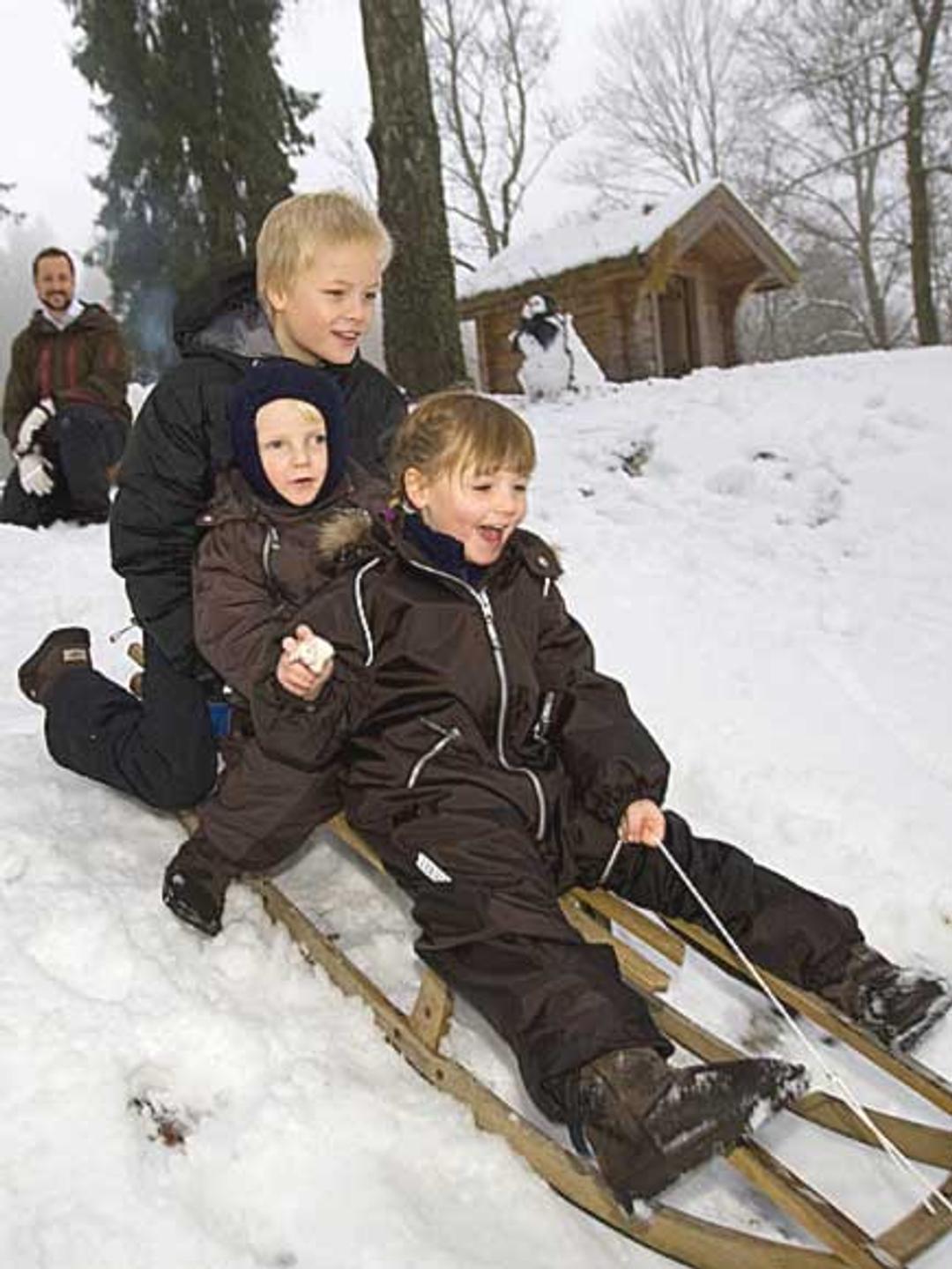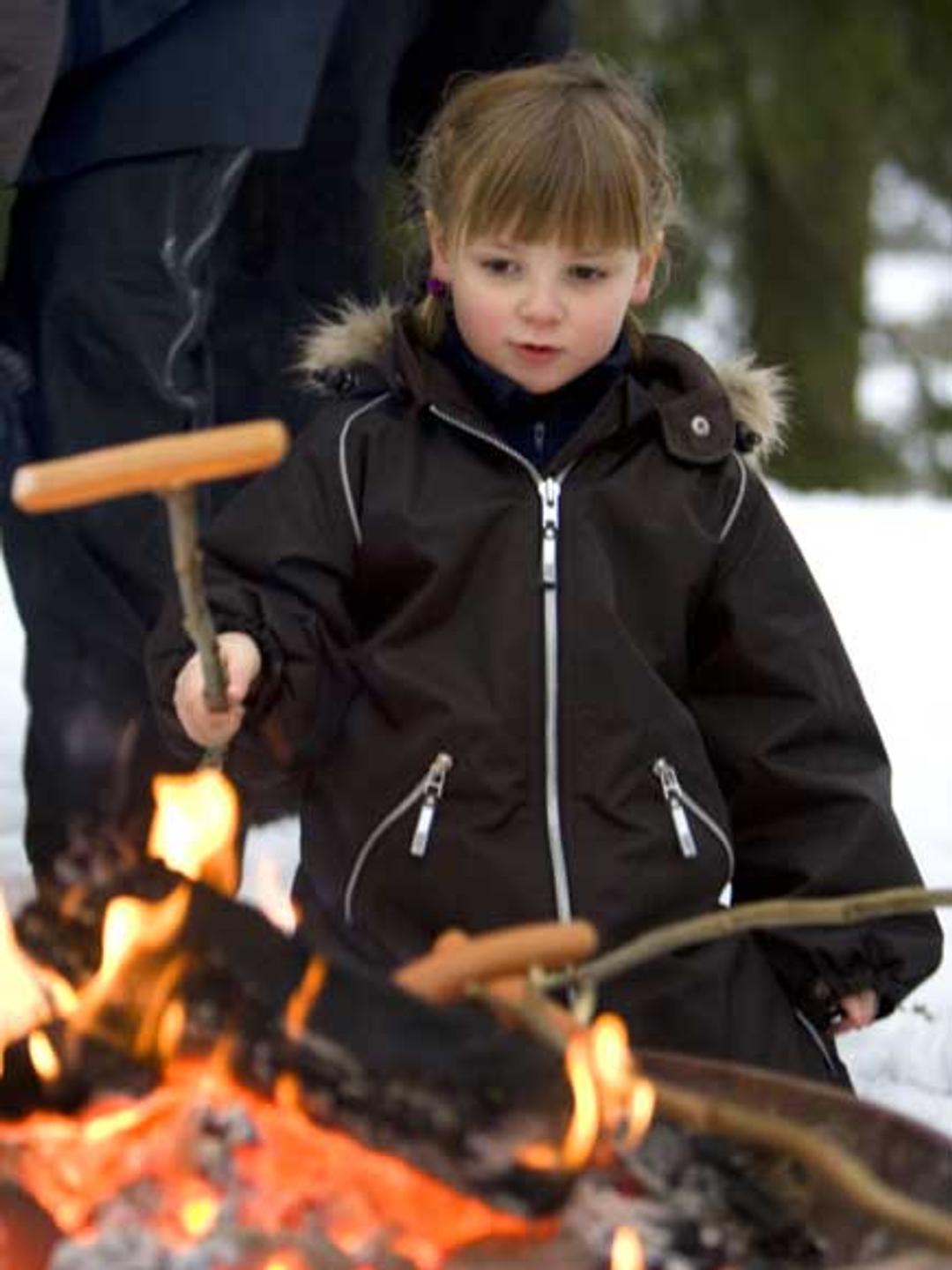 Kongefamilien grillet pølser på bål, bygget snømann og akte kjelke.