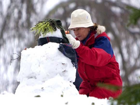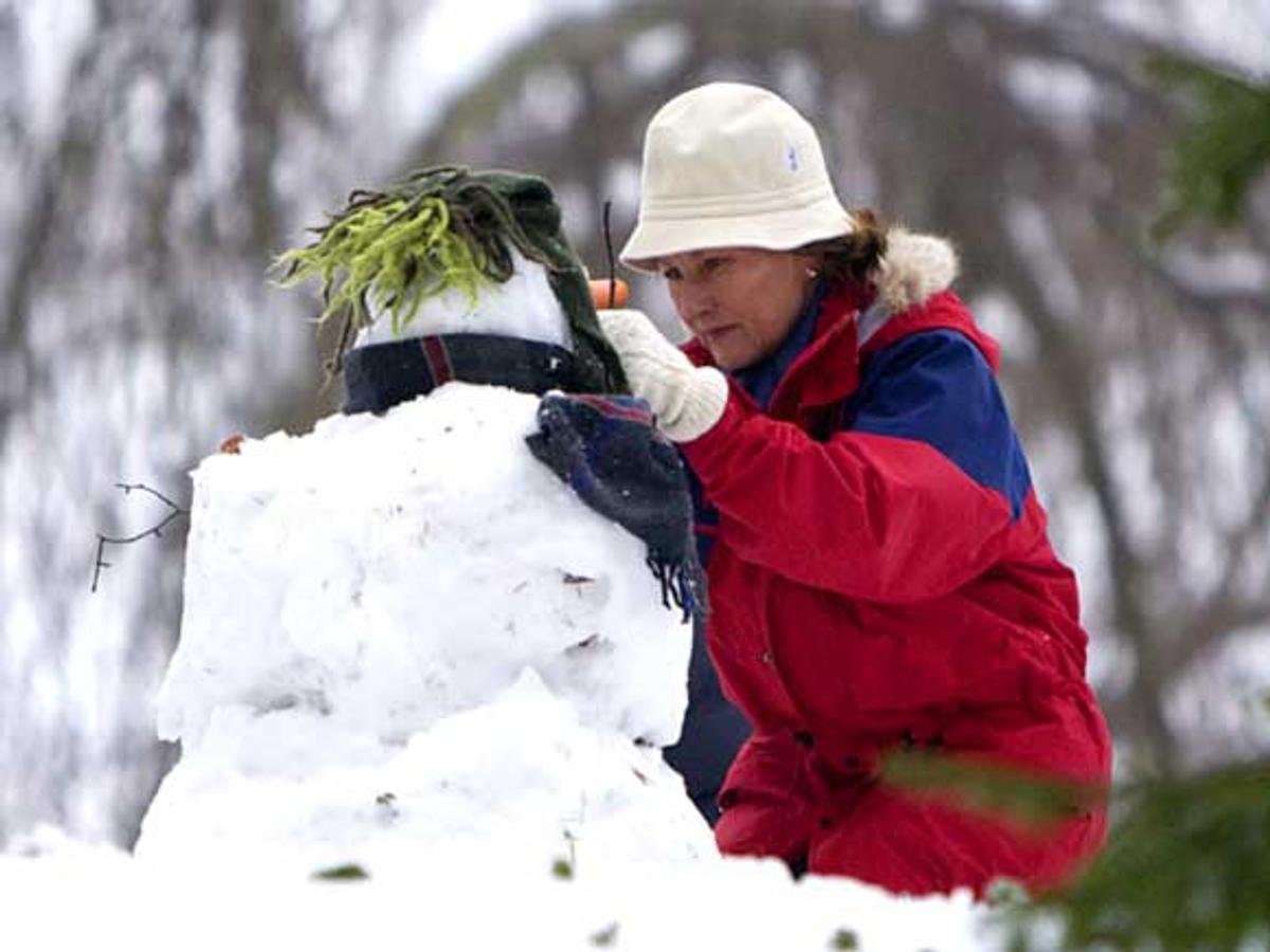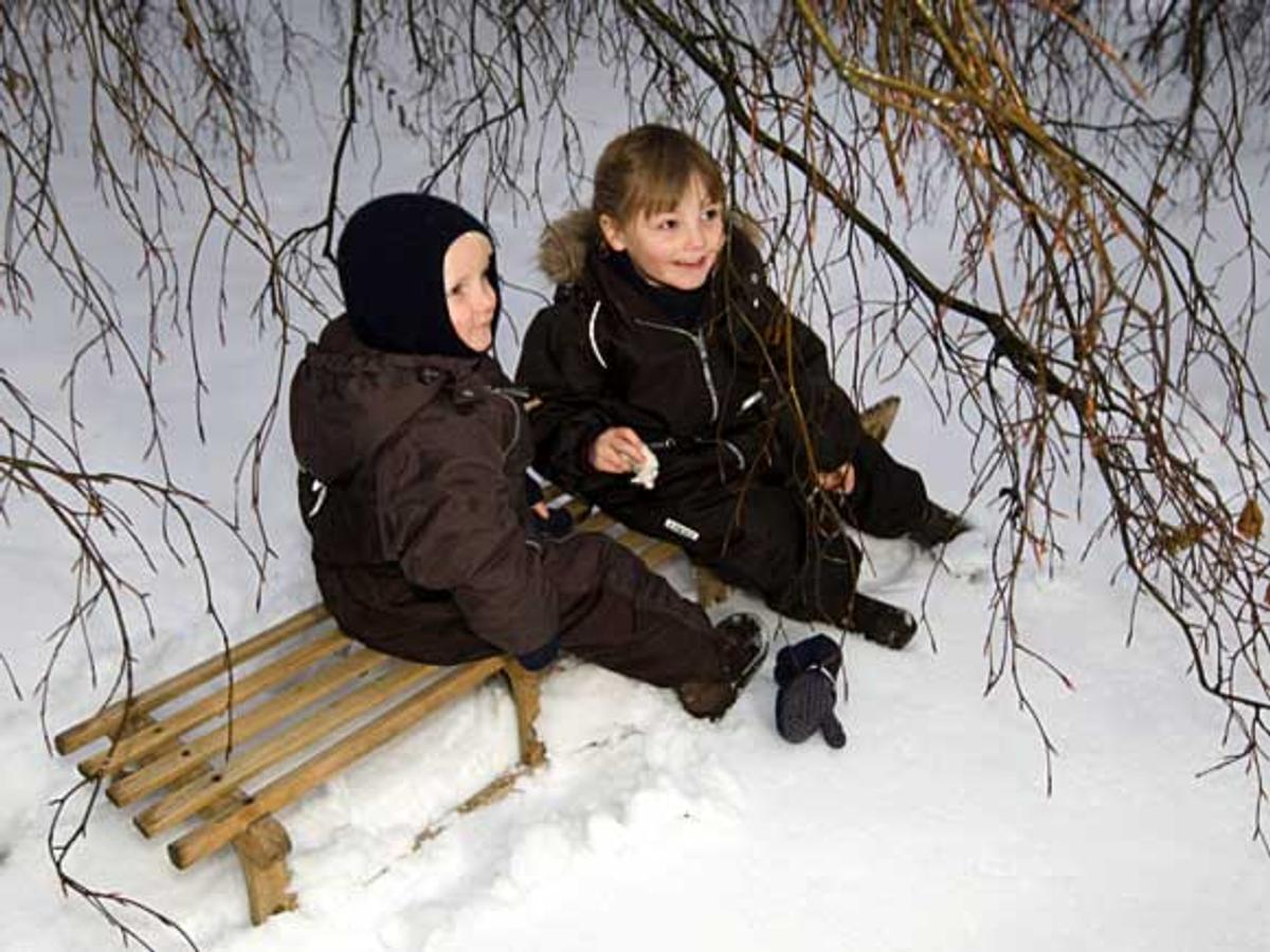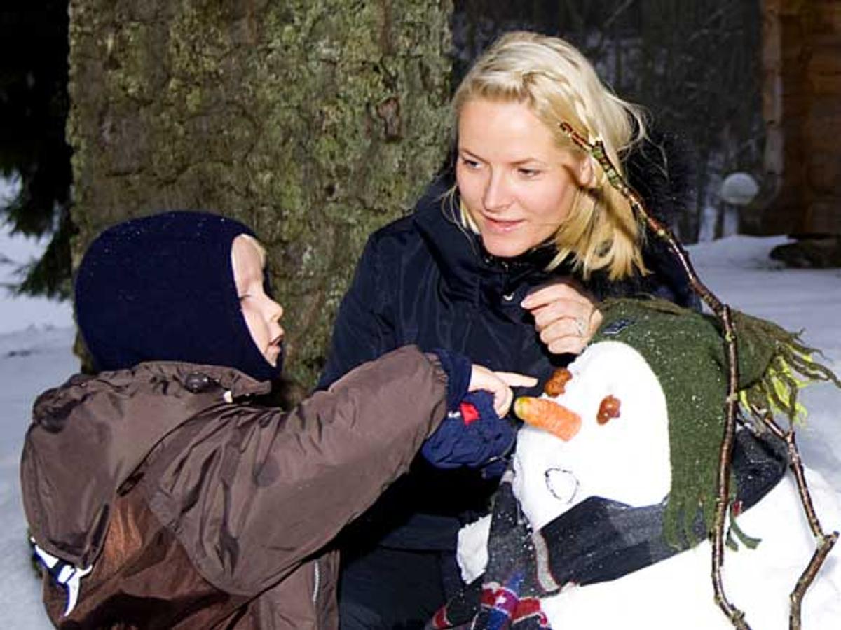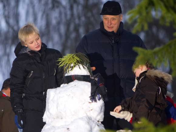 Kongefamilien grillet pølser på bål, bygget snømann og akte kjelke.