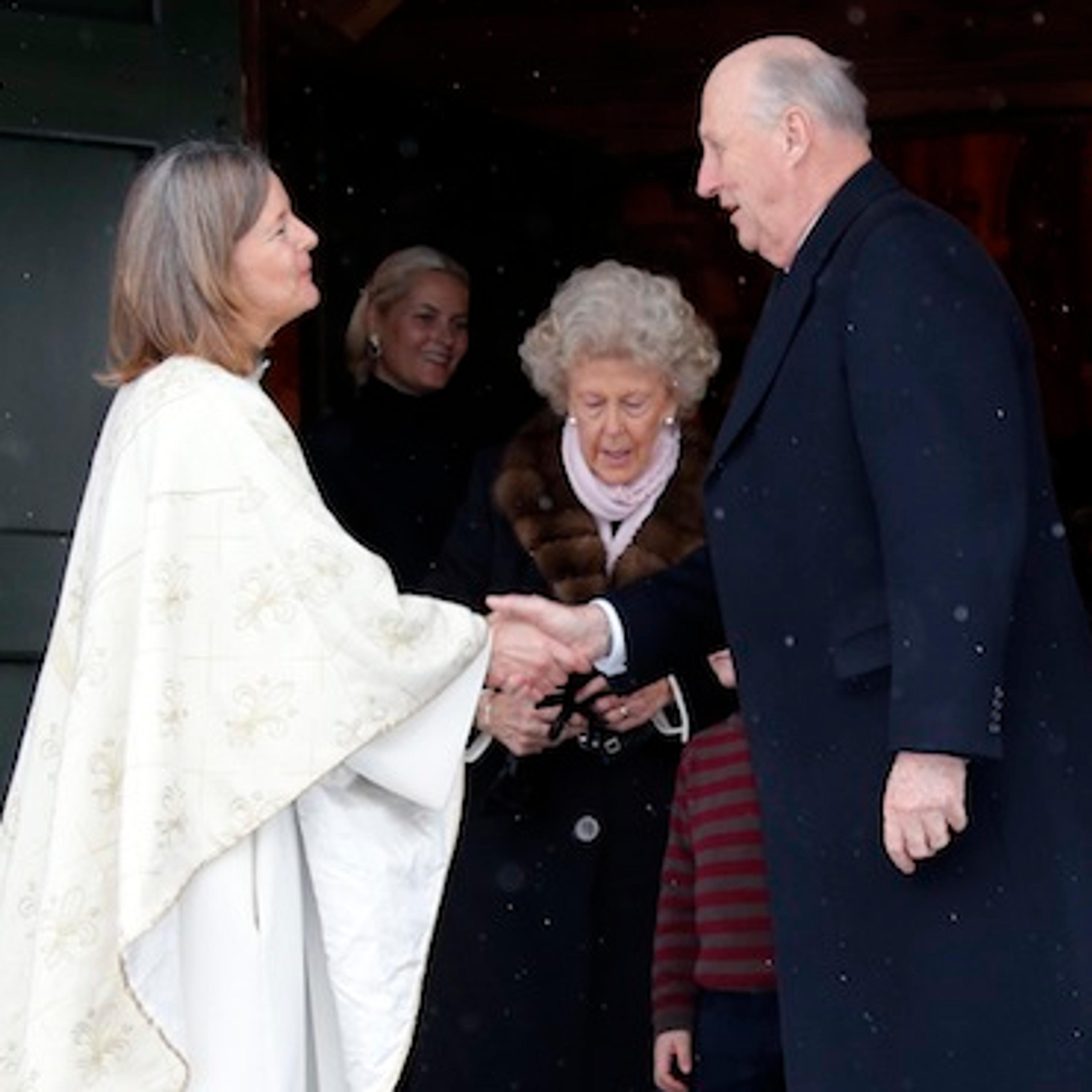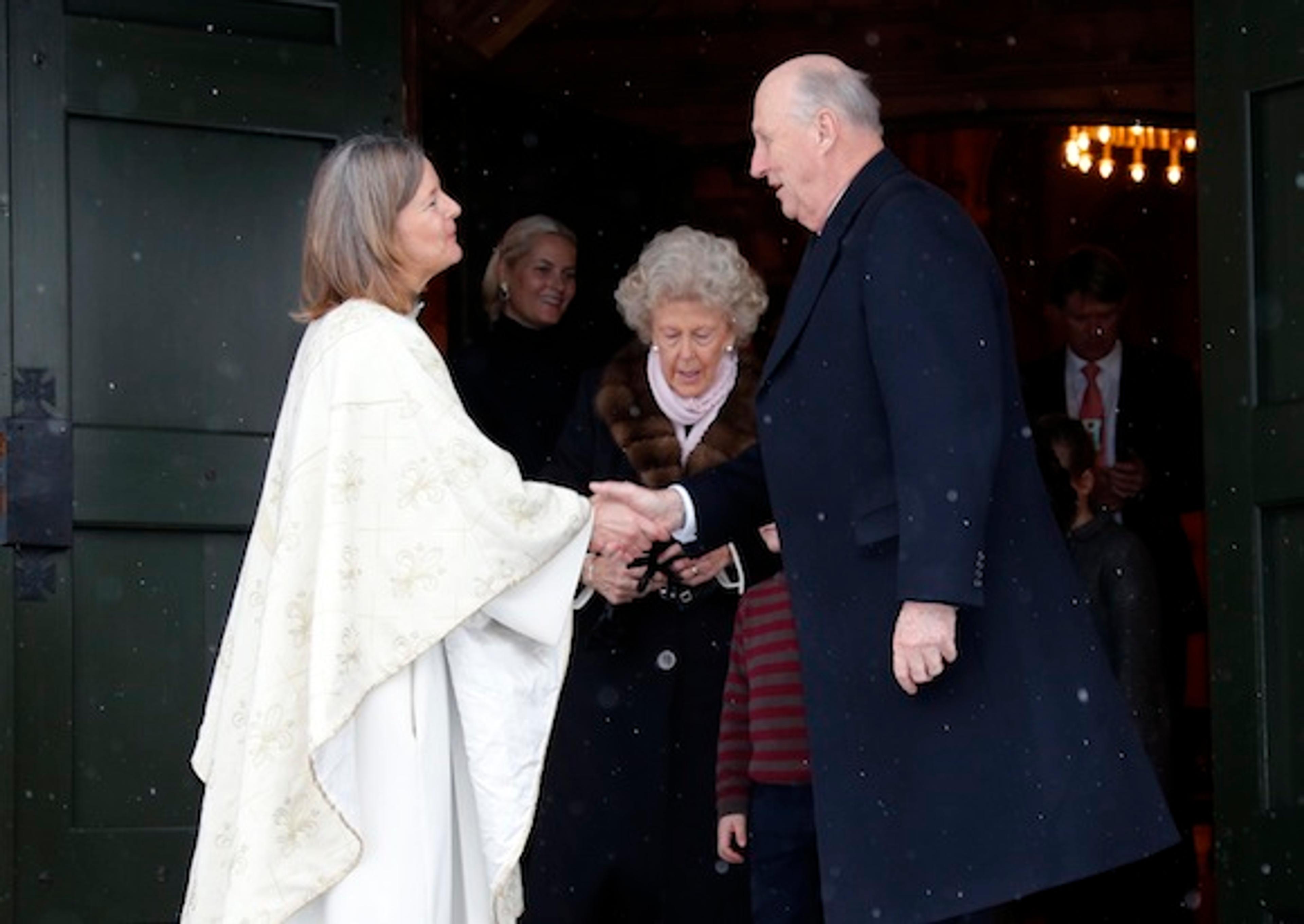 Dei kongelege vart mottekne på kyrkjetrappa av forrettande prest Marit Skjeggestad, som også følgde Kongefamilien inn i kapellet. Det er tradisjon at Kongefamilien er til stades ved gudstenesta i Holmenkollen kapell 1. juledag når dei er på Kongssetra i jula.