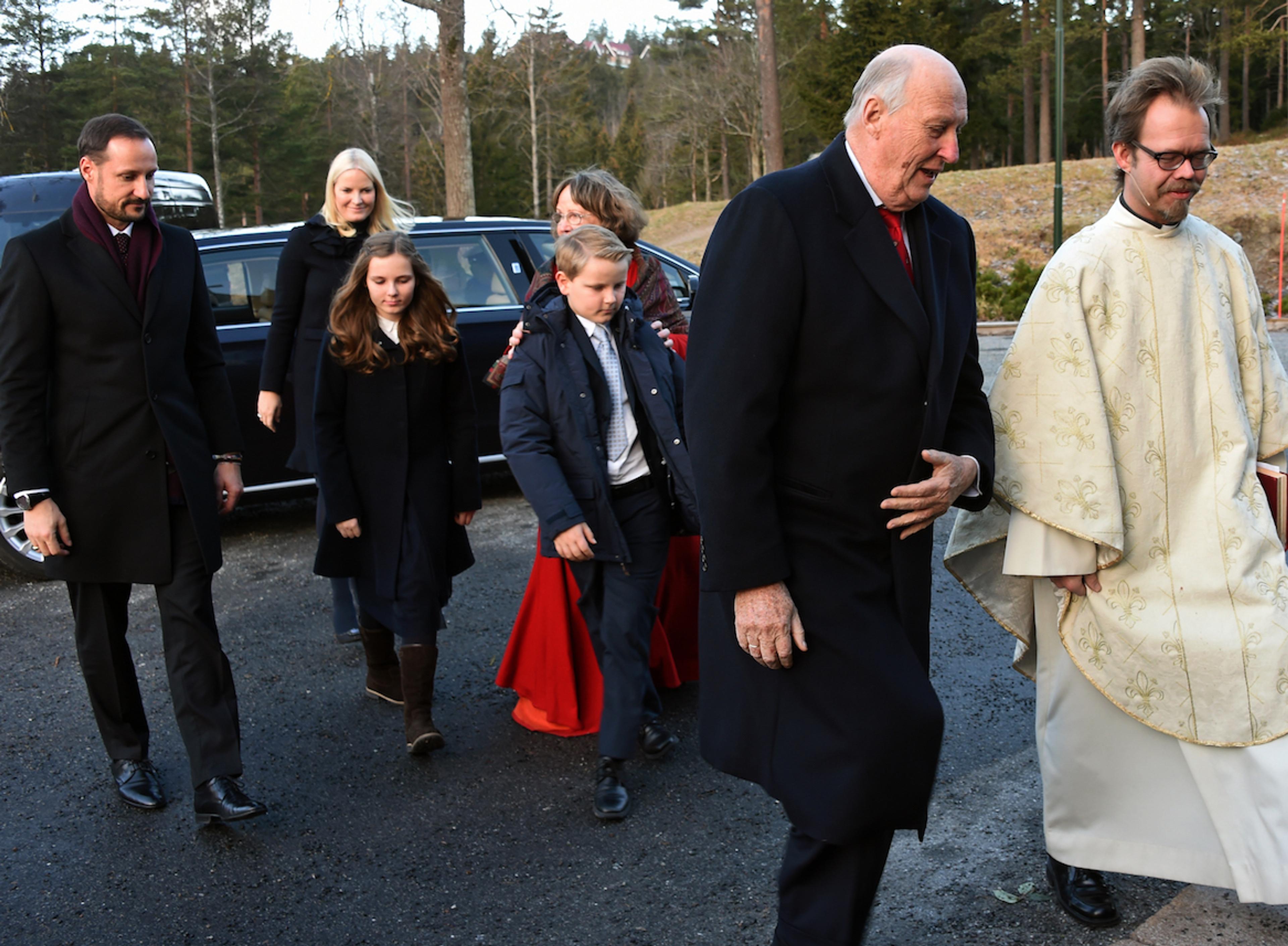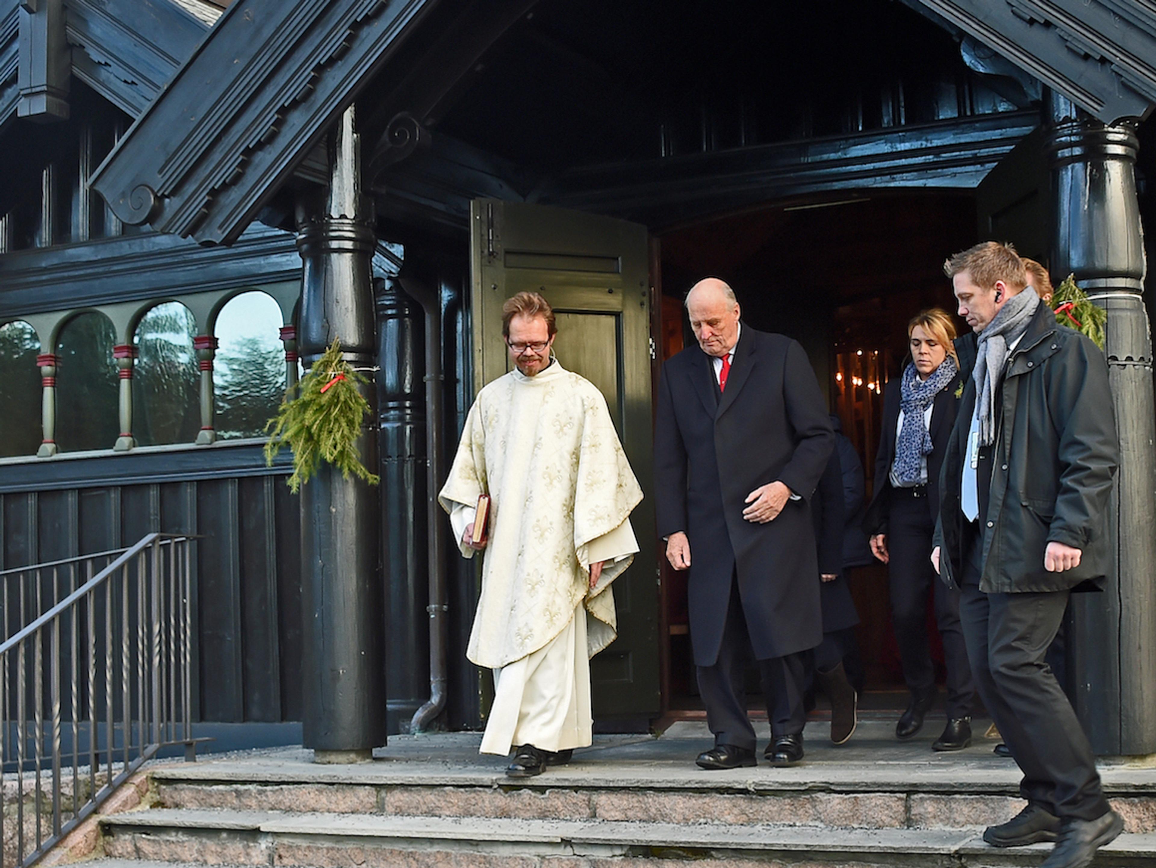 Tradisjonen tru var Kongefamilien til stades ved førstejuledagsgudstenesta i Holmenkollen i dag. Hennar Majestet Dronninga måtte melde avbod på grunn av ei forkjøling.