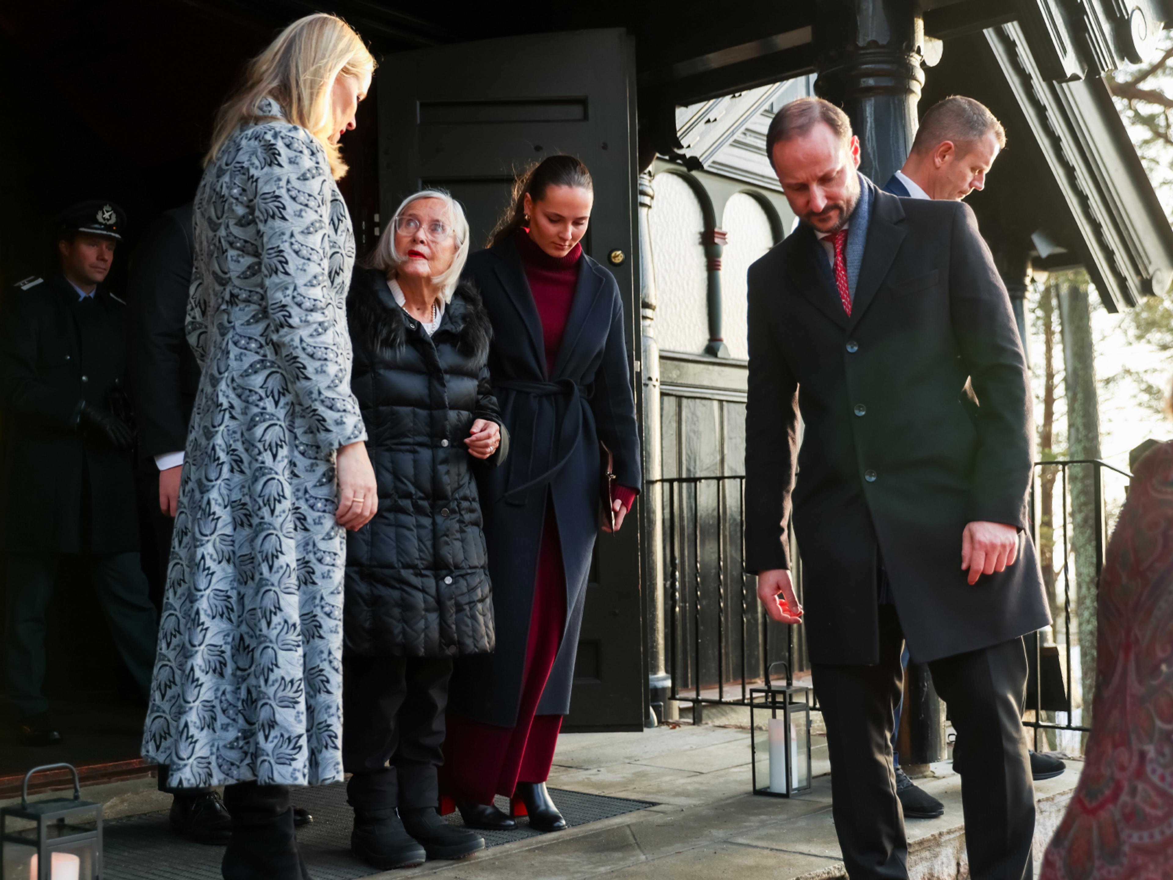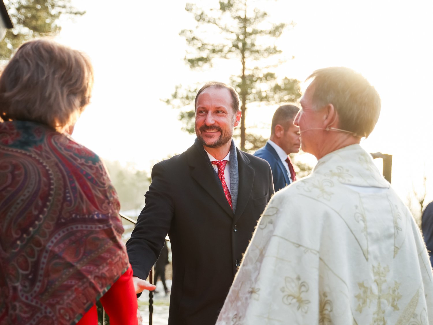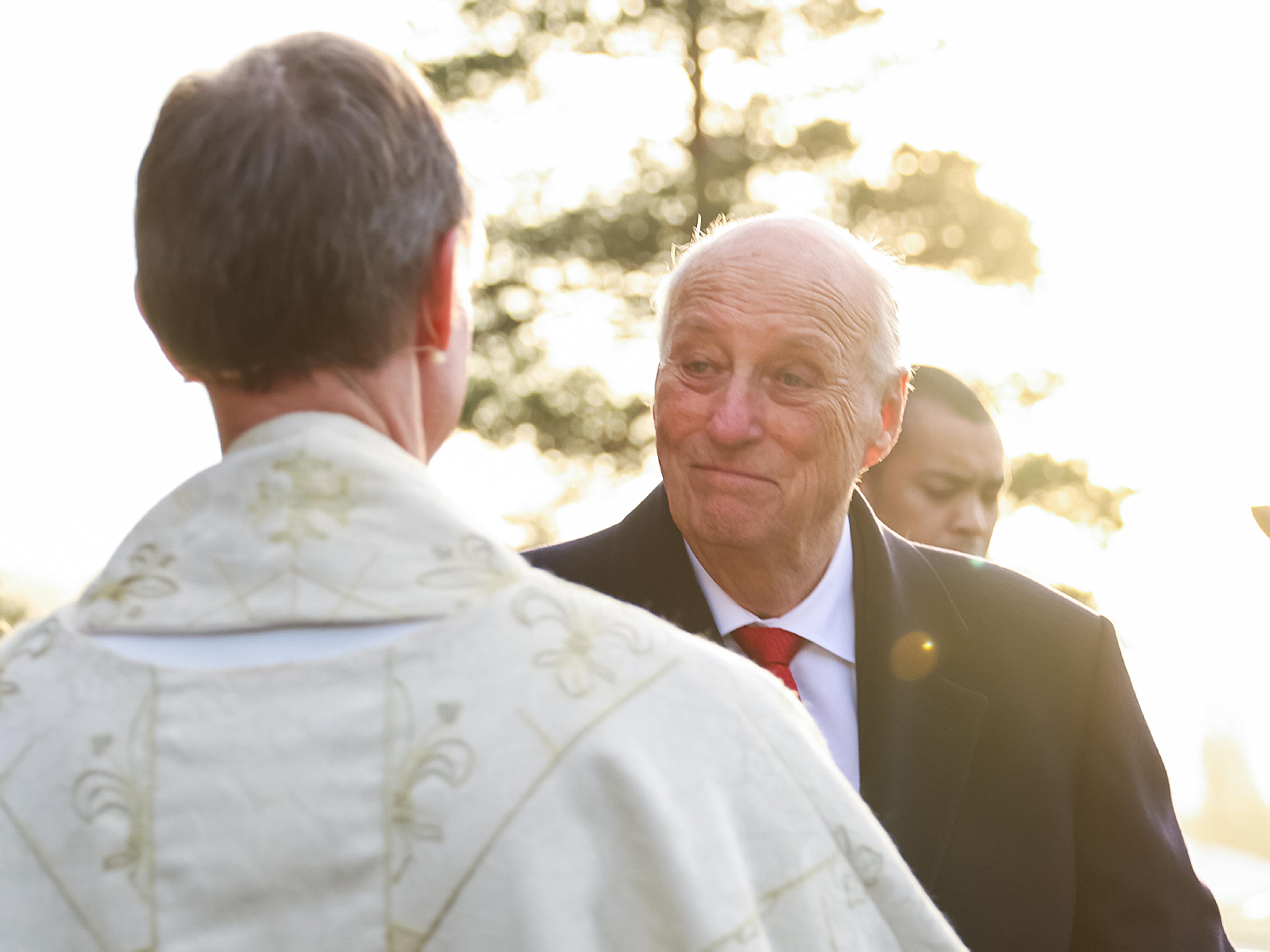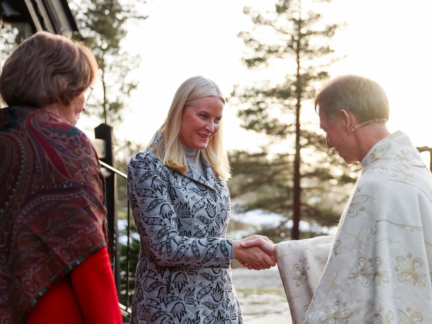 Sogneprest Paul Erik Wirgenes og tekstleser Inger Merete Magnus tok imot Kongefamilien da de ankom kapellet i Holmenkollen. "Å kom nå med lovsang" var dagens inngangssalme.