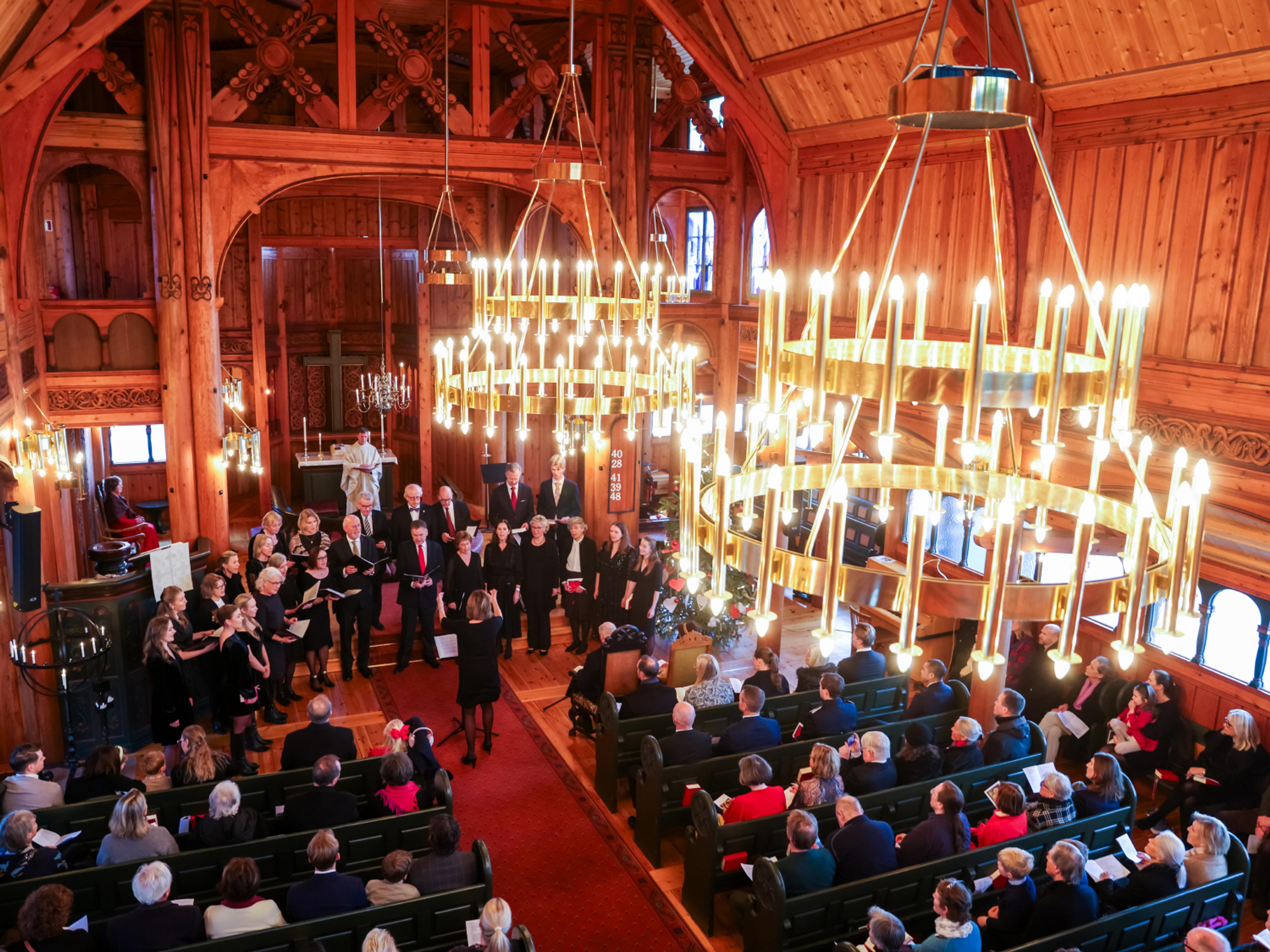 Holmenkollen kammerkor er viktige bidragsytere, og menigheten stemte i med både "Jeg synger julekvad" og "Høyr, kor englar syng frå sky"