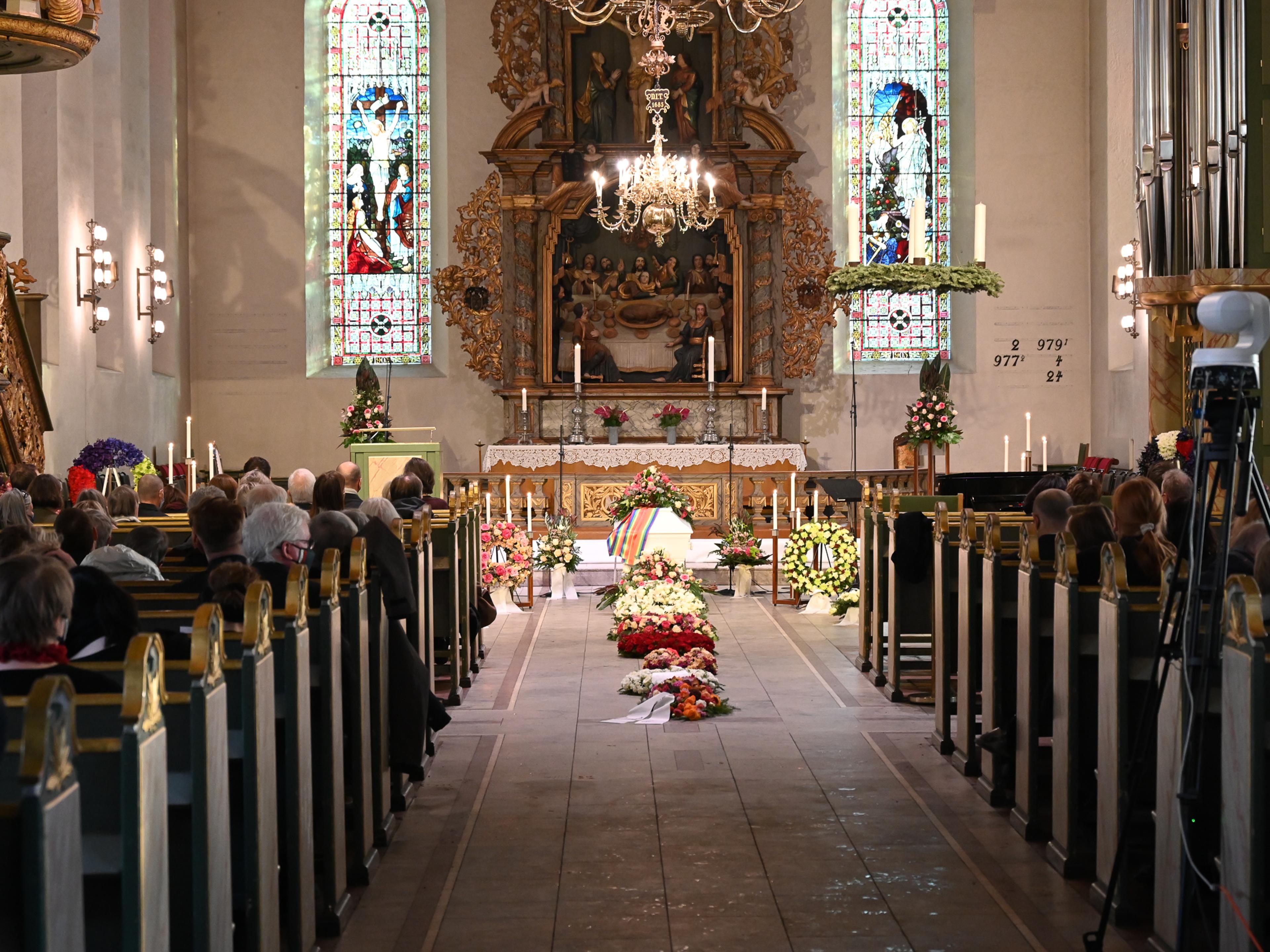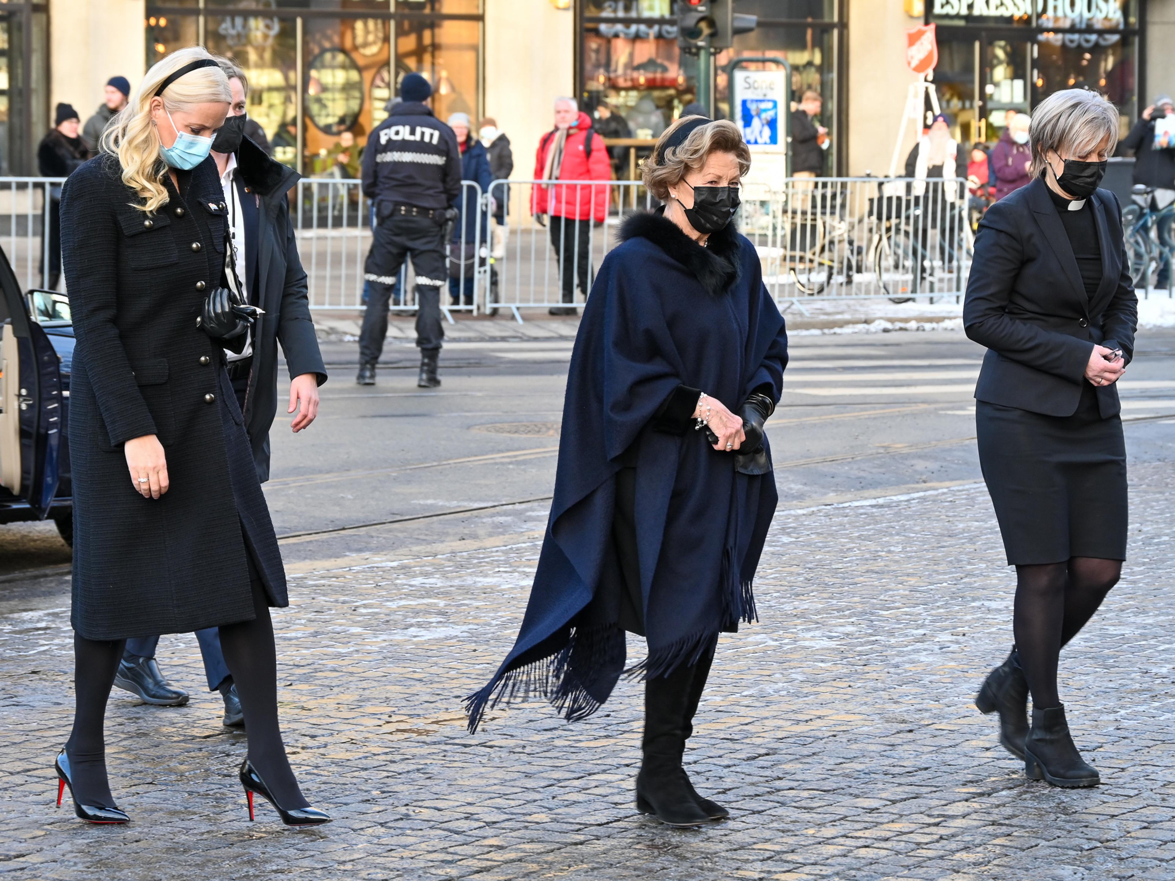 Hennar Majestet Dronninga og Den Høgvørde Kronprinsessa var i dag til stades da pioneren og forfattaren Karen-Christine (Kim) Friele vart bisett frå Oslo domkyrkje.