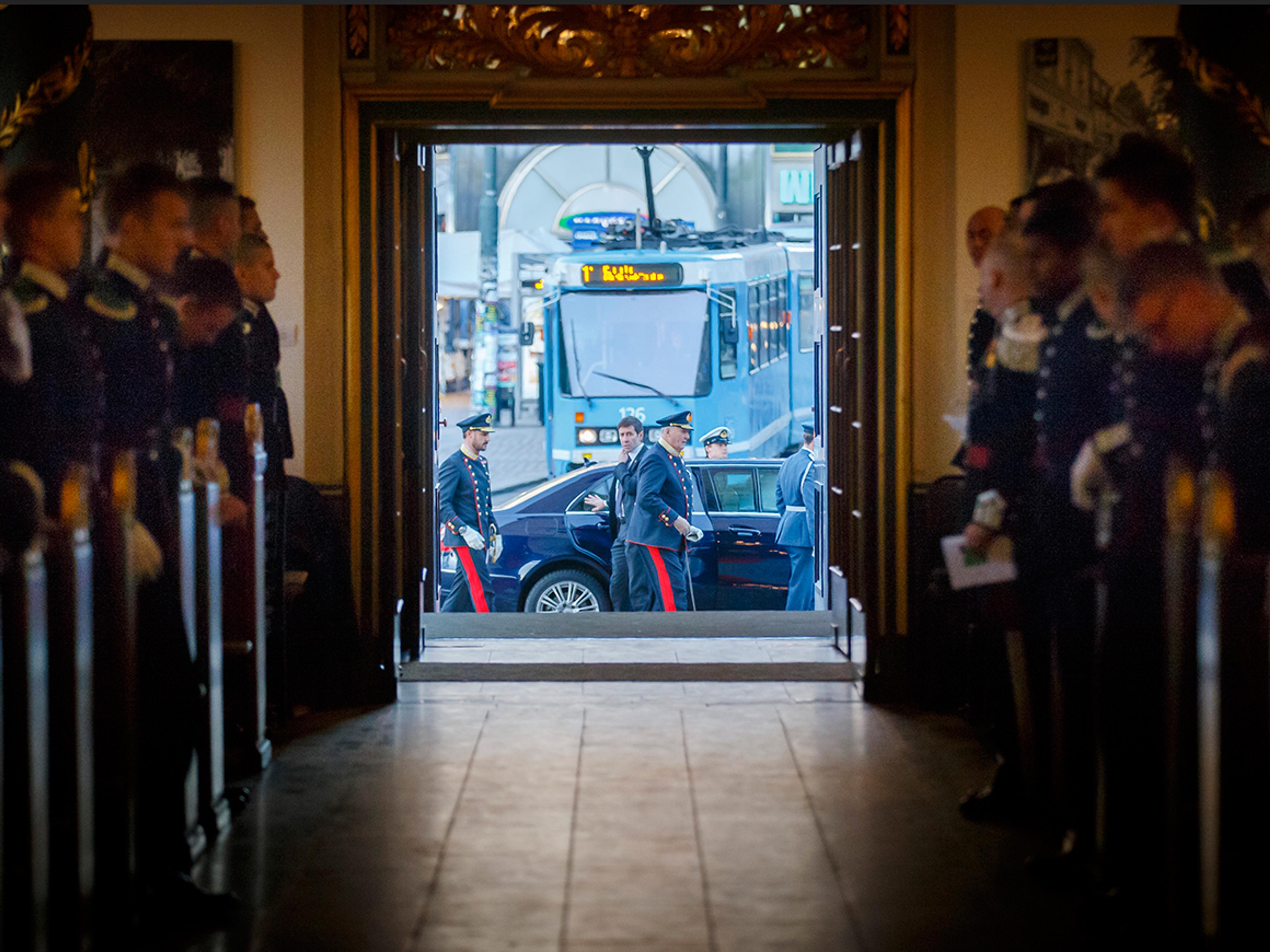 Kong Harald og Kronprins Haakon ble tatt i mot av domprost Anne-May Grasaas, Gardesjef oberstløytnant Jan Fredrik Geiner og gardeprest major Kenneth Henriksen.