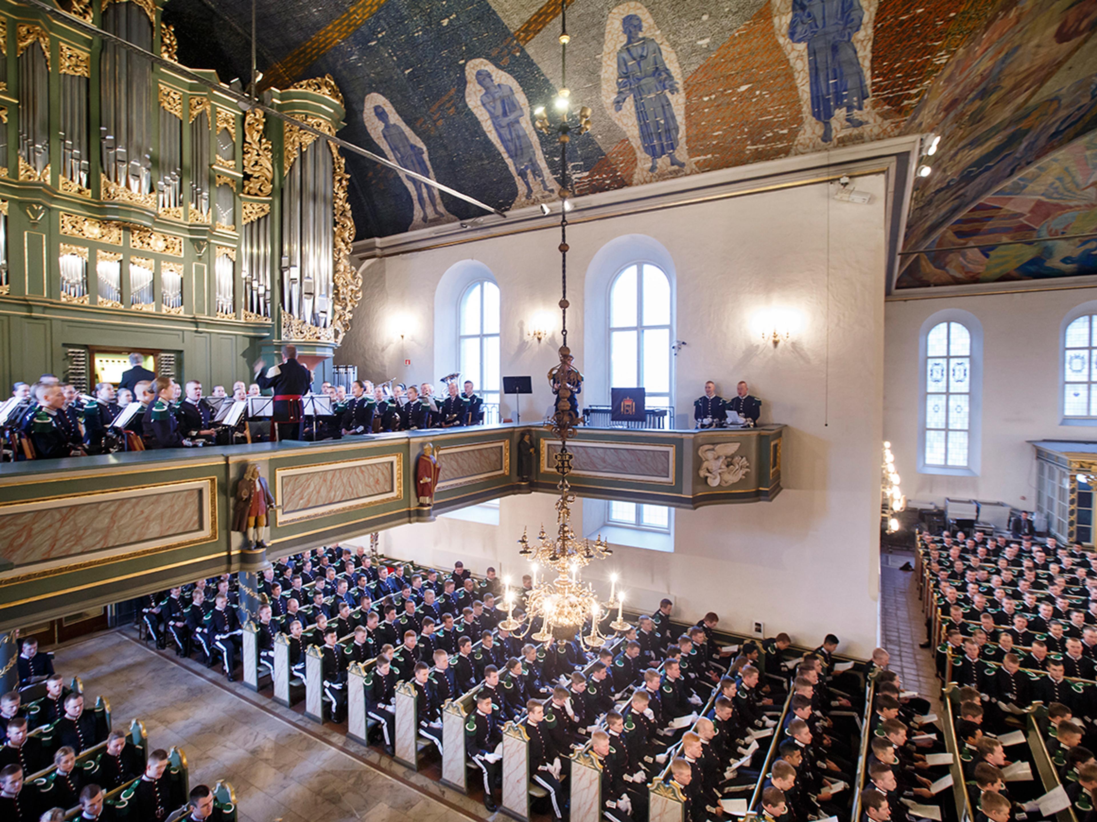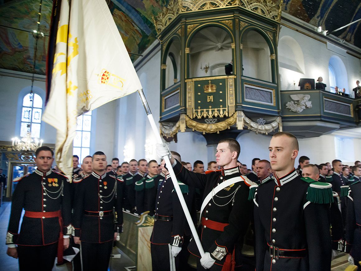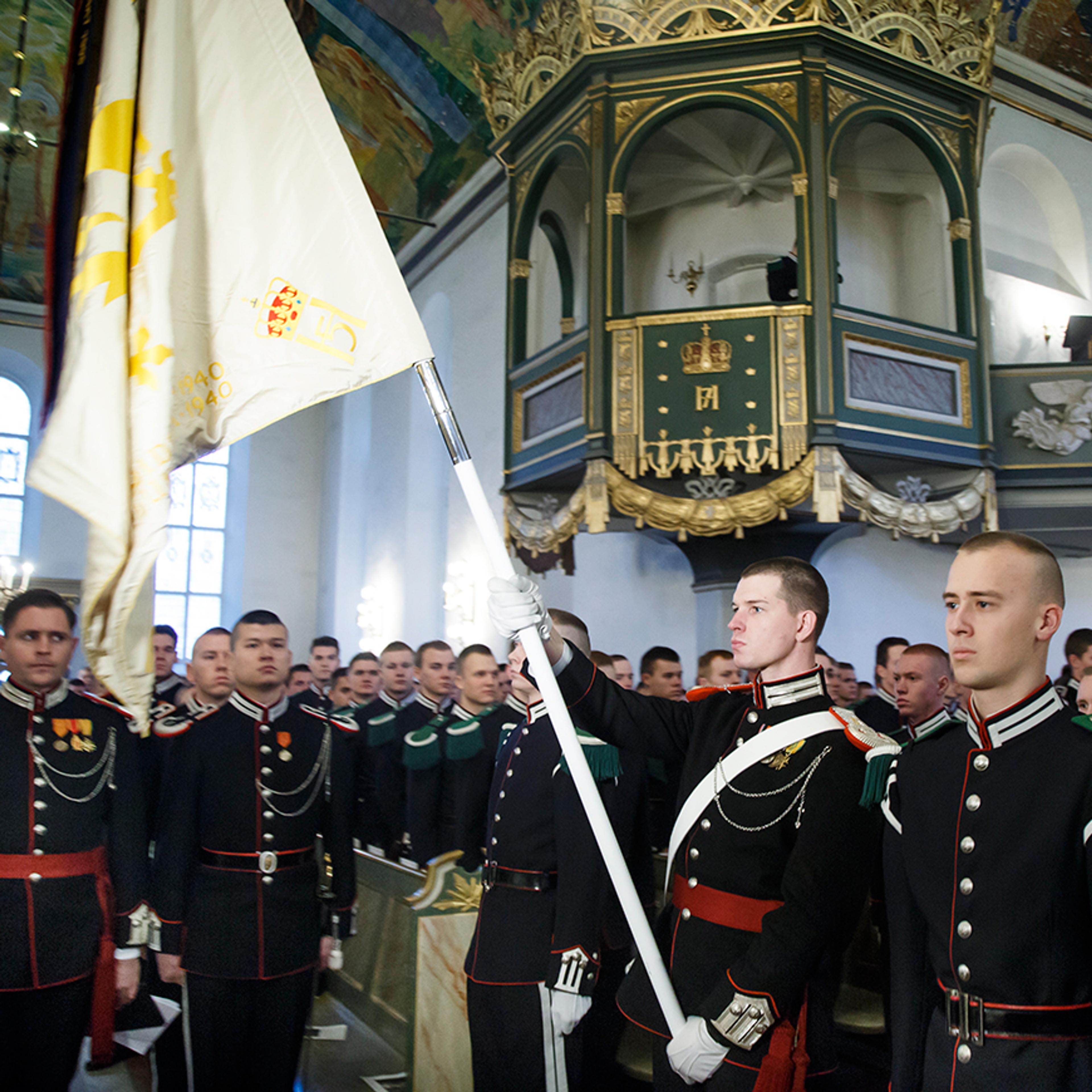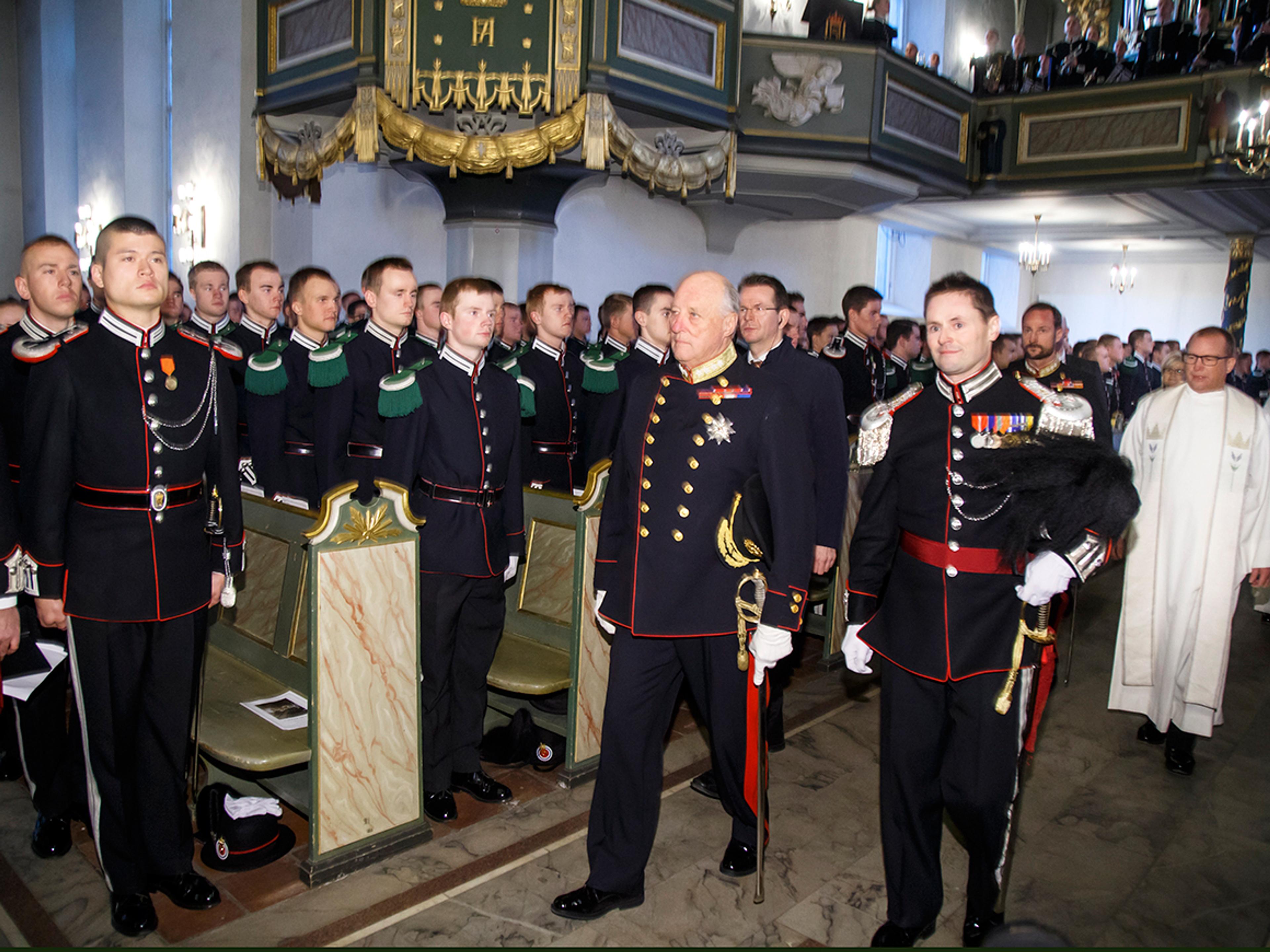 Den tradisjonsrike kirkeparaden er en del av Gardens førjulsmarkering for befal og ansatte, og for gardistene som er inne til førstegangstjeneste. Gardesjef, oberstløytnant Geir Pettersen ledsaget Kong Harald og Kronprins Haakon inn i domkirken, før fanen ble ført frem.