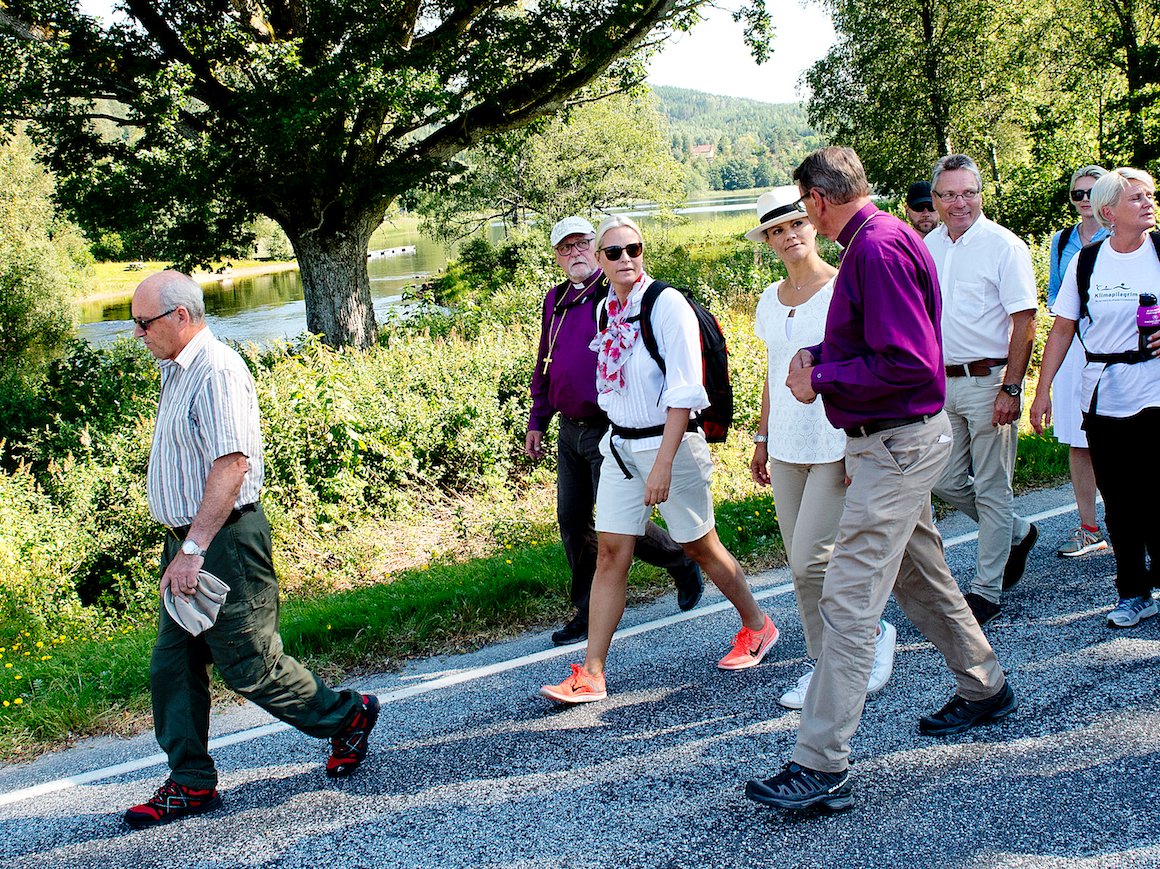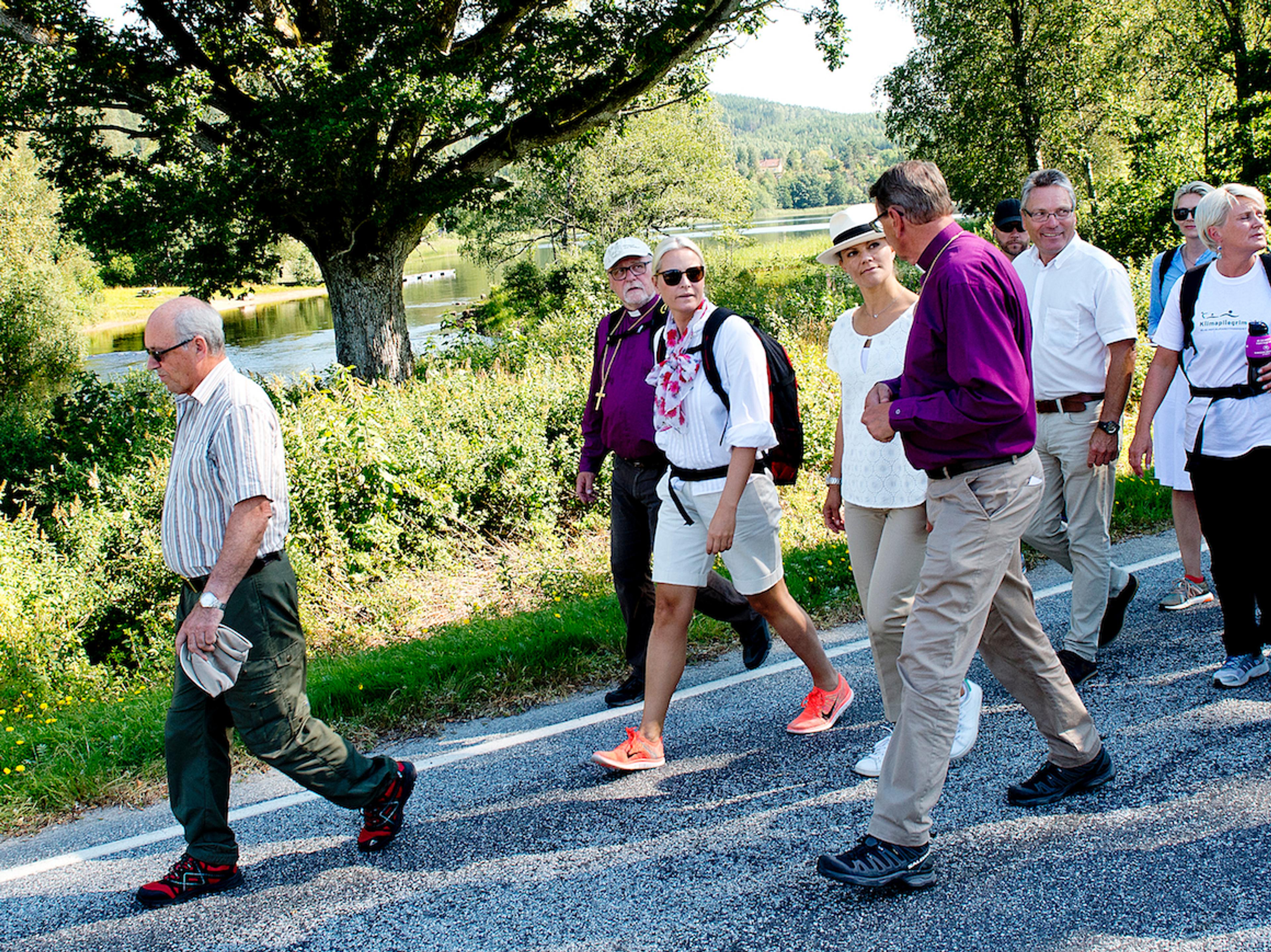 Vandringene utgjør en stafett som strekker seg helt til Paris, og i dag var tiden kommet til å passere grensen til Sverige. De to Kronprinsessene gikk Klimapilegrim i Haldenområdet, og startet etter en markering i Søndre Enningdalen kirke. Sammen med biskopen i Borg, Atle Sommerfeldt, og biskop Per Eckerdal fra Gøteborgs stift, la Kronprinsesse Victoria og Kronprinsesse Mette-Marit i vei mot Sverige.