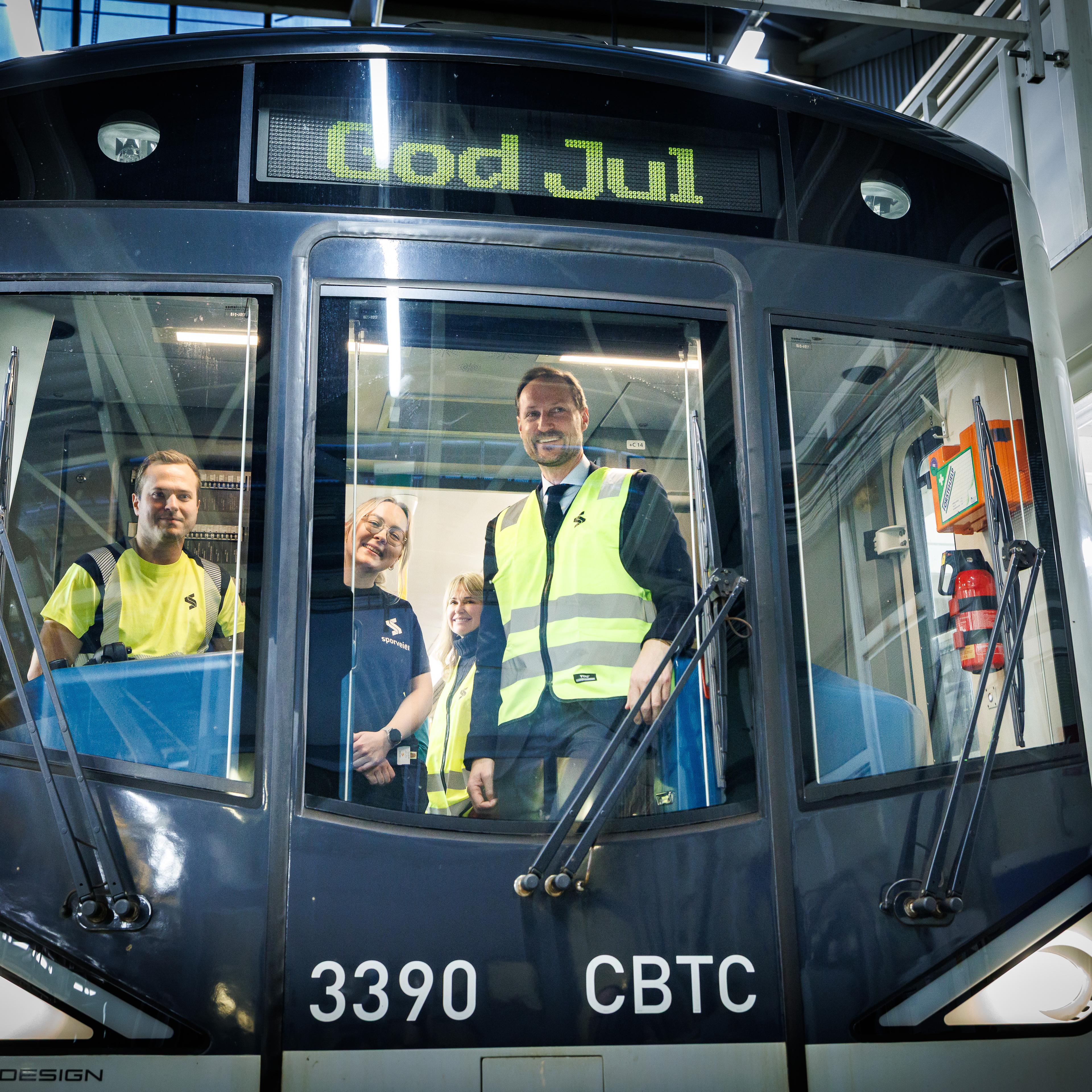 Hans Kongelige Høyhet Kronprins Haakon markerte jubileet ved å besøke de ansatte som holder hjulene i gang på vei og skinner. Først møtte han ansatte ved verkstedet på Ryen der t-banevogner vedlikeholdes, repareres og oppgraderes.