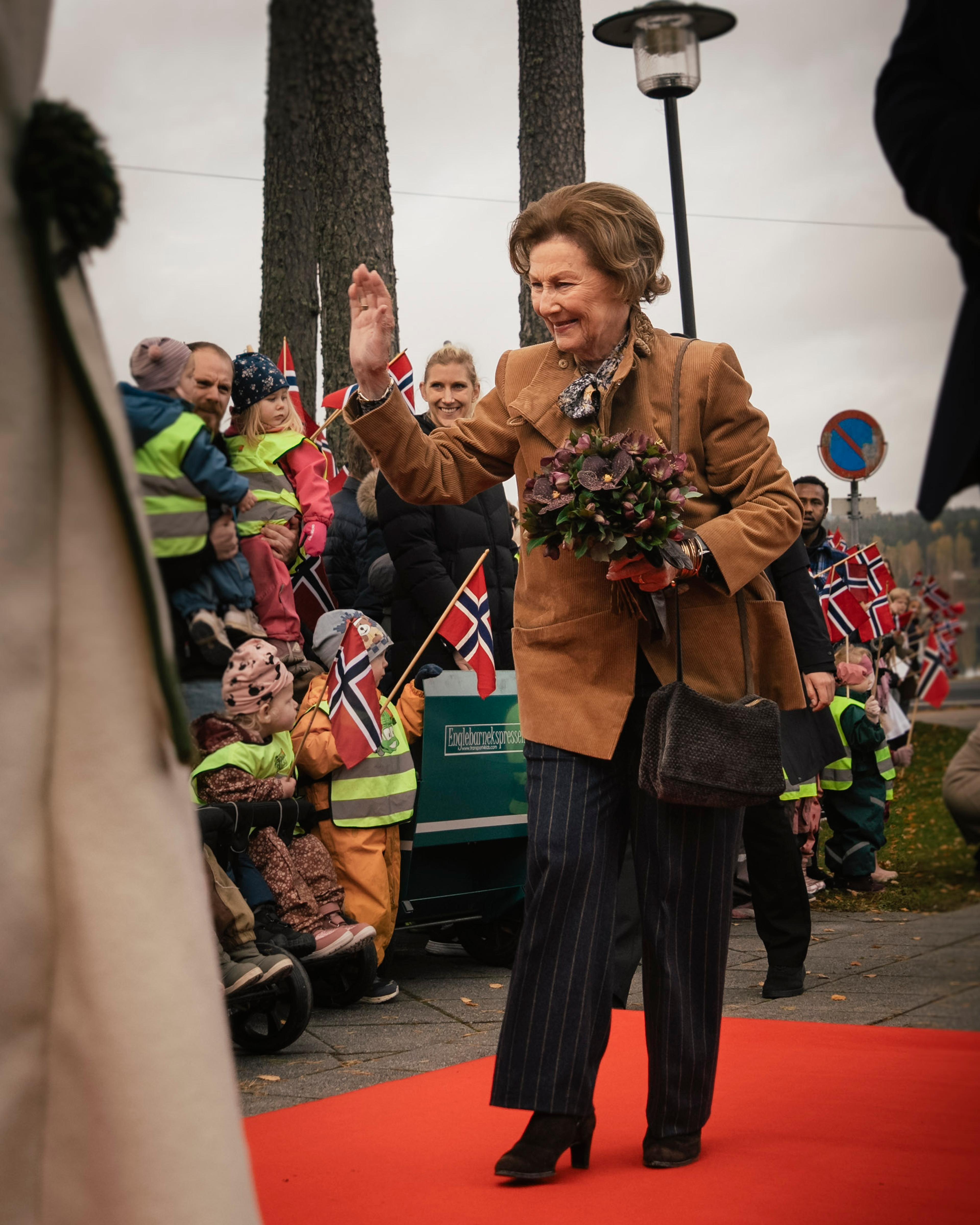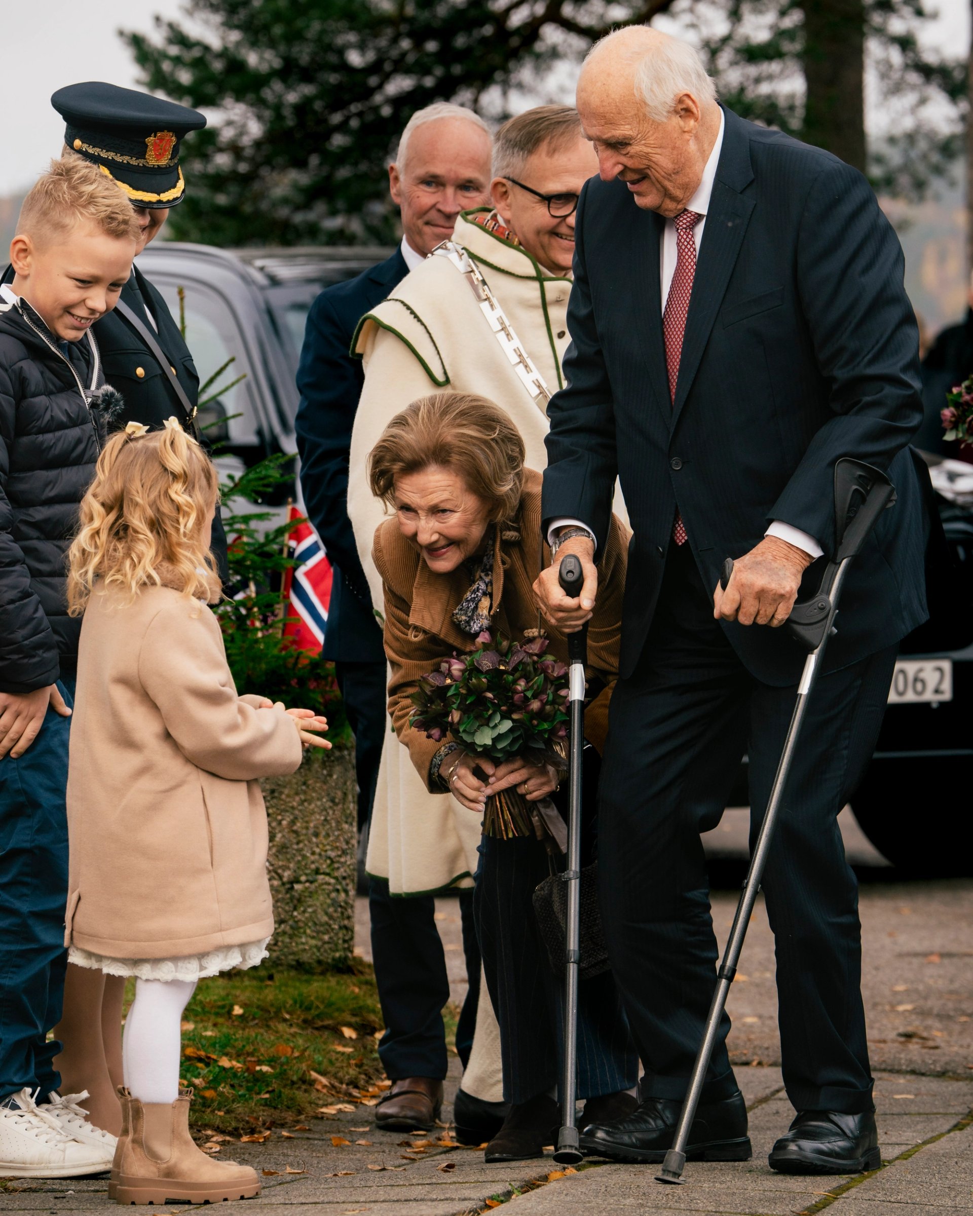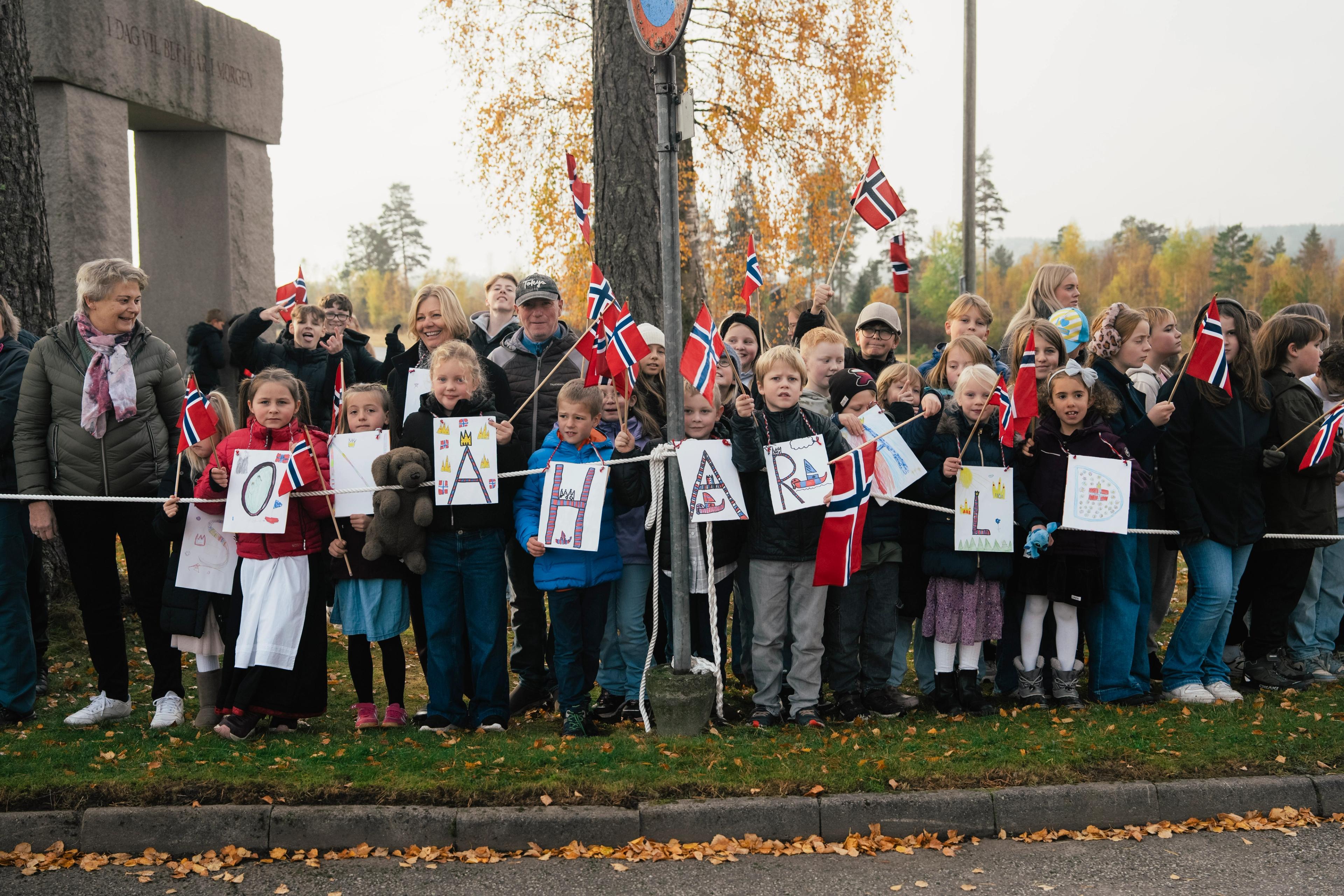 Utenfor Furulund Allbrukshus ble Kongeparet ønsket varmt velkommen av barnehagebarn og andre innbyggere i Aremark i Østfold. Kommunen, som ligger ved grensen til Sverige, har rundt 1350 innbyggere.