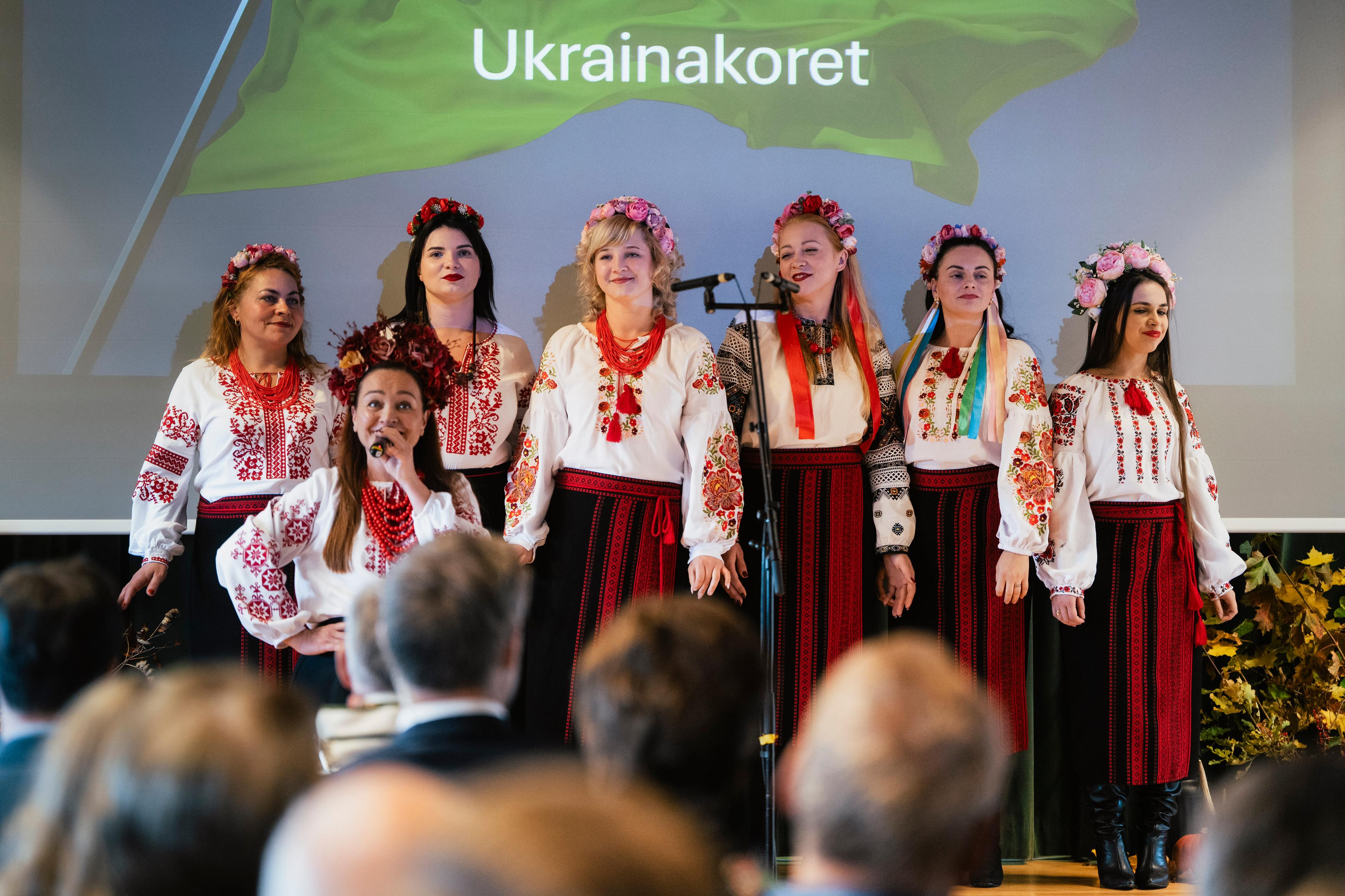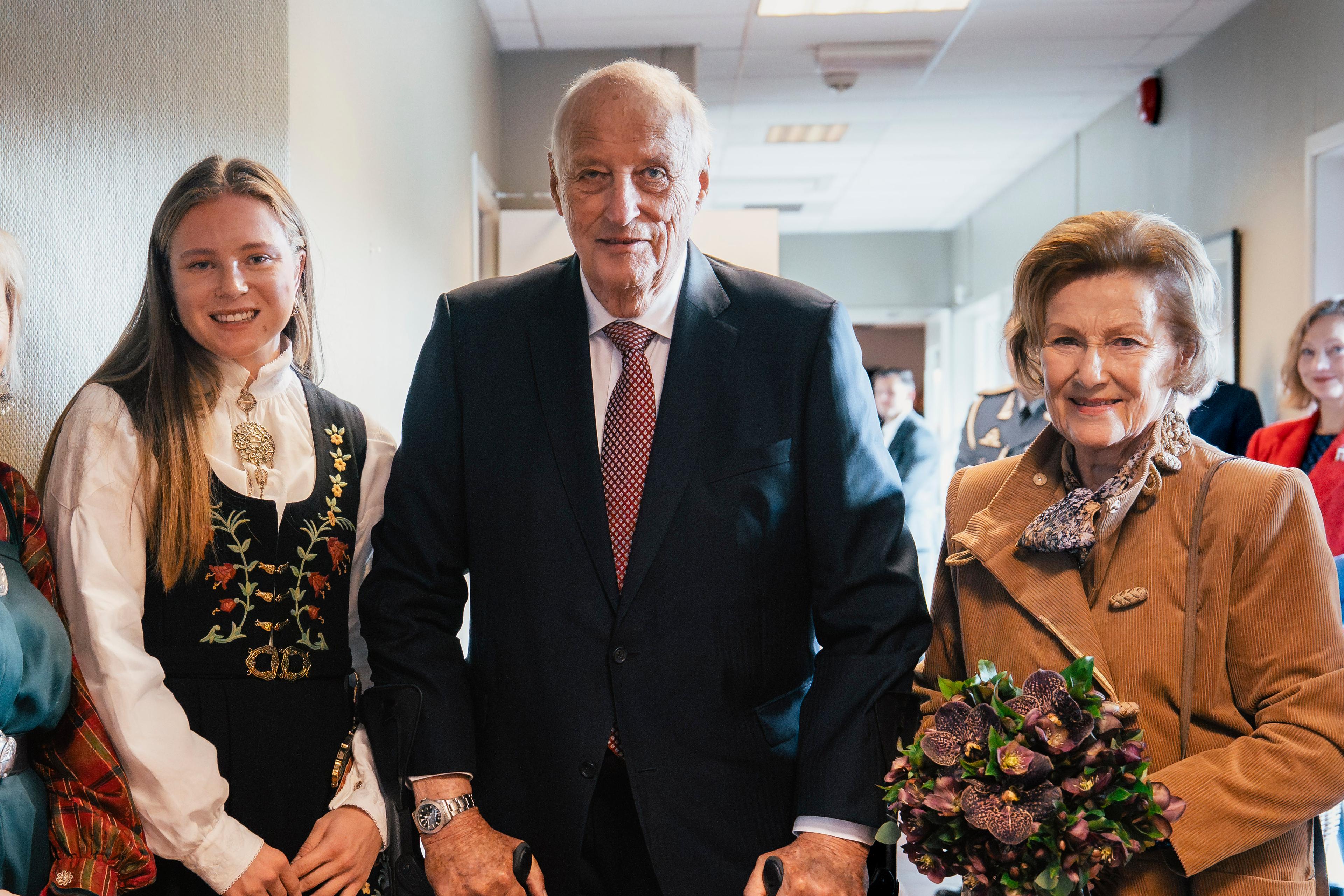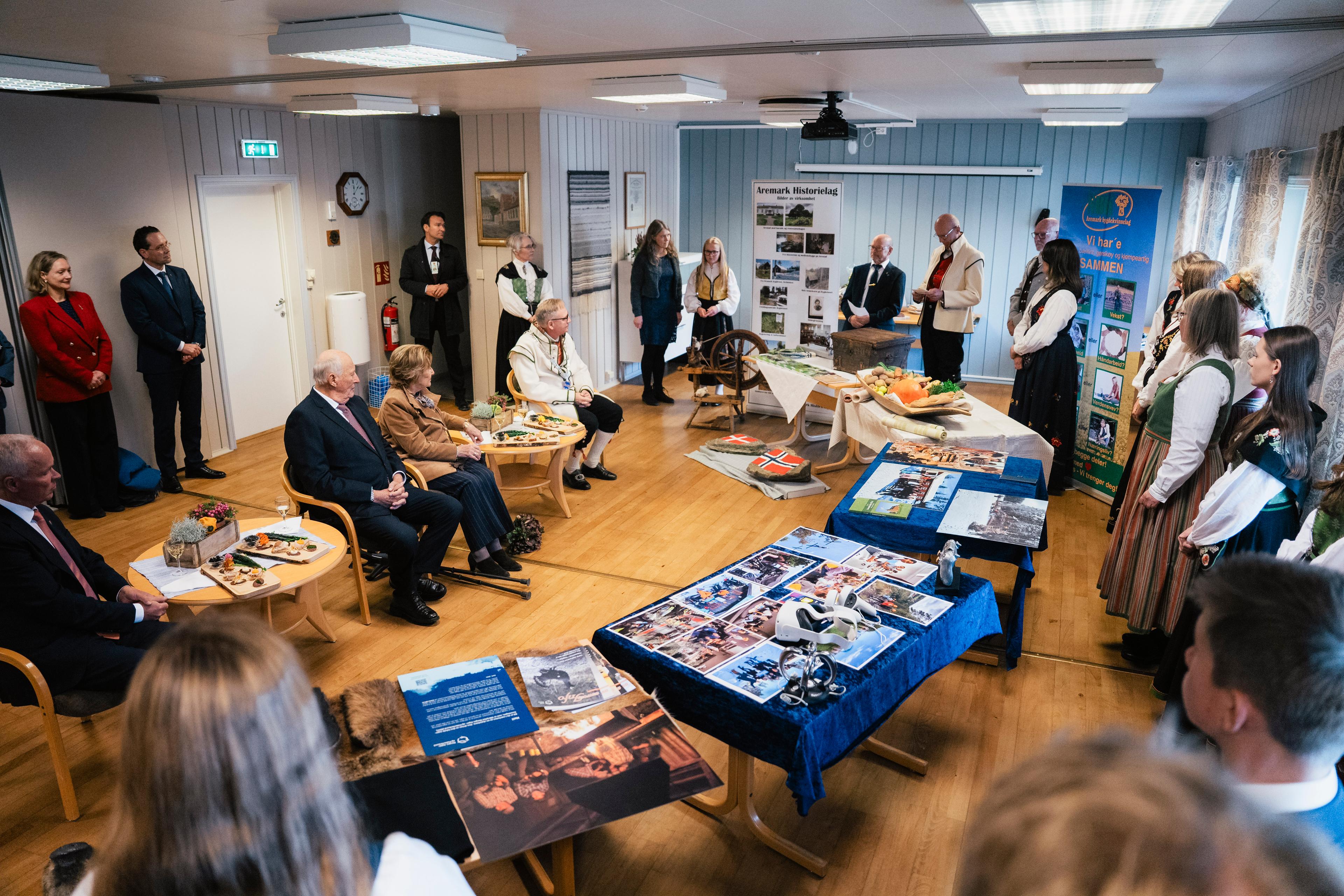 Inne i samfunnshuset fikk Kongeparet høre mer om kommunens historie og satsingsområder. Ordfører Håkon Tolsby ønsket velkommen og det ble fremført flere musikalske innslag, blant annet ved kommunenes eget Ukraina-kor og elever fra kulturskolen.