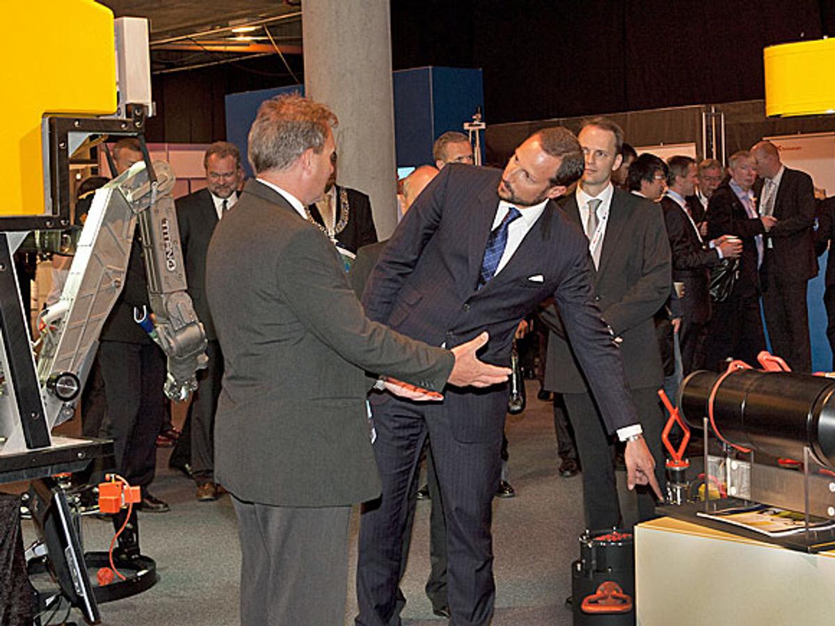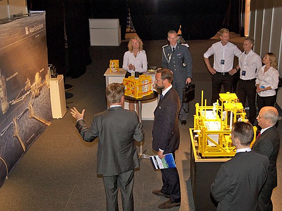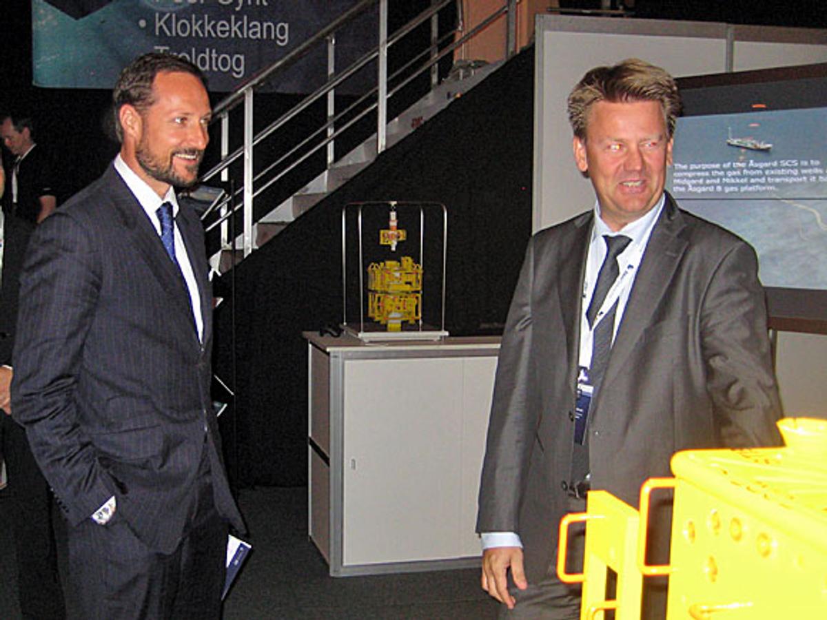 Etter å ha hørt energianalytiker Jarand Rystad holde et foredrag om markedsutsiktene for sektoren, fikk Kronprinsen en omvisning i utstillingen i messelokalet ”Dovregubbens Hall”. Der fikk han blant annet se teknologi og systemer som skal gi høyere utvinningsgrad av olje- og gassreservoarer.