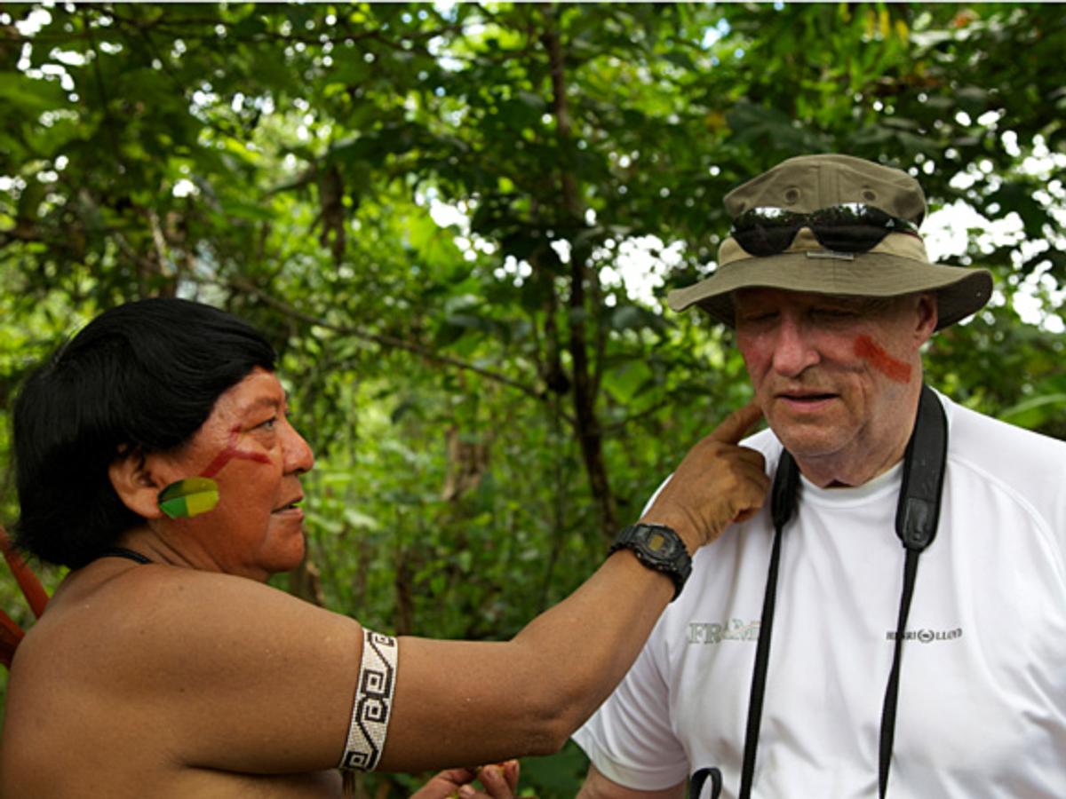 Før avreise ble Kongen dekorert med fjær fra ara-papegøyen - en særskilt æresbevisning. Fjærpryden festes rundt overarmen, og blir brukt av mennene i landsbyen ved spesielle anledninger.