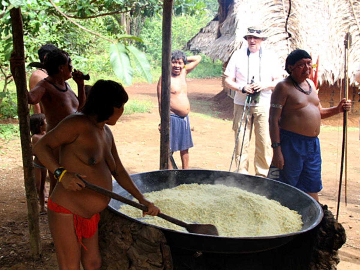 Fra mandag 22. til torsdag 25. april levde Kongen sammen med yanomamiene, og fikk et unikt innblikk deres kultur og levesett. Indianerne lever av jakt og fiske, samt det de kan sanke i skogen eller dyrke i hagene sine. Kong Harald tok del i deres tradisjonelle kosthold, og fikk servert både villsvin og villkalkun i tillegg til viltvoksende palmefrukter og rotfrukter fra kjøkkenhagene.