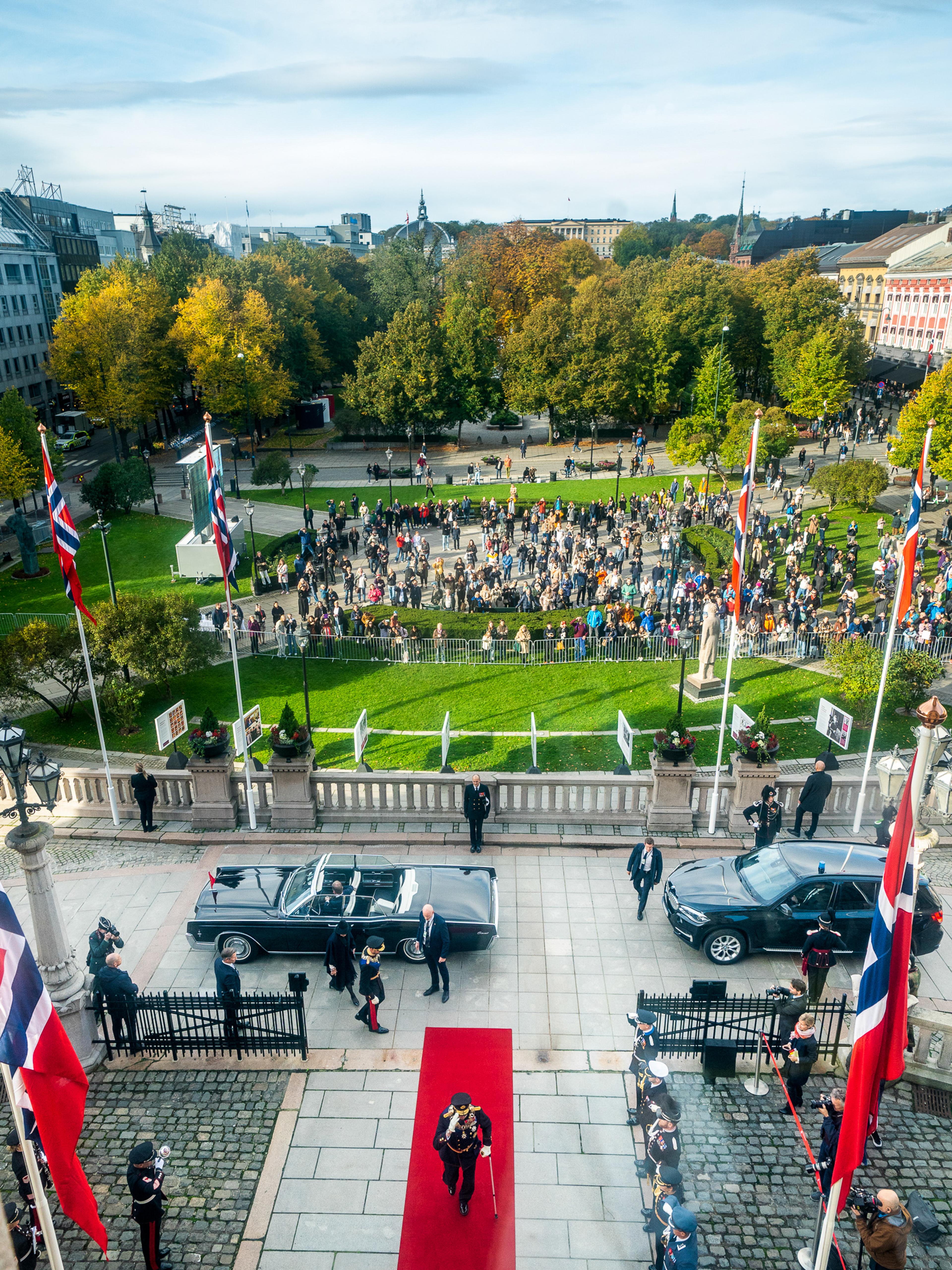 Kongeparet kom til Stortinget i open bil frå Slottet. Langs Karl Johans gate paraderte soldatar frå alle forsvarsgreinene for Kongen og Dronninga.