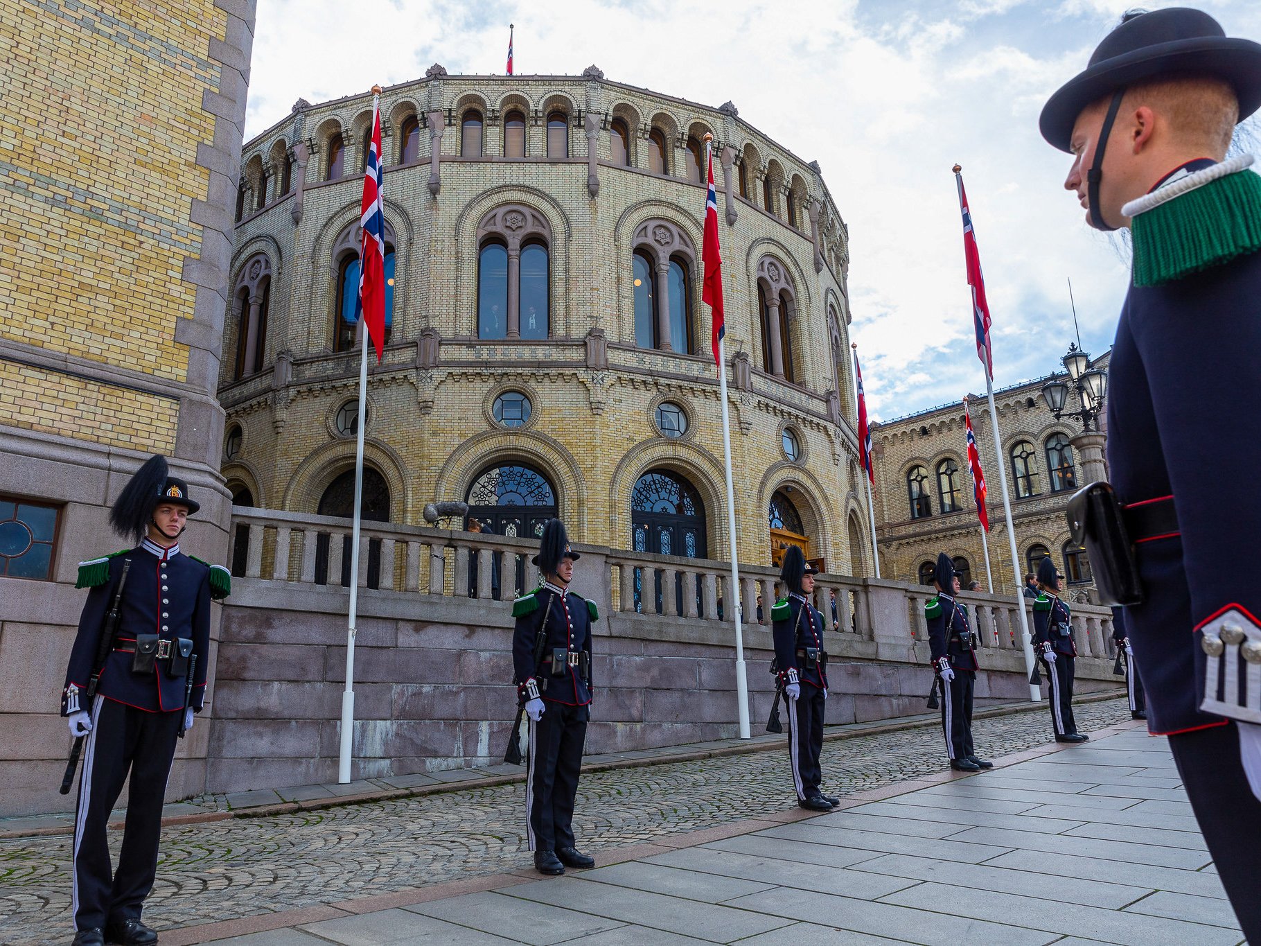 På Stortinget vart Kongeparet og Kronprinsen mottekne av ein deputasjon leidd av stortingsrepresentant Bjørnar Selnes Skjæran.