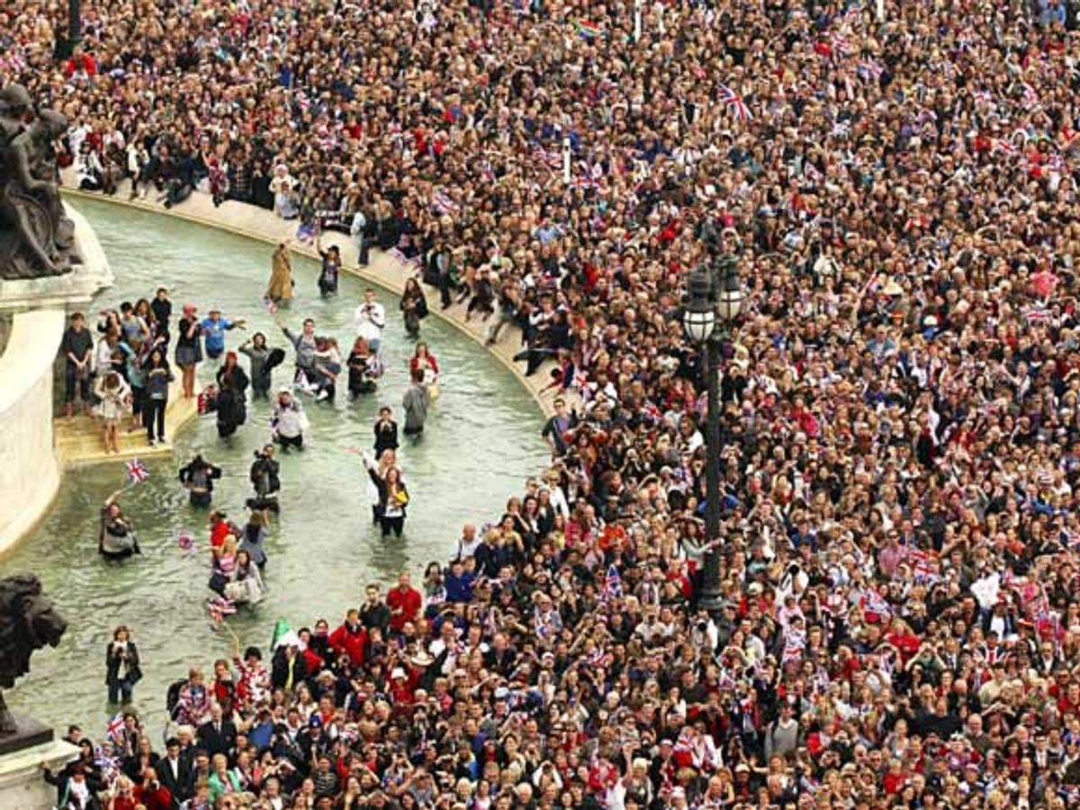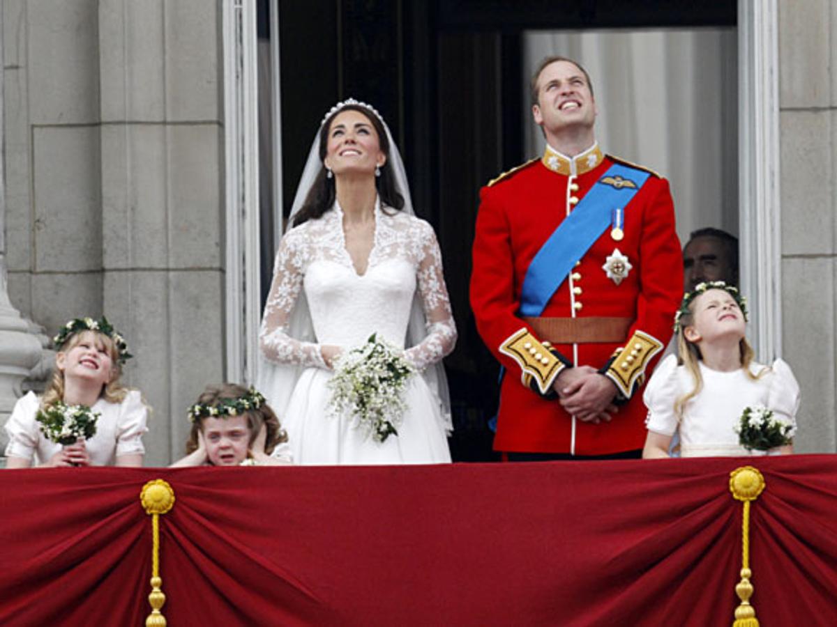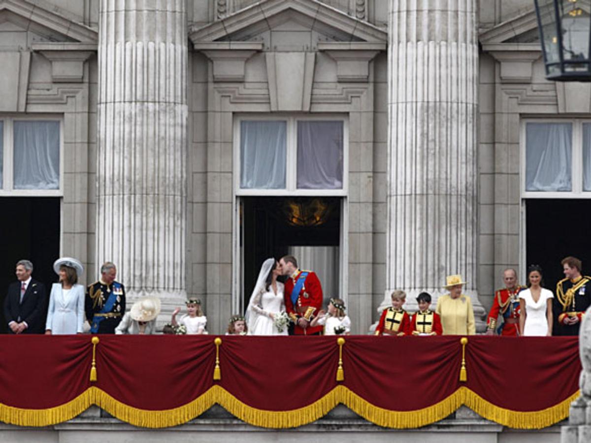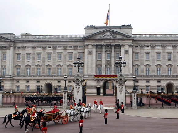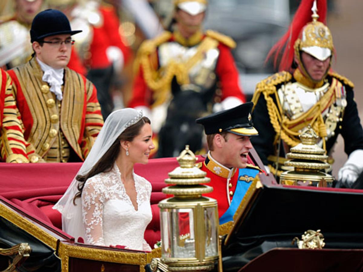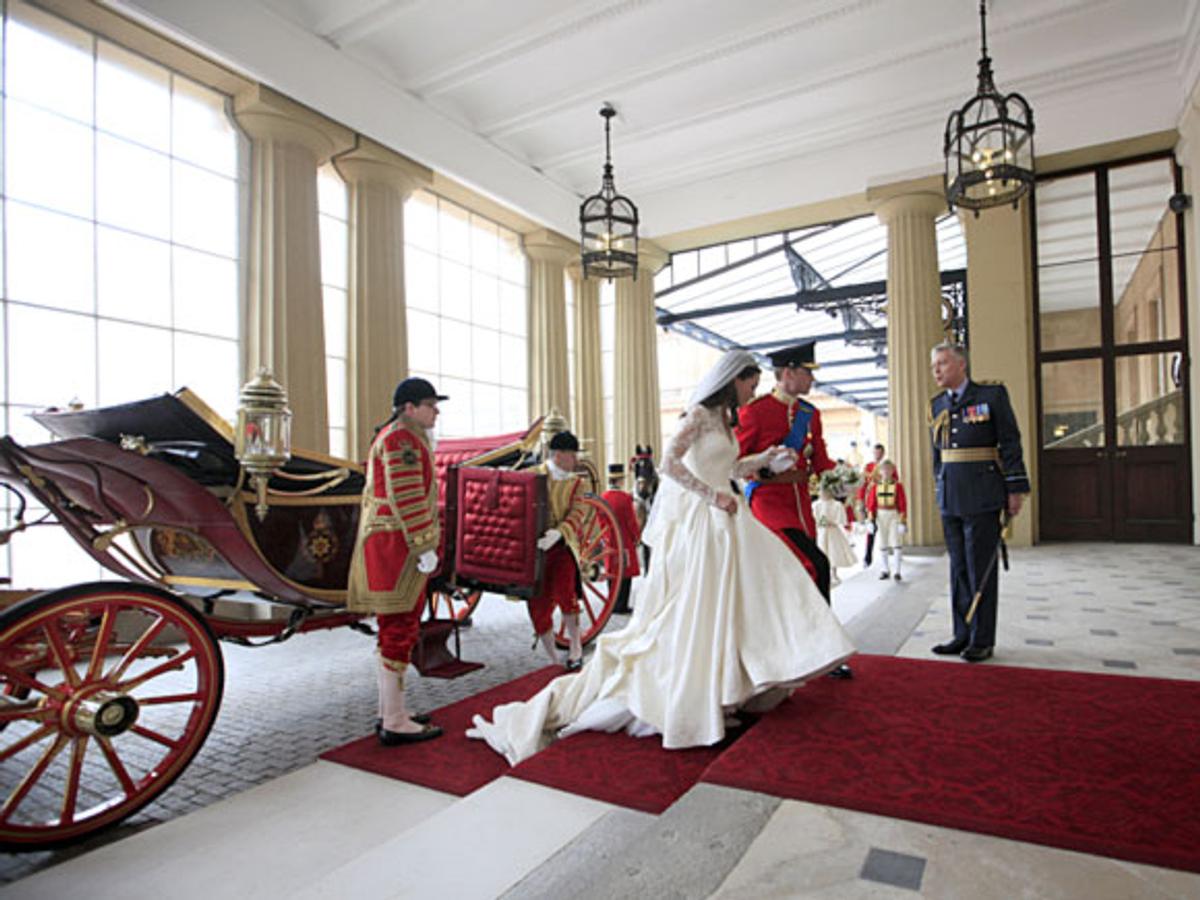 Etter seremonien i kirken kjørte brudeparet gjennom Londons gater i åpen vogn til Buckingham Palace.
