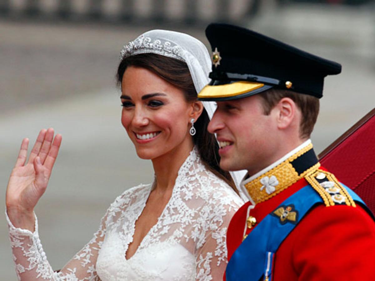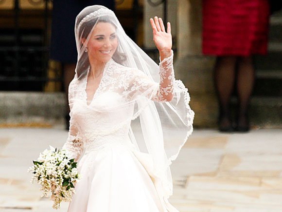Catherine Middletons brudekjole hadde blondeliv, innsvinget midje, lange armer og utringning. Den er designet av Sarah Burton. Bruden bar et slør med Dronning Elizabeths diadem som hun fikk av sine foreldre – Kong Georg VI og Dronning Elizabeth - på 18-årsdagen. Diademet ble laget for Dronningens mor i 1936. Brudekjolen er elfenbeinshvit og laget i engelske og franske blonder. Slepet er 2,7 meter langt.