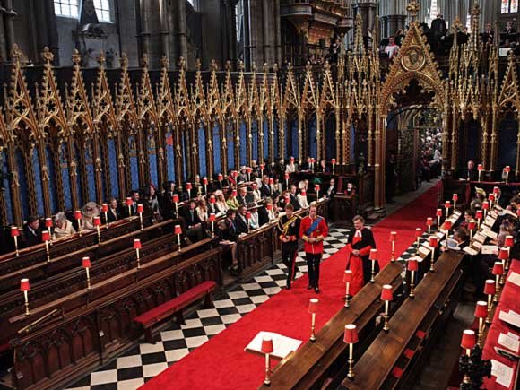Brudgommen stilte i Irish Guards´ gallauniform- der han er oberst - med den engelske Hosebåndsorden.