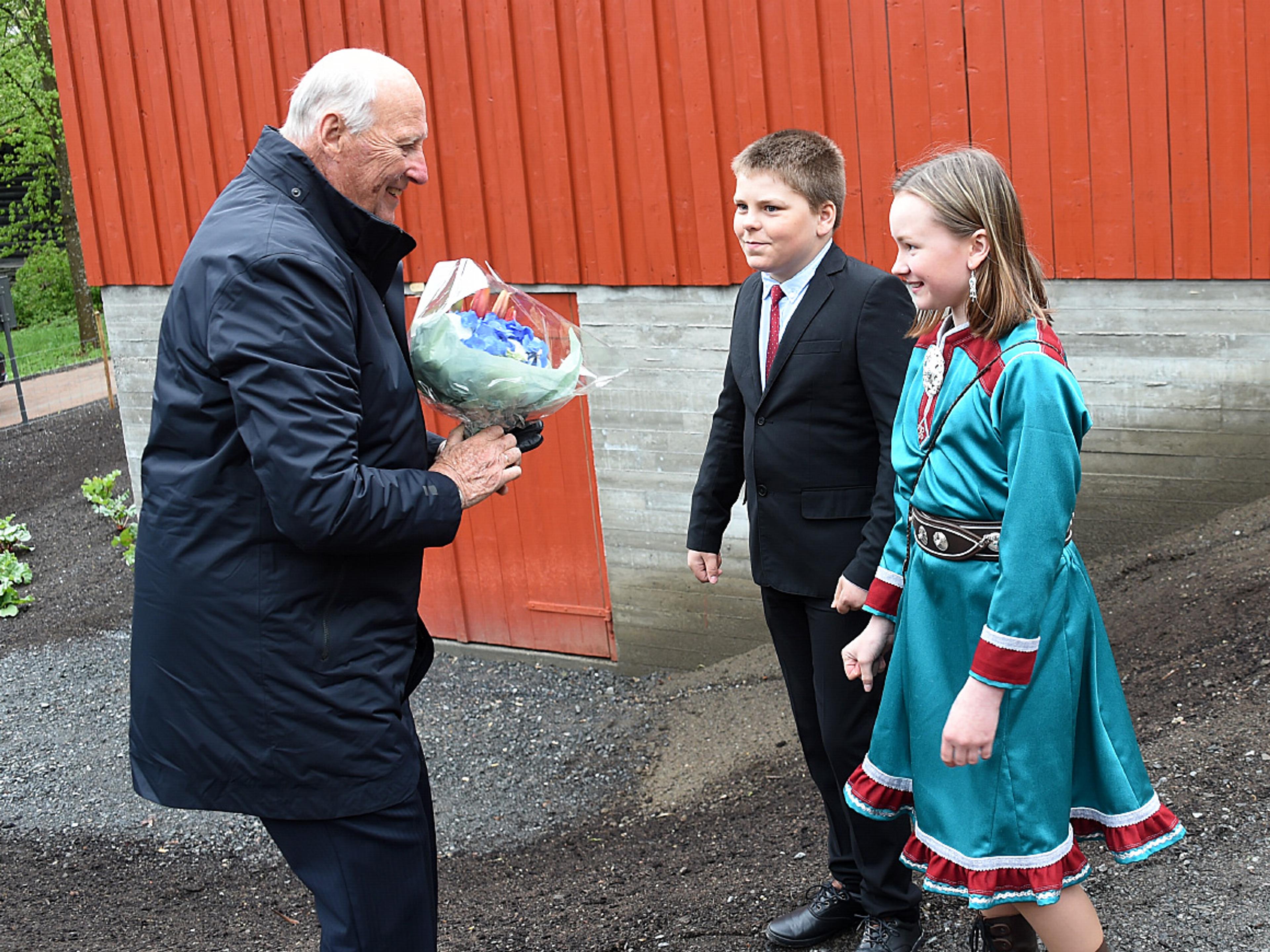Kongen ble tatt i mot av museumsdirektør Olav Aaraas og blomsterbarna Celin og Joakim.