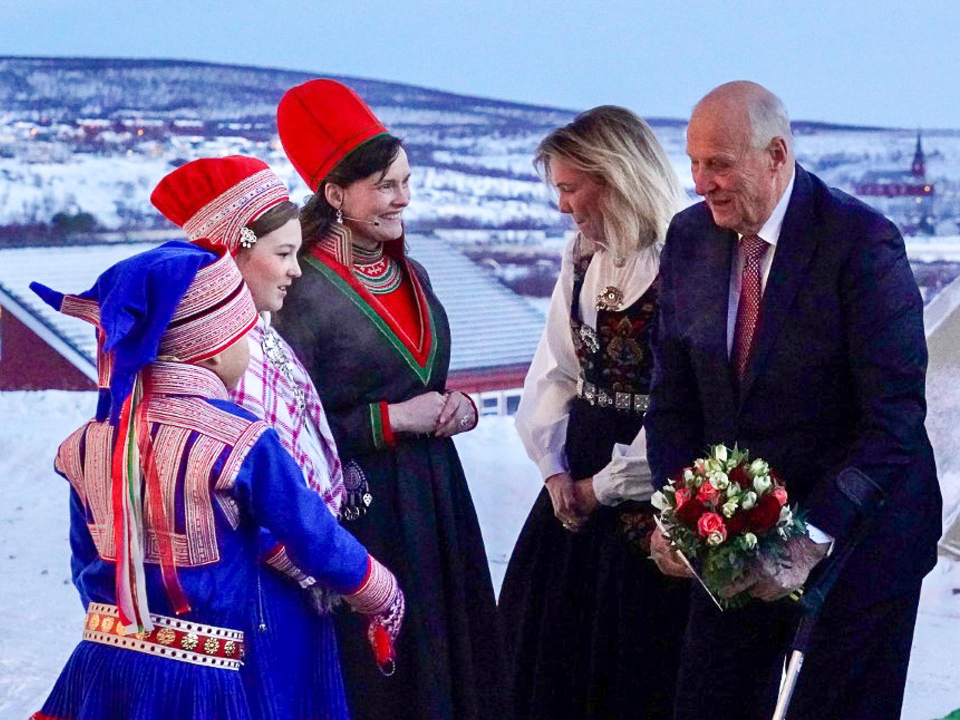 Kong Harald ble ønsket velkommen med joik og blomster fra Olav Amund Eira og Ellen Inger Gaup han ankom det samiske vitenskapsbygget Diehtosiida for overrekkelsesseremoni i ettermiddag.