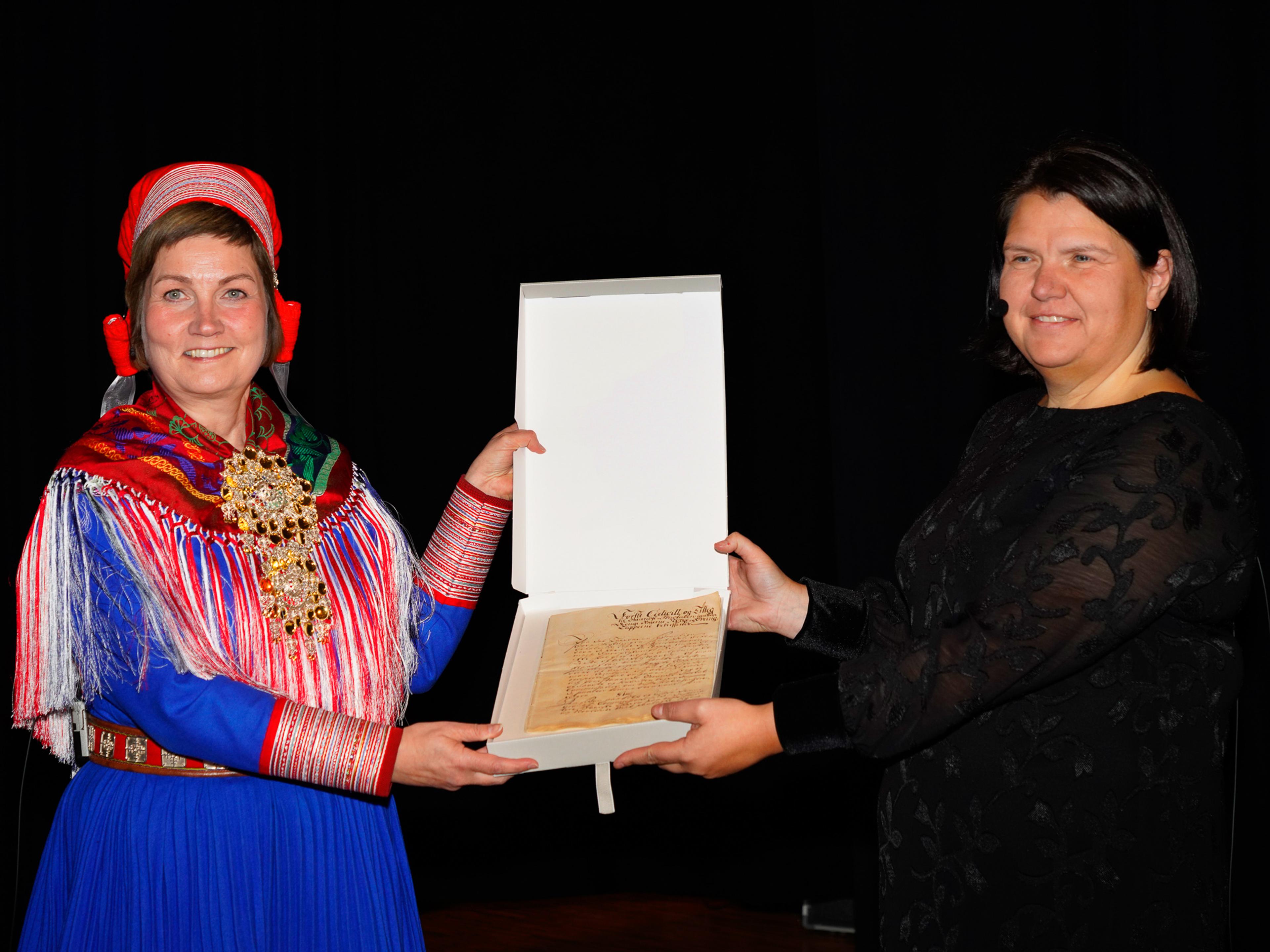 Statssekretær Gry Haugsbakken i Kulturdepartementet foretok den symbolske overrekkelsen til sametingspresident Aili Keskitalo, som tok imot på vegne av samene.