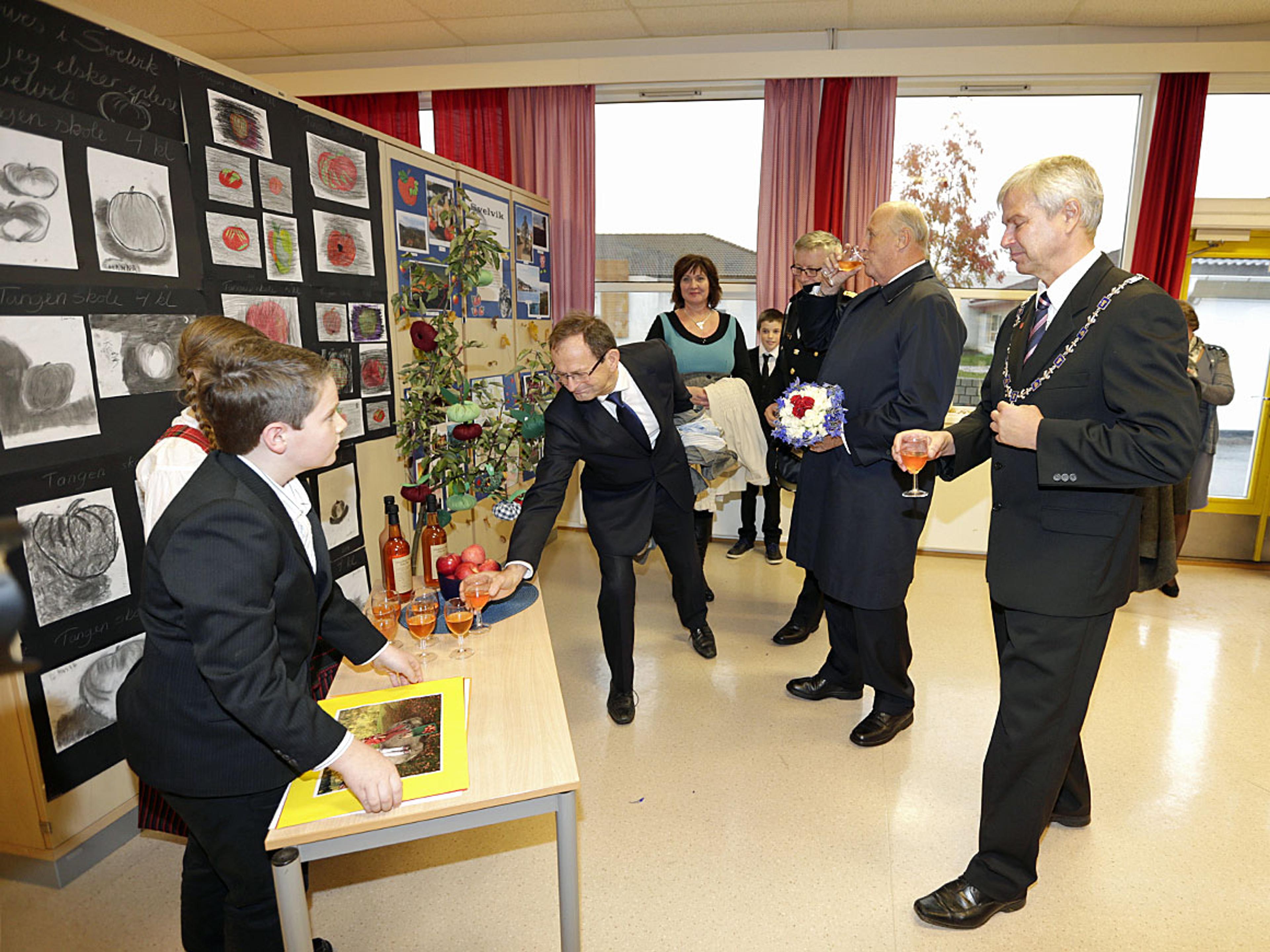 Elevene serverte Kongen lokalprodusert eplejuice som falt i smak.