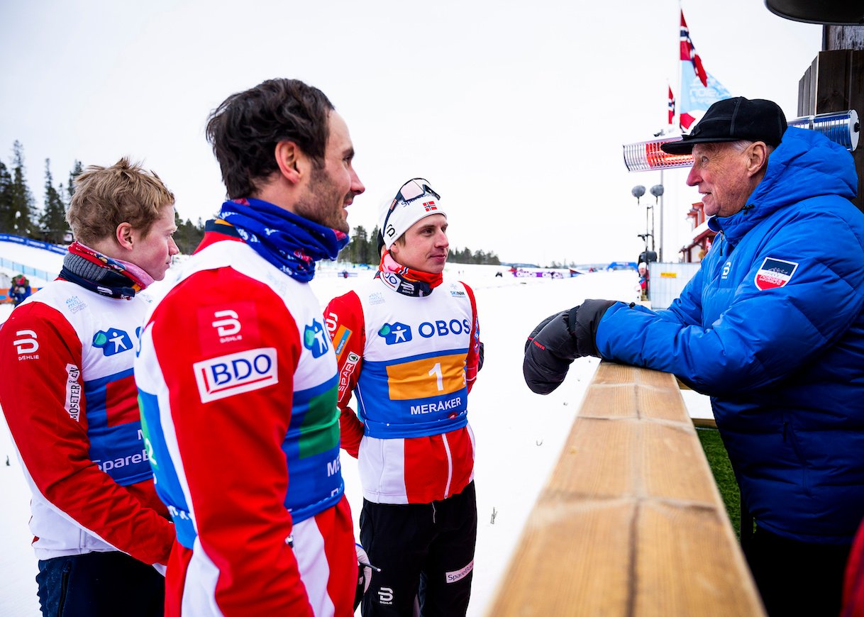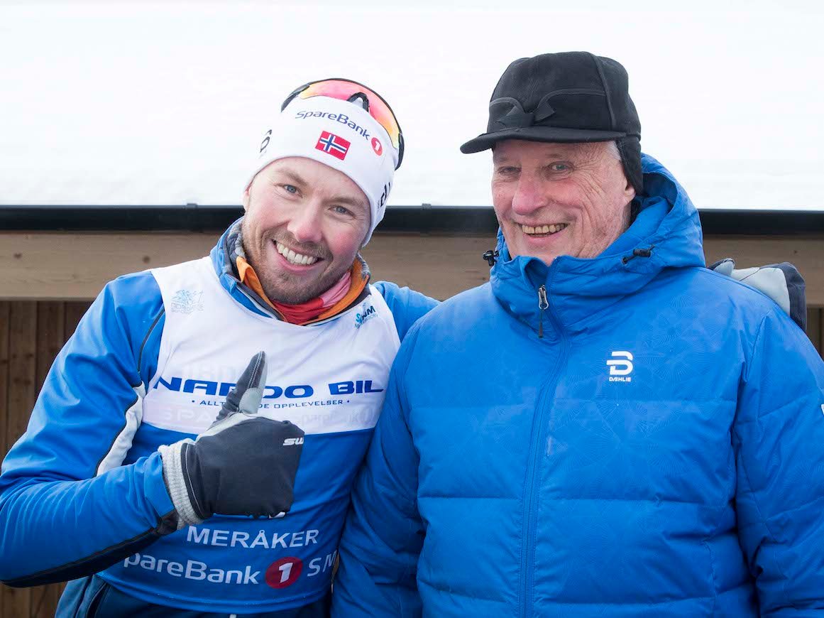 Laurdag tok Kong Harald imot Therese Johaug og Emil Iversen på kongetribunen som noregesmeistrar på høvesvis 15 og 30 kilometer skiathlon.
