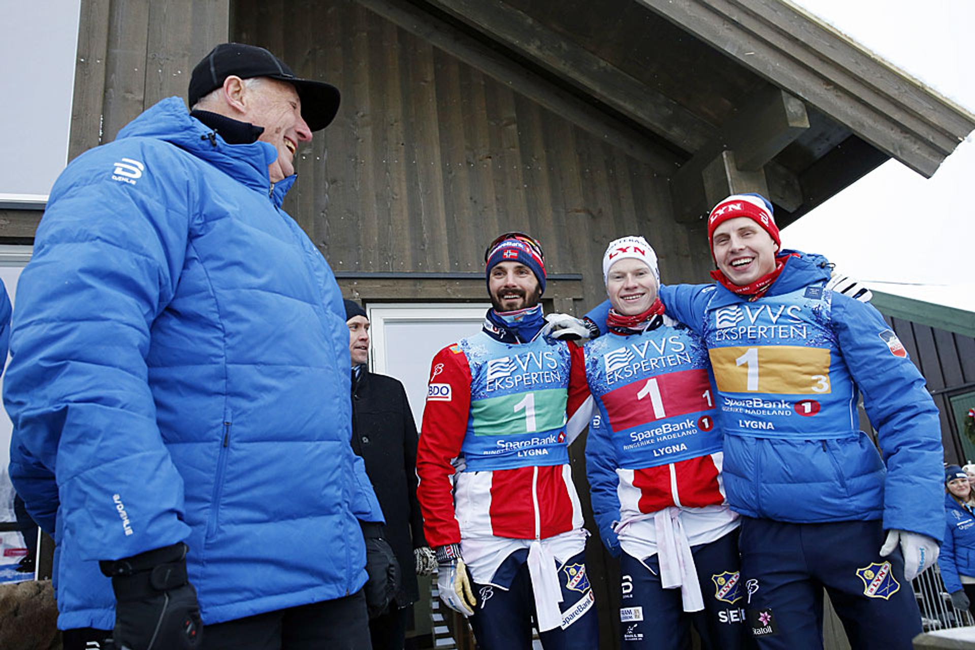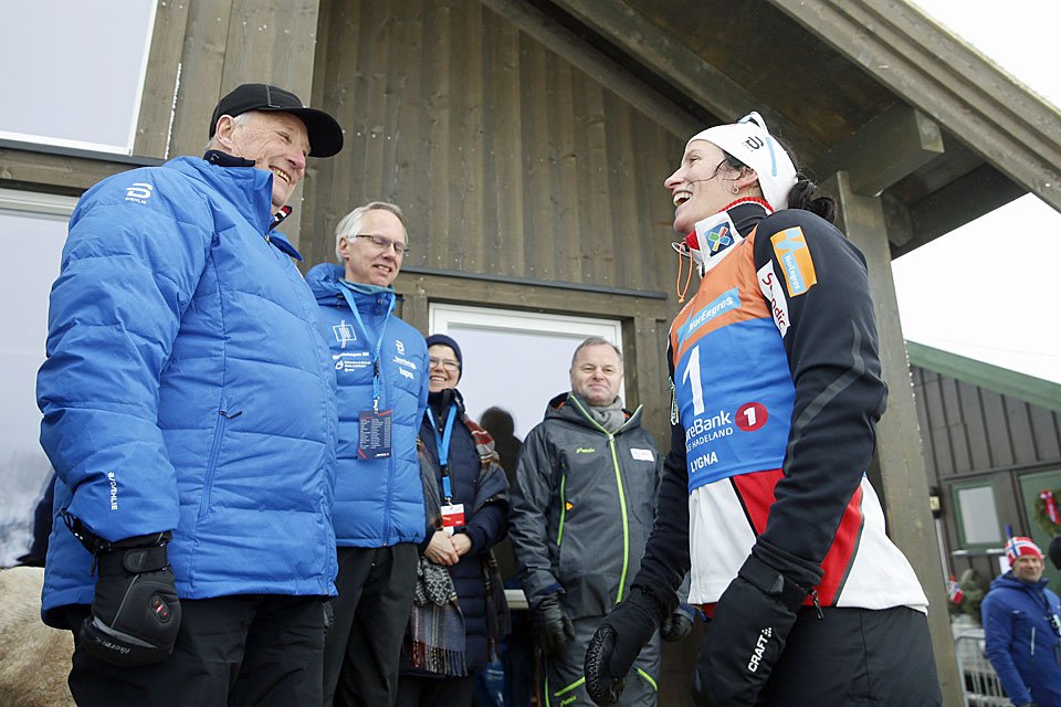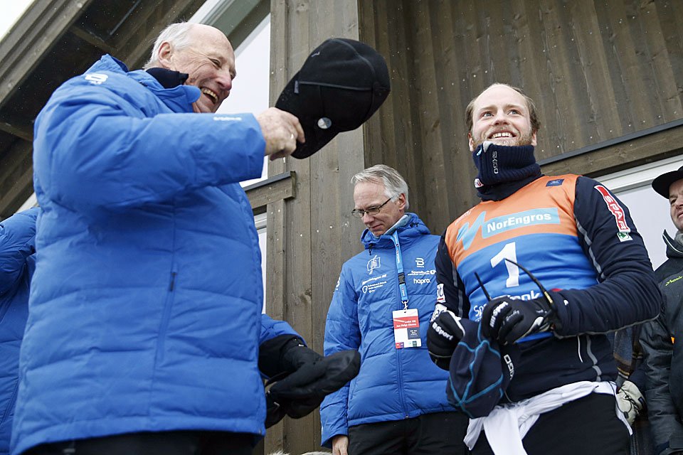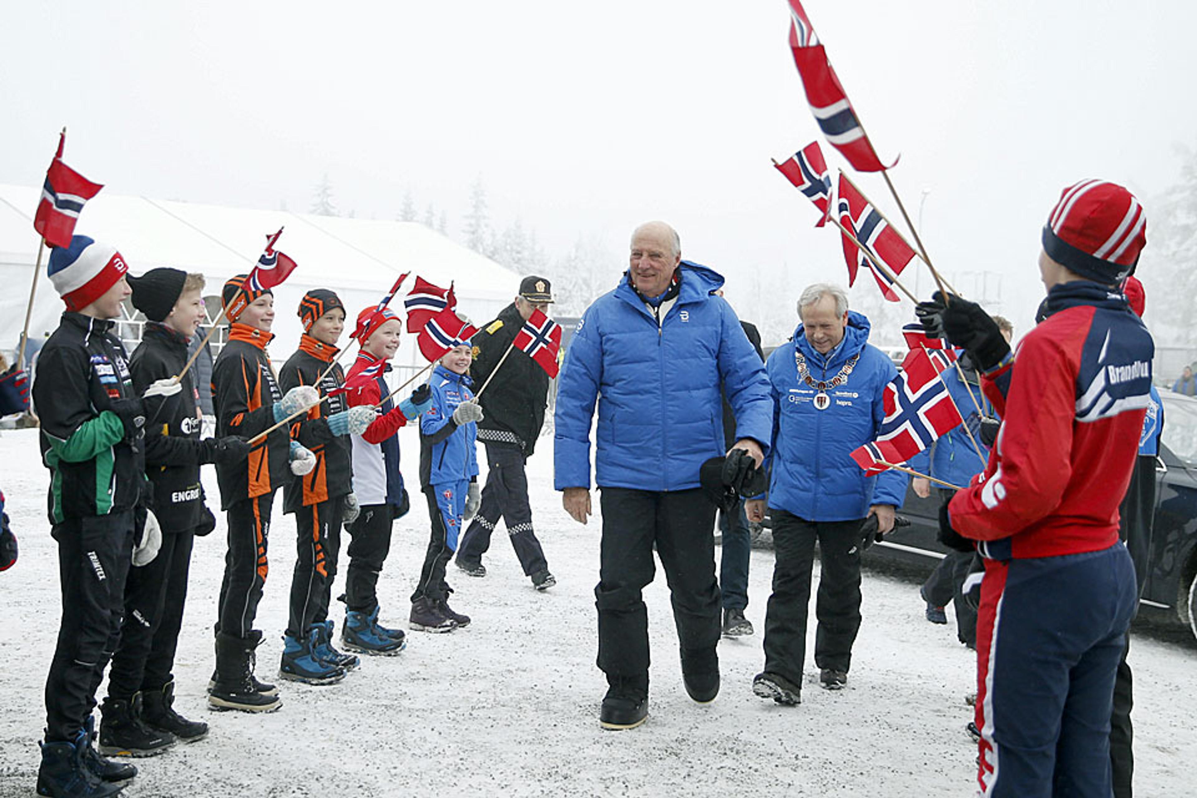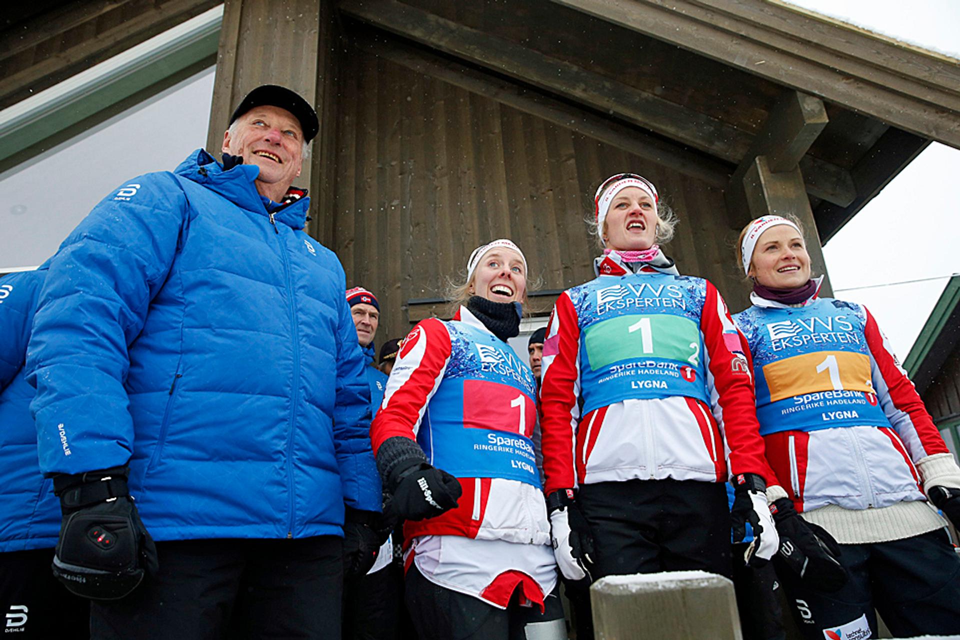 Kongen overvar lørdagens konkurranser fra Kongetribunen sammen med blant andre skipresident Erik Røste, fylkesmann Sigurd Tremoen og ordfører Willy Westhagen i Gran kommune.
