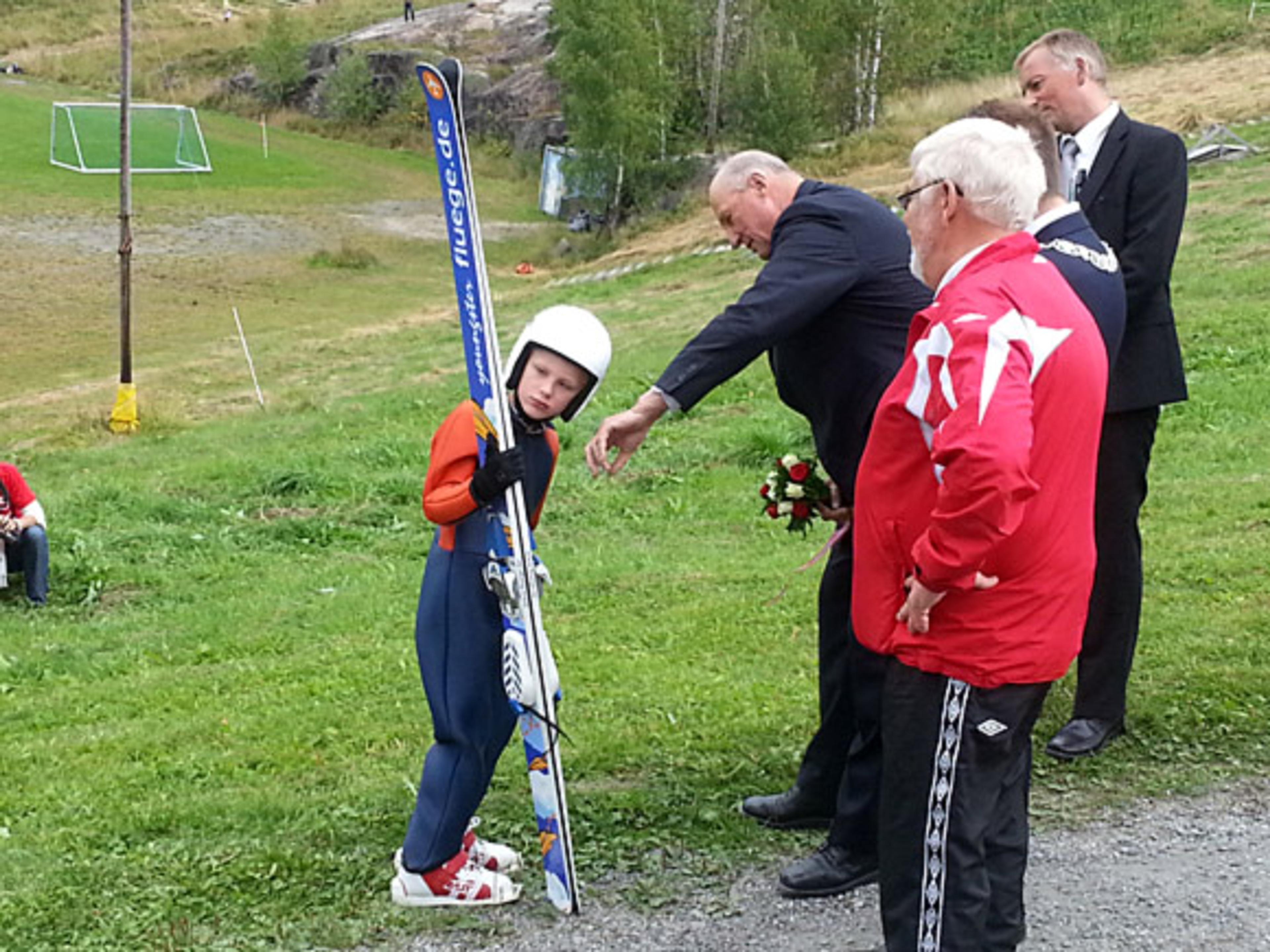 Kong Harald fikk en omvisning i hoppanlegget i parken. Flere unge hoppere fra Tomter hoppteam i Hobøl Idrettslag satte utfor i plastbakken mens Kongen så på.