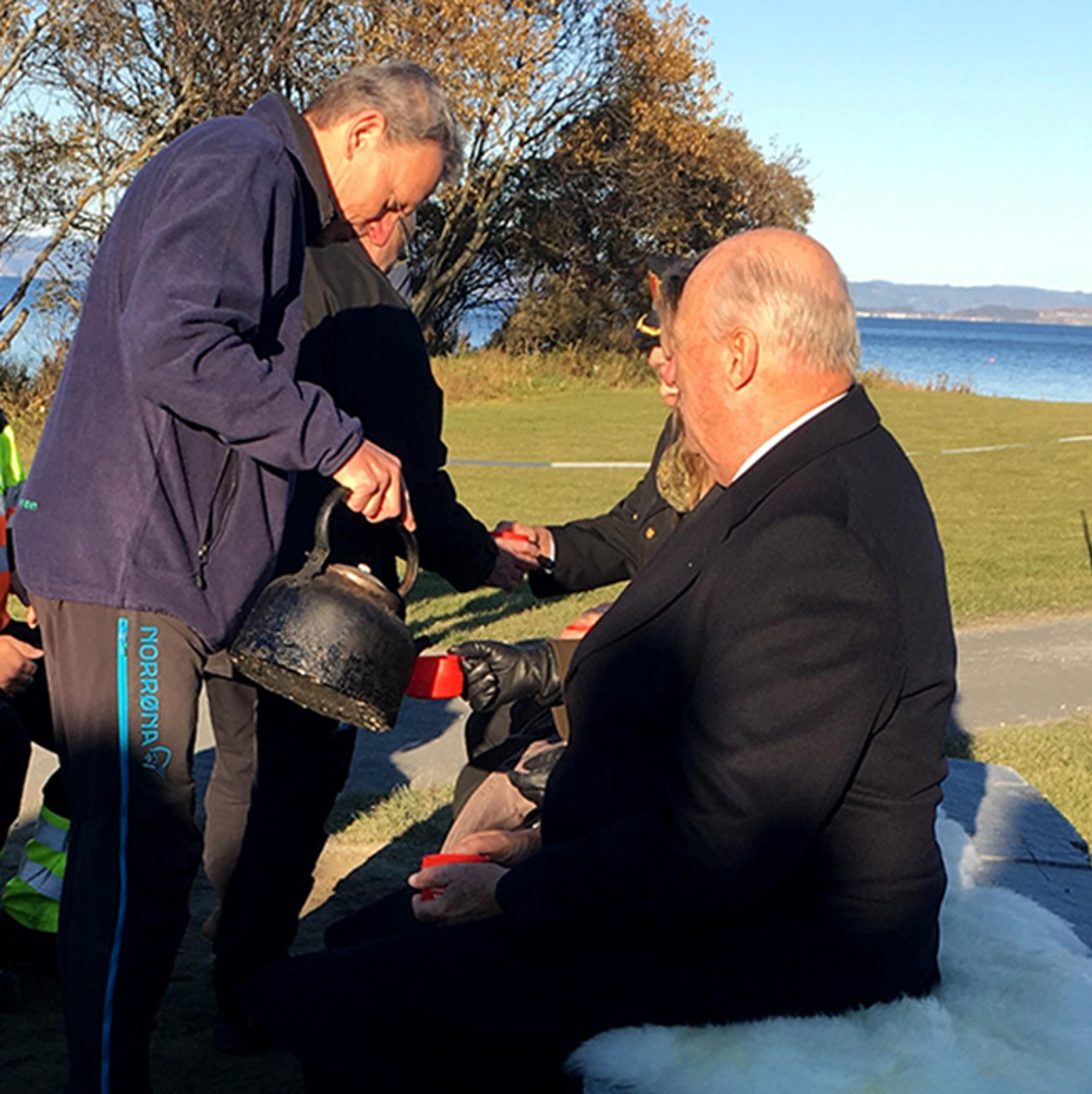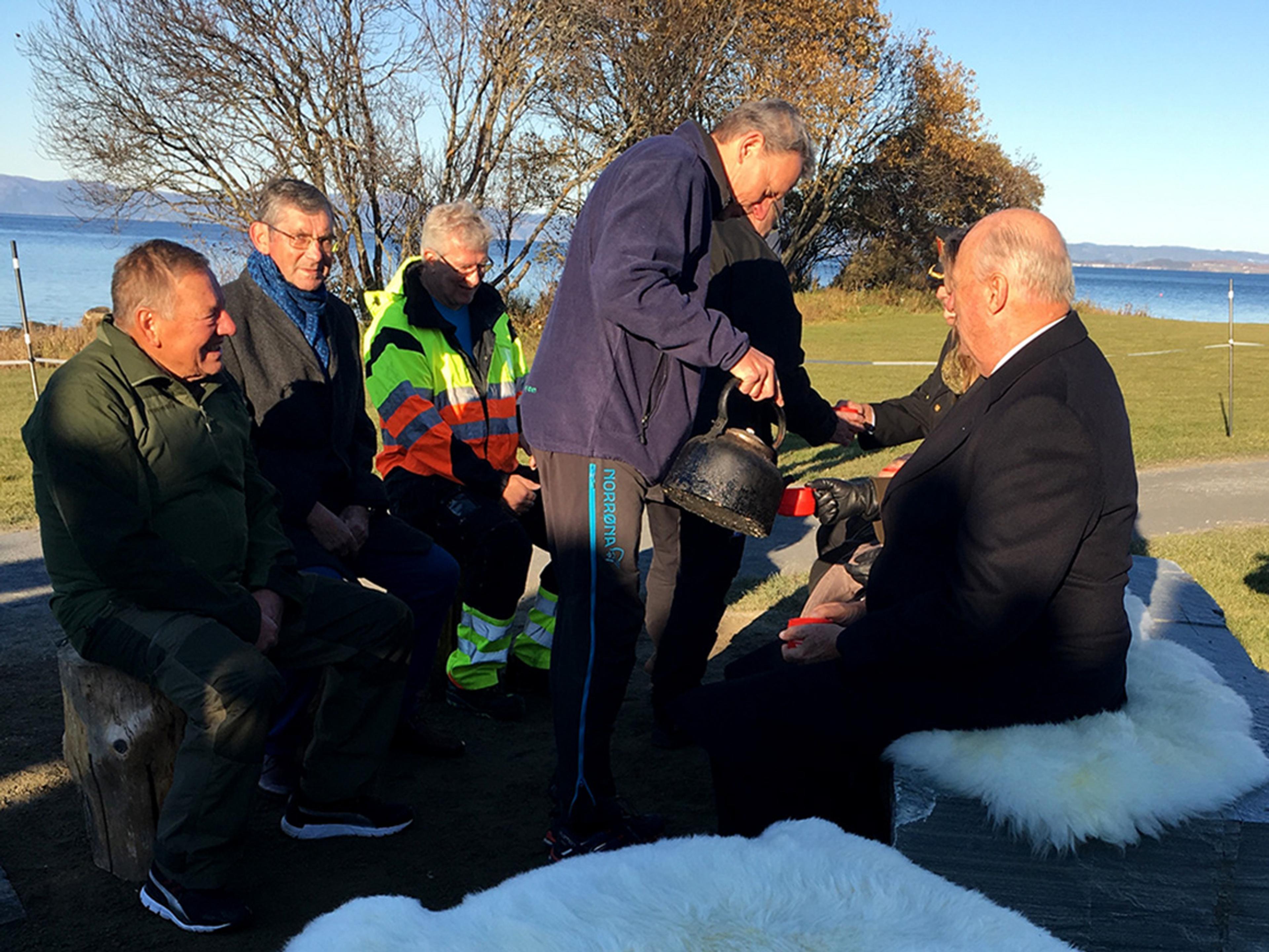 Og Kongen ble med på en liten vandring ut mot sjøen. Der ble han invitert på kaffe ved "Tenkestedet"- så kalt etter en passasje hos den kloke Ole Brumm, som mener et lite tenkested er et sted "hvor venner møtes og hvor de kan sitte og tenke en stund, og tenke på hva de skal gjøre når de har tenkt". I dag var det dugnadsaktive eldre som møtte Kongen på Tenkestedet.