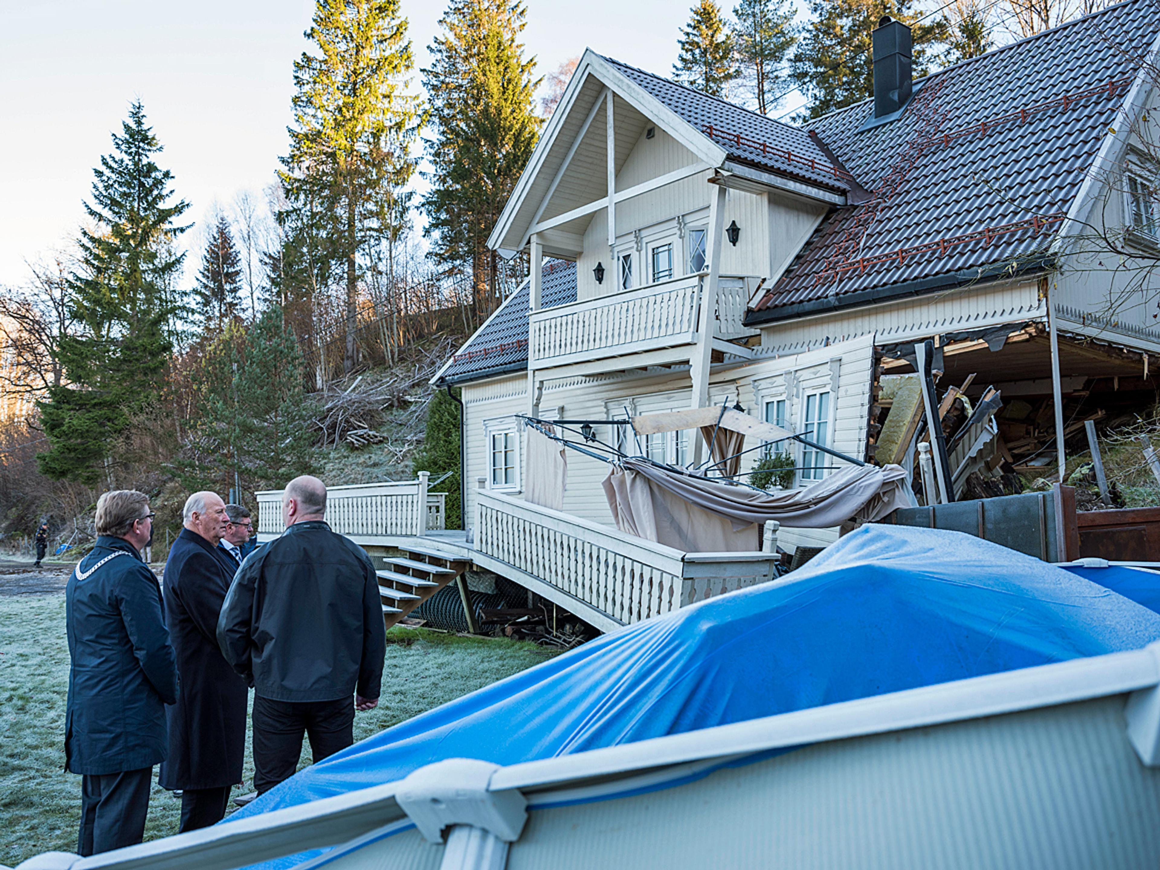 På Kilåsen møtte Kongen og Kristiansand-ordførar Harald Furre bebuarar som hadde fått øydelagt heimane sine av vassmassane. Store område har rasa ut, og framleis er det folk som ikkje har kunna flytte heim på grunn av øydeleggingane.