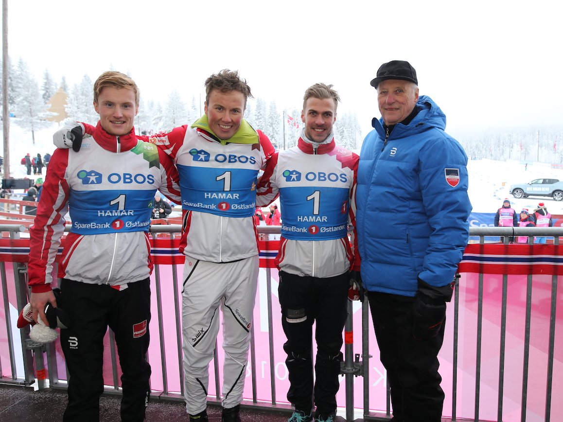 Herrene gikk to ganger 15 kilometer skiathlon lørdag, og med alle 30 kilometerne tilbakelagt var det Martin Johnsrud Sundby sin tur til å få gratulasjoner fra Kong Harald. Han tok seieren foran Niklas Dyrhaug og Finn Hågen Krogh.