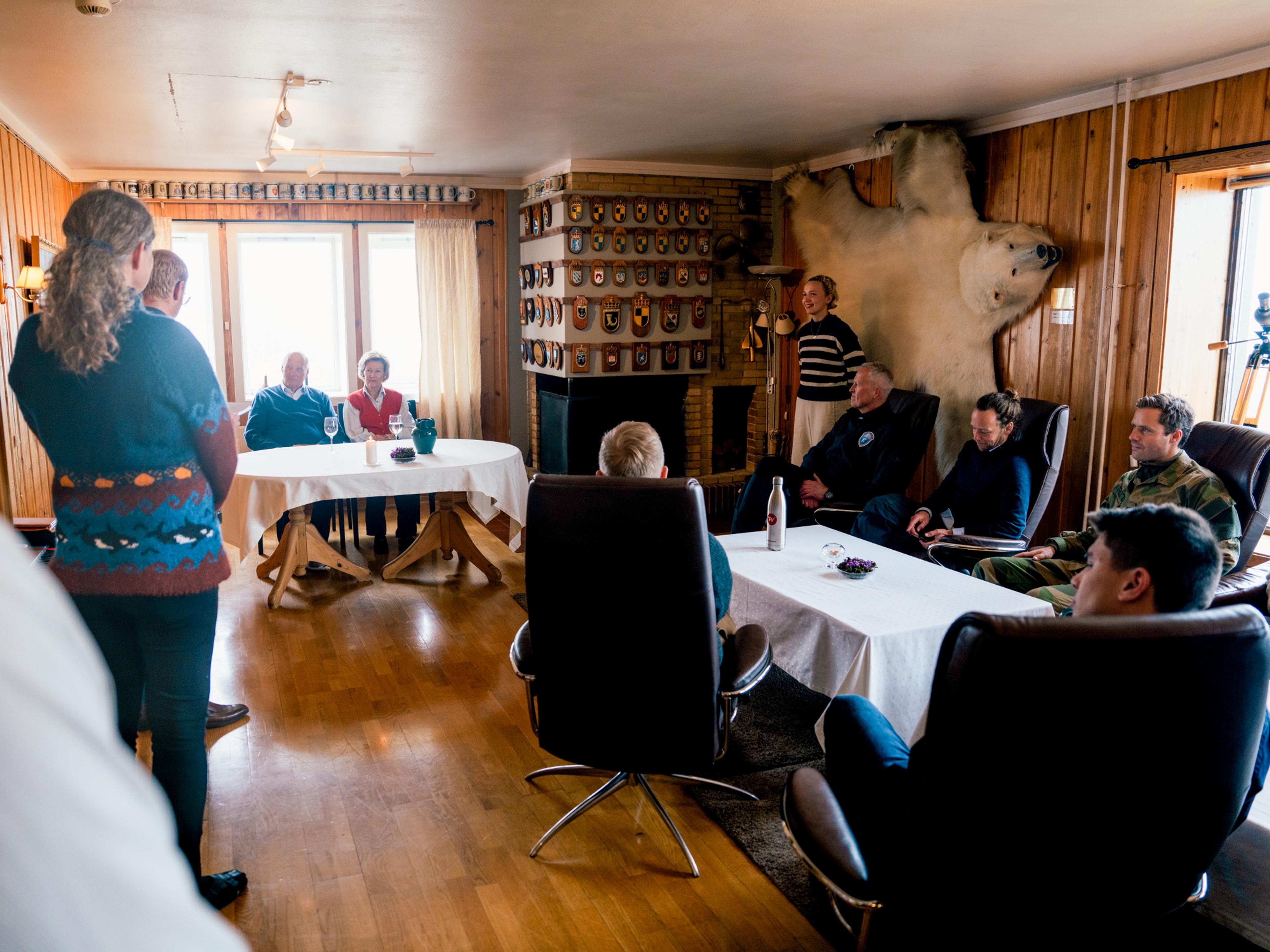 Det er fortsatt to igjen fra vinter- og vårbesetningen. Sondeleder Lena Ringstad Olsen er snart ferdig med sin femte utstasjonering i ishavet – to ganger på Jan Mayen og tre ganger på Bjørnøya. Hun fortalte litt om historien til øya og ga Dronningen en omvisning på stasjonen og i det gamle hovedbygget til Bjørnøya Radio som er gjort om til museum.