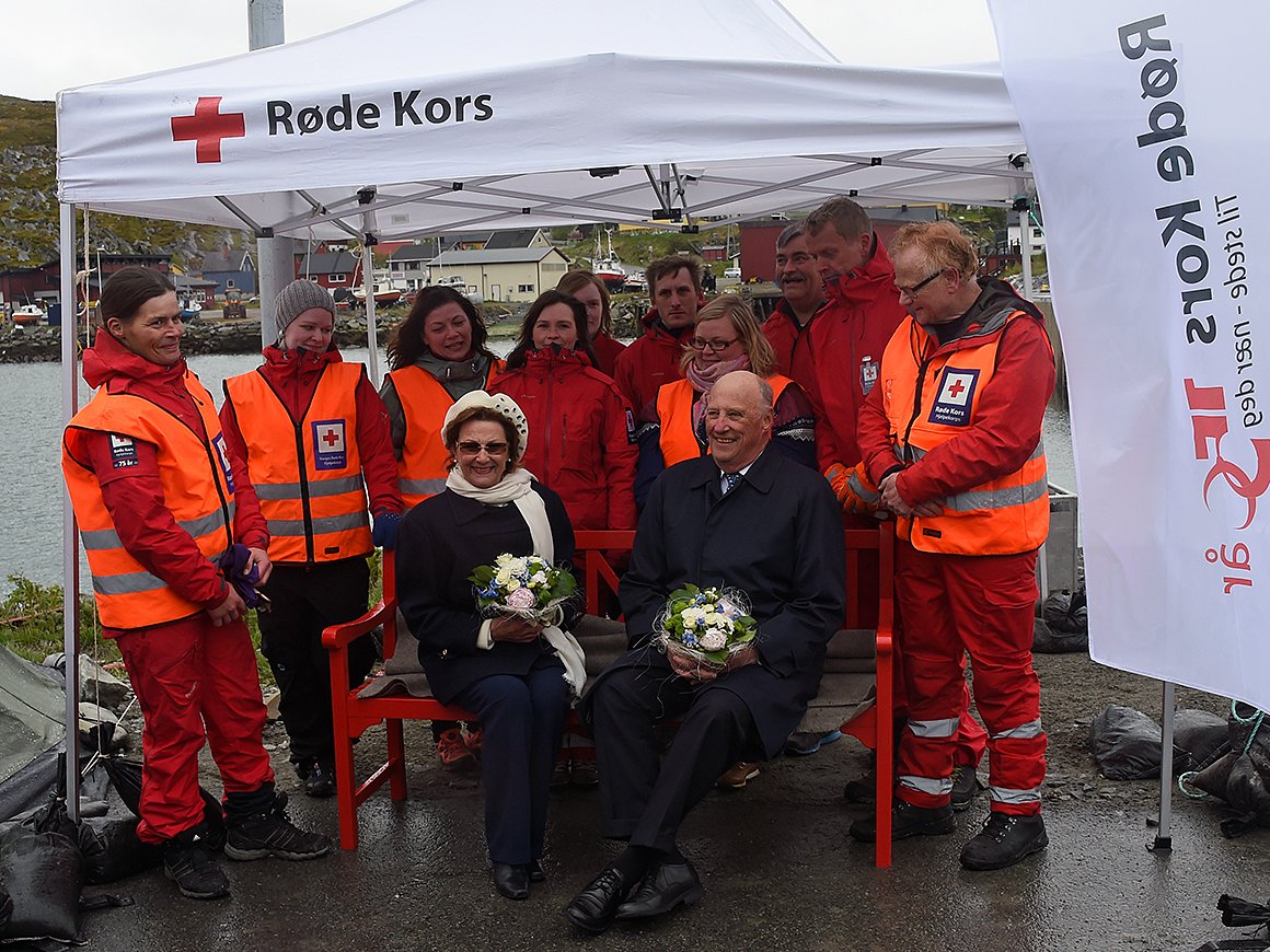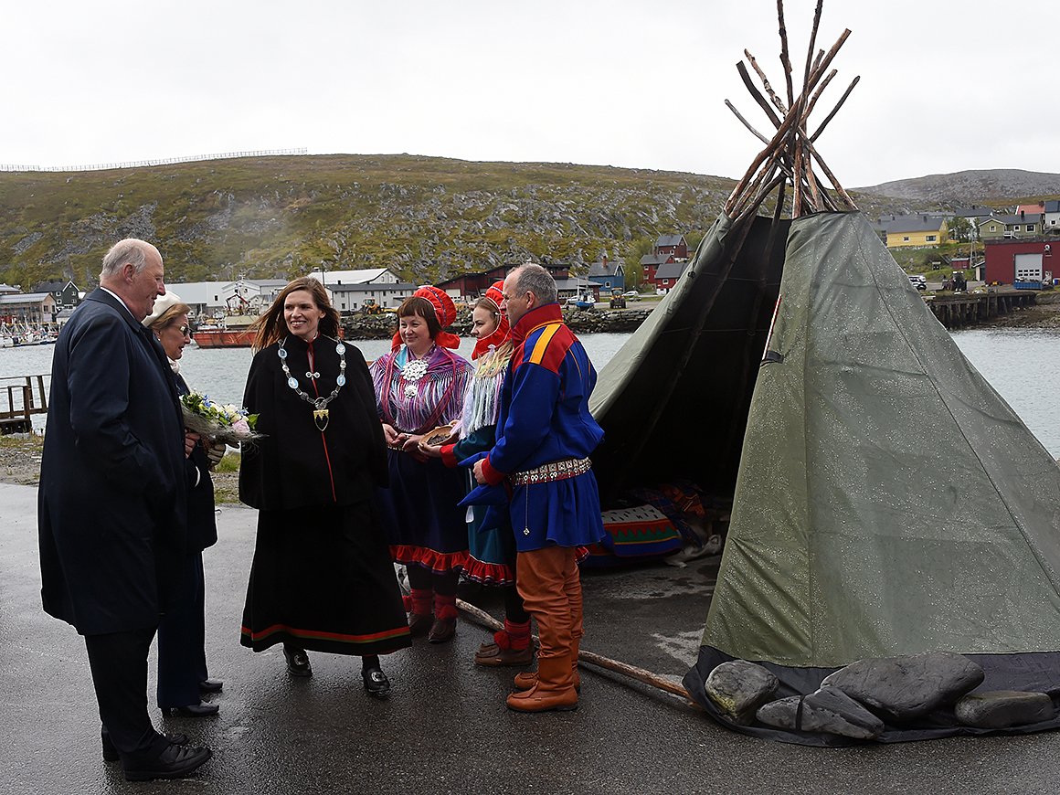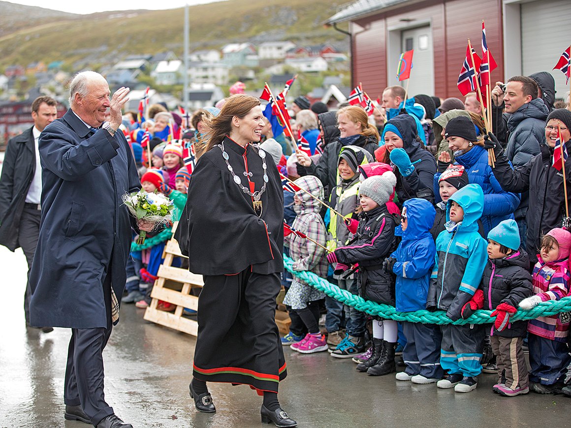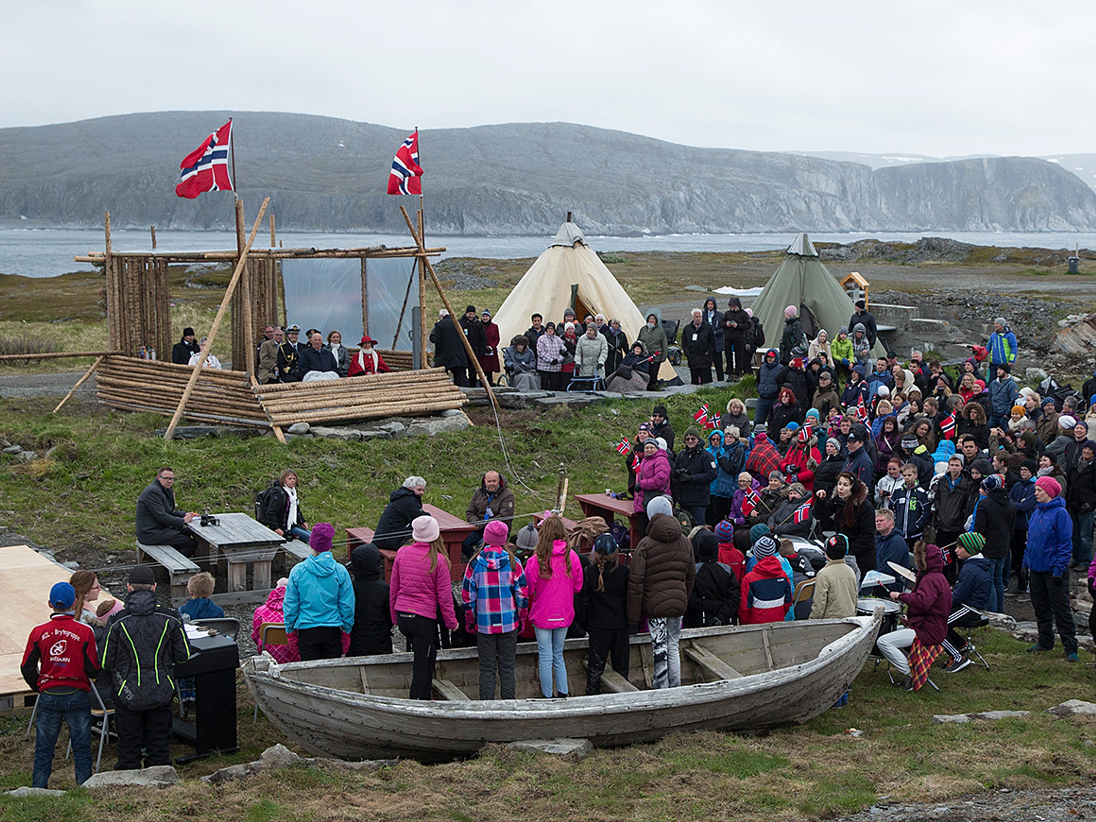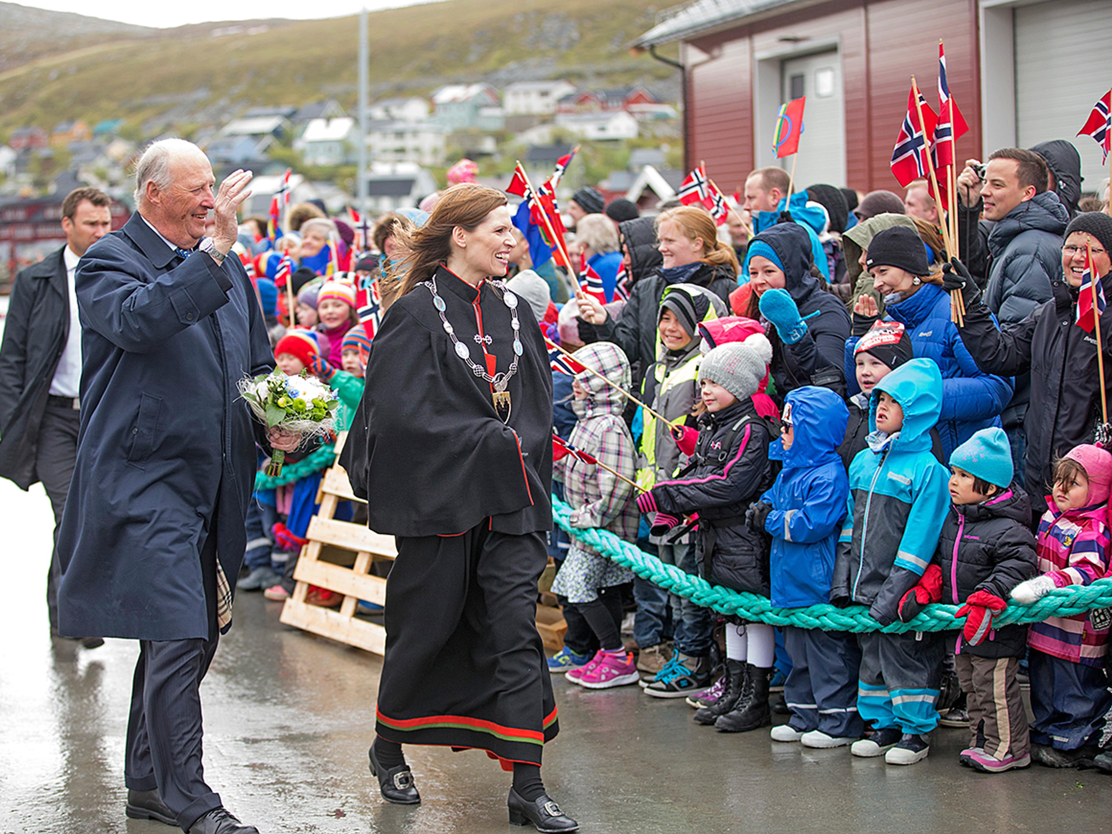 I ettermiddag gikk Kongeparet i land i Mehamn i Gamvik, Norges – og Europas nordligste fastlandskommune. Der kunne ordfører Inga Manndal ønske velkommen og ledsage Kongen og Dronningen til folkefest på Veviknesset.