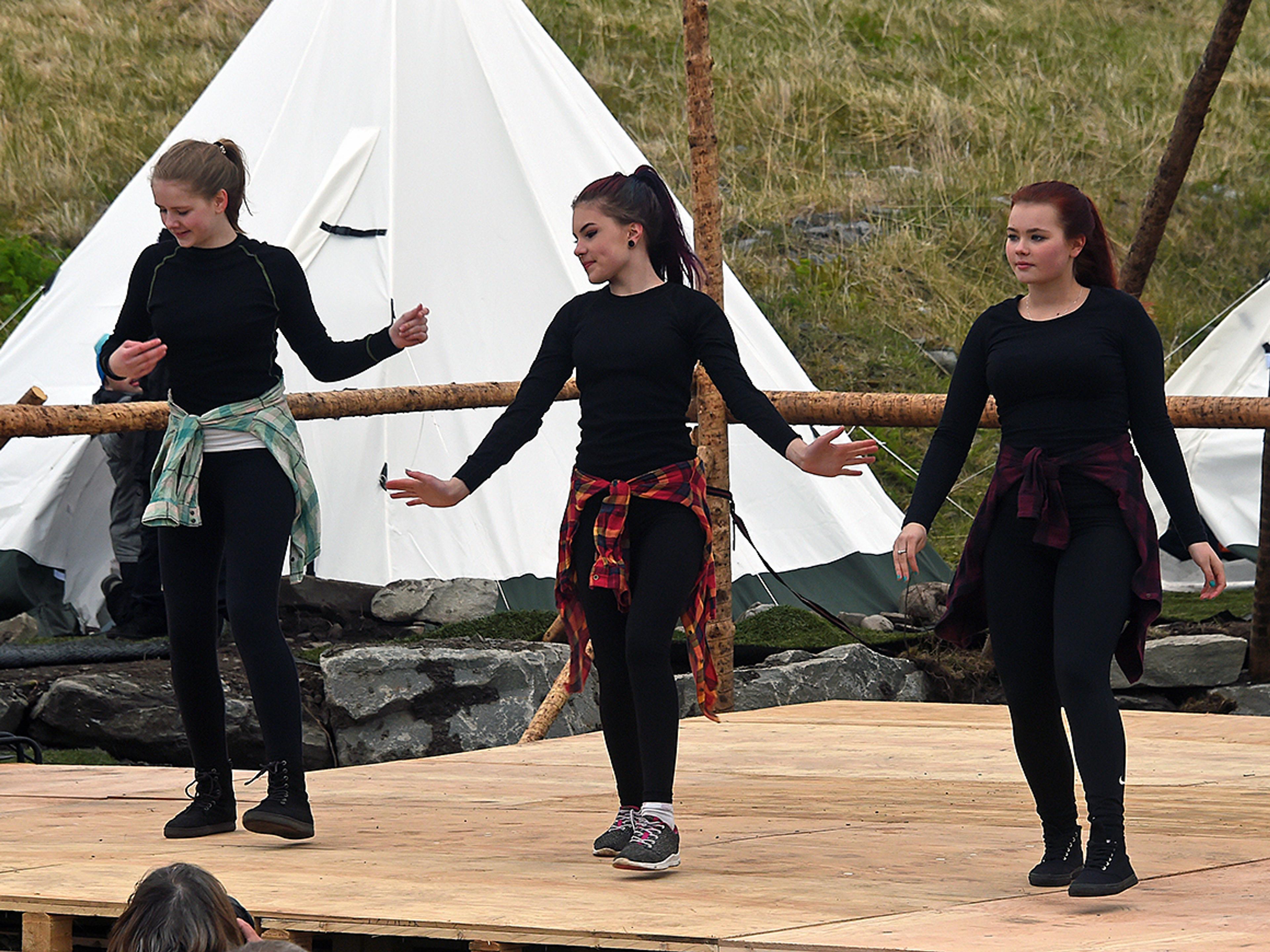Lillekoret med elever fra alle skolene i Gamvik sang for Kongeparet, og musikkskolebandet med vokalist Aurora Steel framførte «At me havet». Etter ordførerens tale, ble det både mer sang og dans, før det var Dronningens tur til å innta scenen.