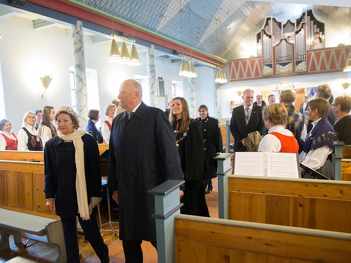 I Kjøllefjord kirke ble Kong Harald og Dronning Sonja møtt av korsang ved inngangen og de fikk også lytte til en liten orgelkonsert inne i kirken.