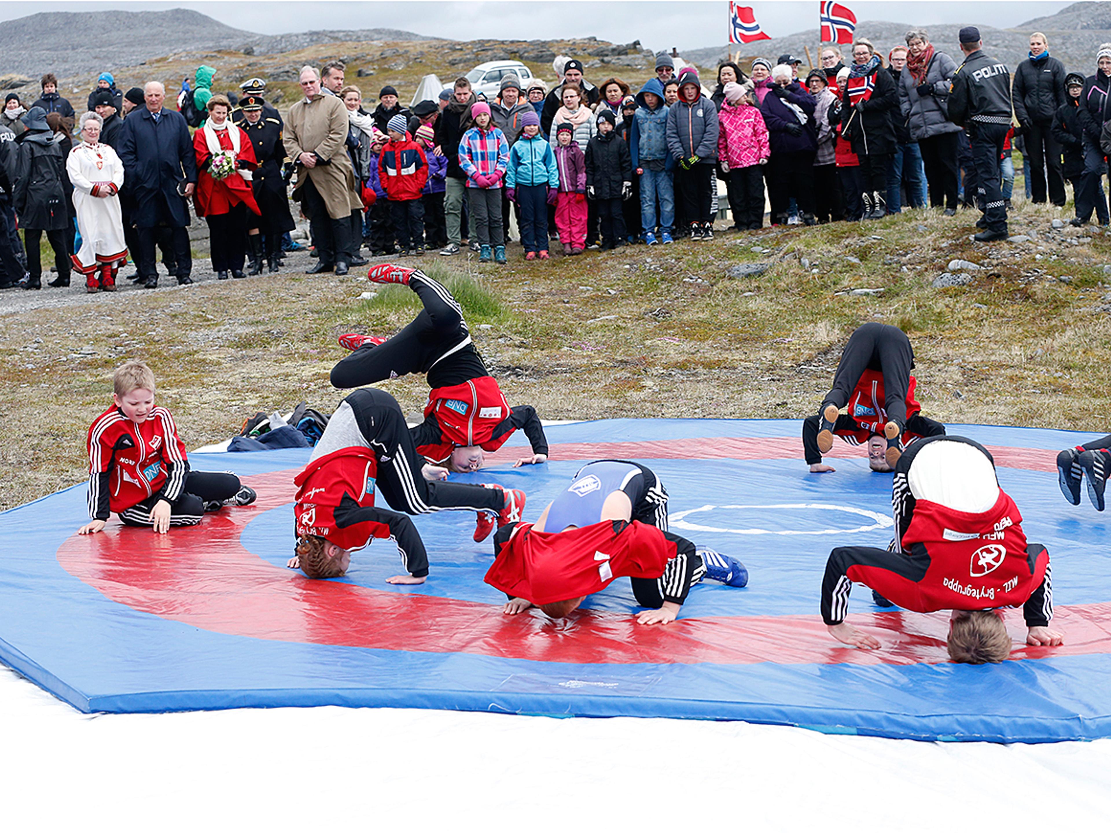 Kongeparet fikk se unge brytere vise seg fram, hilse på stafettlaget fra Skjånes skole som har løpt 55 kilometer fra Skjånes til Mehamn, og møte barn og lærere bak rebusløpet «En liten tur ut». Kongen og Dronningen fikk også møte representanter for hundreåringen Mehamn Kvinne- og Familieforbund, og en familie med sine røtter på Filippinene. Nordkyn Modellflyklubb viste fram flyene sine, og en lokal produsent av fiskemat bød på smaksprøver av både fiskekaker, tørrfisk og bacalao.