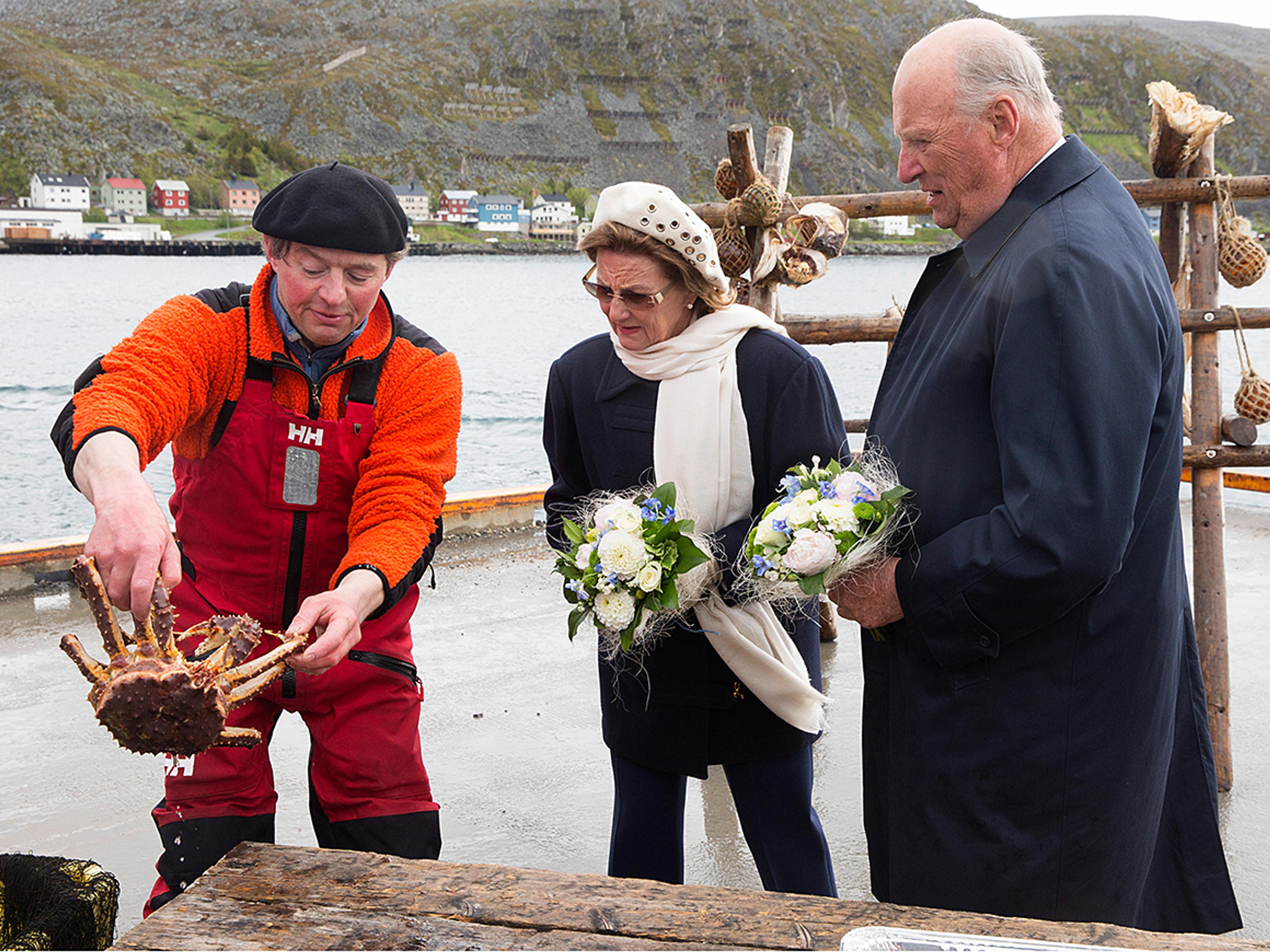 Kongeskipet ankret opp i Kjøllefjord i Lebesby kommune i dag tidlig, og sjaluppen tok Kongeparet inn til land der ordfører Stine Akselsen ønsket dem velkommen. I havna fikk Kongen og Dronningen også raskt stifte nærmere bekjentskap med lokal kongekrabbe. De fikk smake på delikatessen, som eksporteres herfra til eksklusive restauranter rundt om i verden.