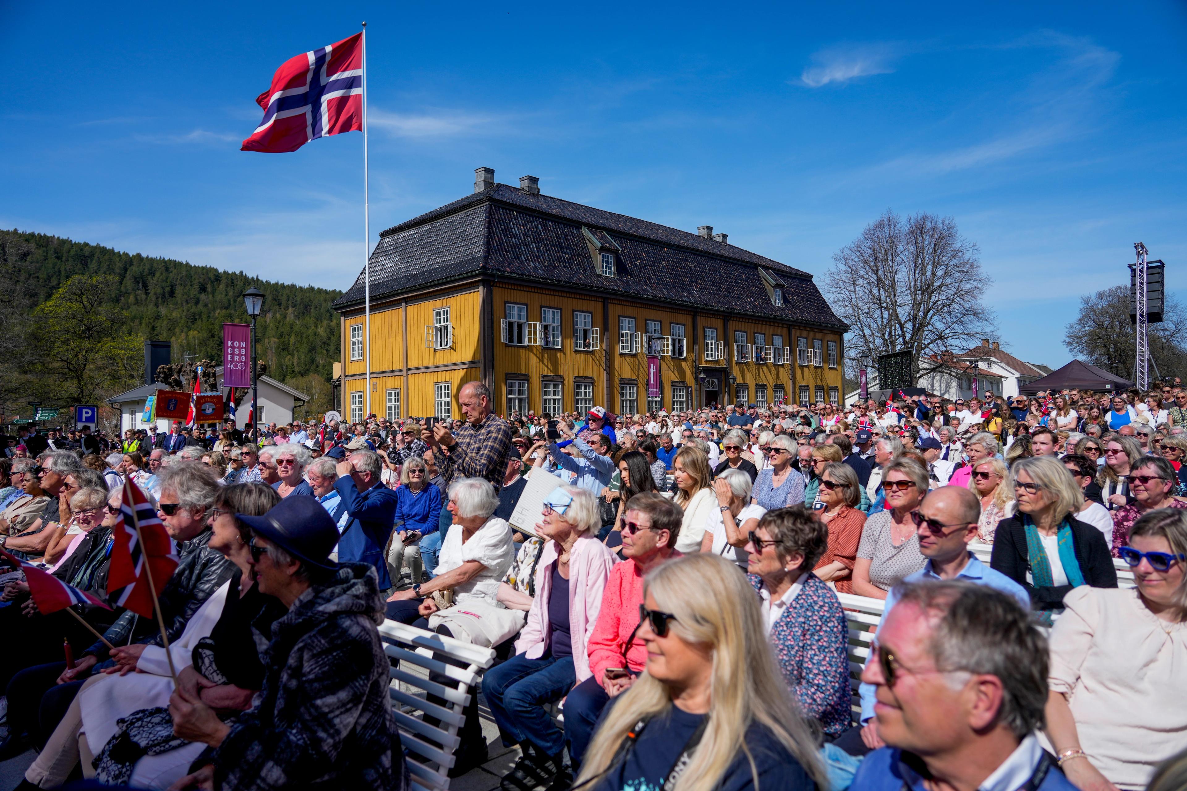 Mange tusen mennesker hadde møtt opp for å markere byjubileet i den gamle bergverksbyen. Først var Kongeparet med på en festforestilling i en stappfull Kongsberg kirke, før de ble møtt av et folkehav på plassen utenfor kirken.