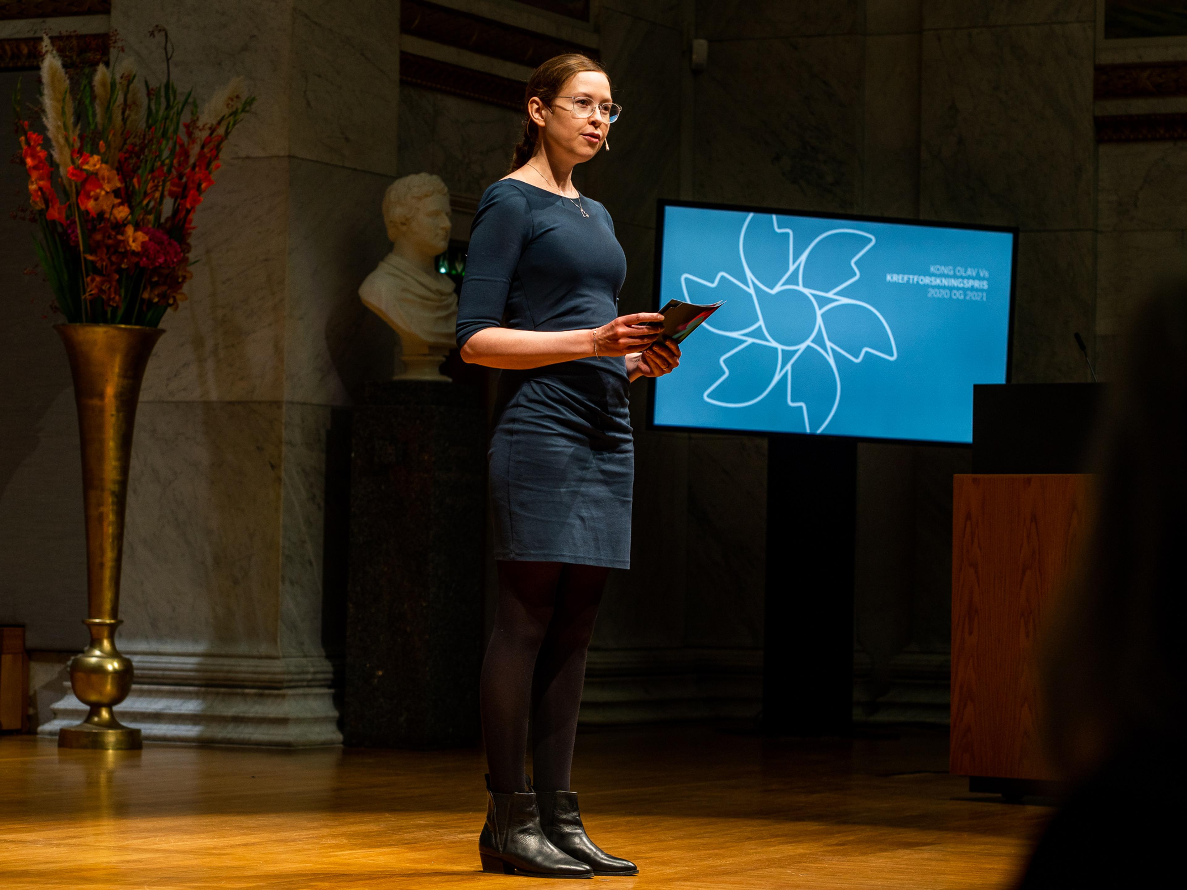 Seremonien startet med en sterk appell fra Anniken Golf Rokseth. 23 år gammel ble hun diagnostisert med kreft, og tre ganger har hun overvunnet den. Hun takket forskerne i salen for livet – og for Live: For tre måneder siden ble hun og mannen foreldre til en liten datter.