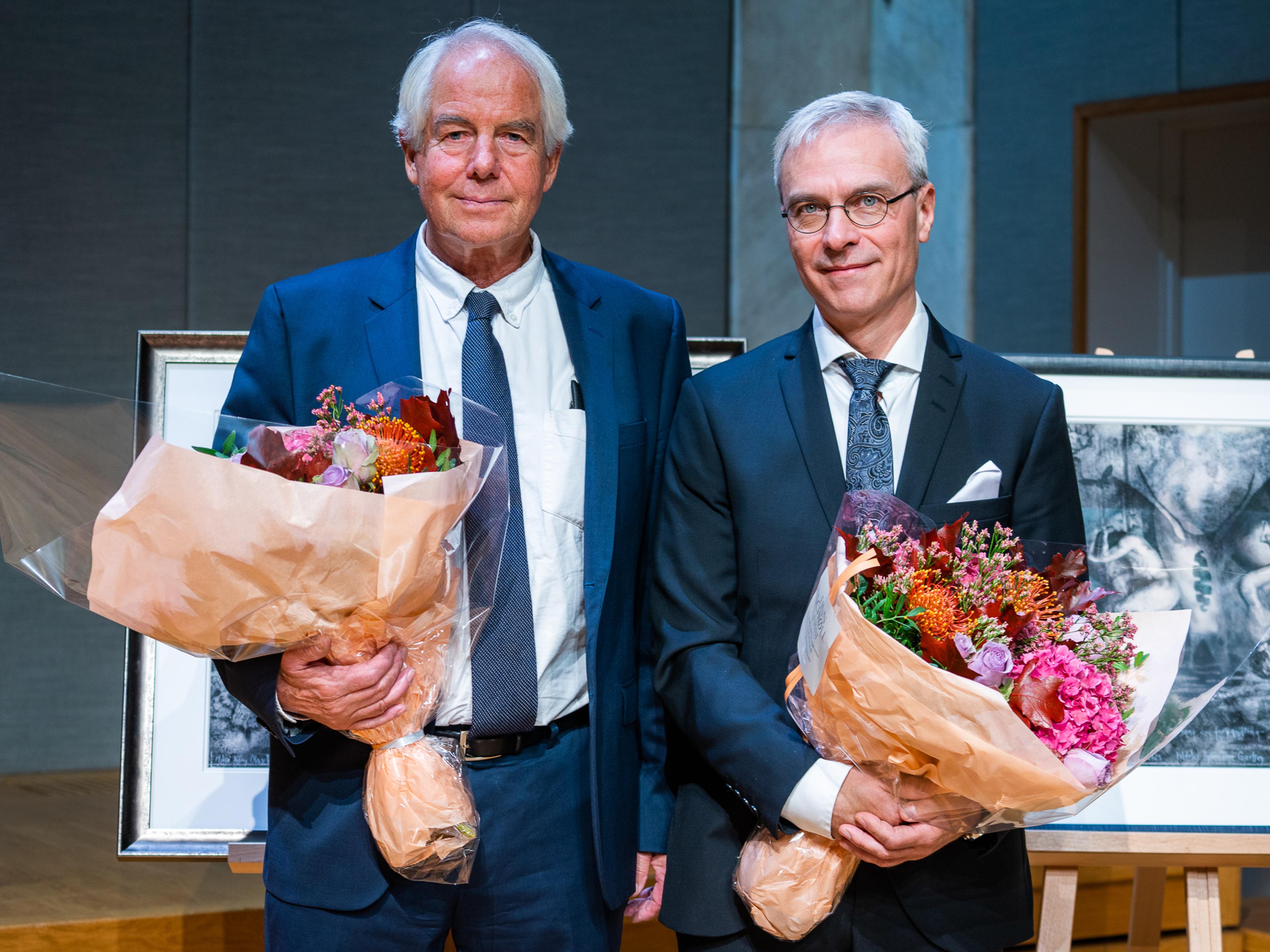 Bjarne Bogen og Bjørn Tore Gjertsen ble i dag tildelt Kong Olav Vs kreftforskningspris for 2020 og 2021. Hans Majestet Kongen stod for den høytidelige overrekkelsen.