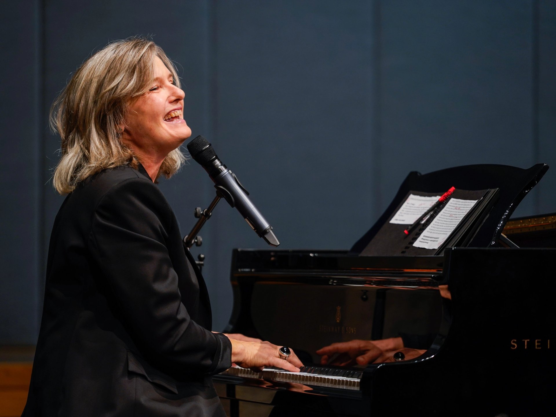 Artisten og musikeren Ingrid Bjørnov skapte humor til ettertanke fra flygelet – også hun takknemlig for banebrytende kreftforskning og for å være kreftfri.