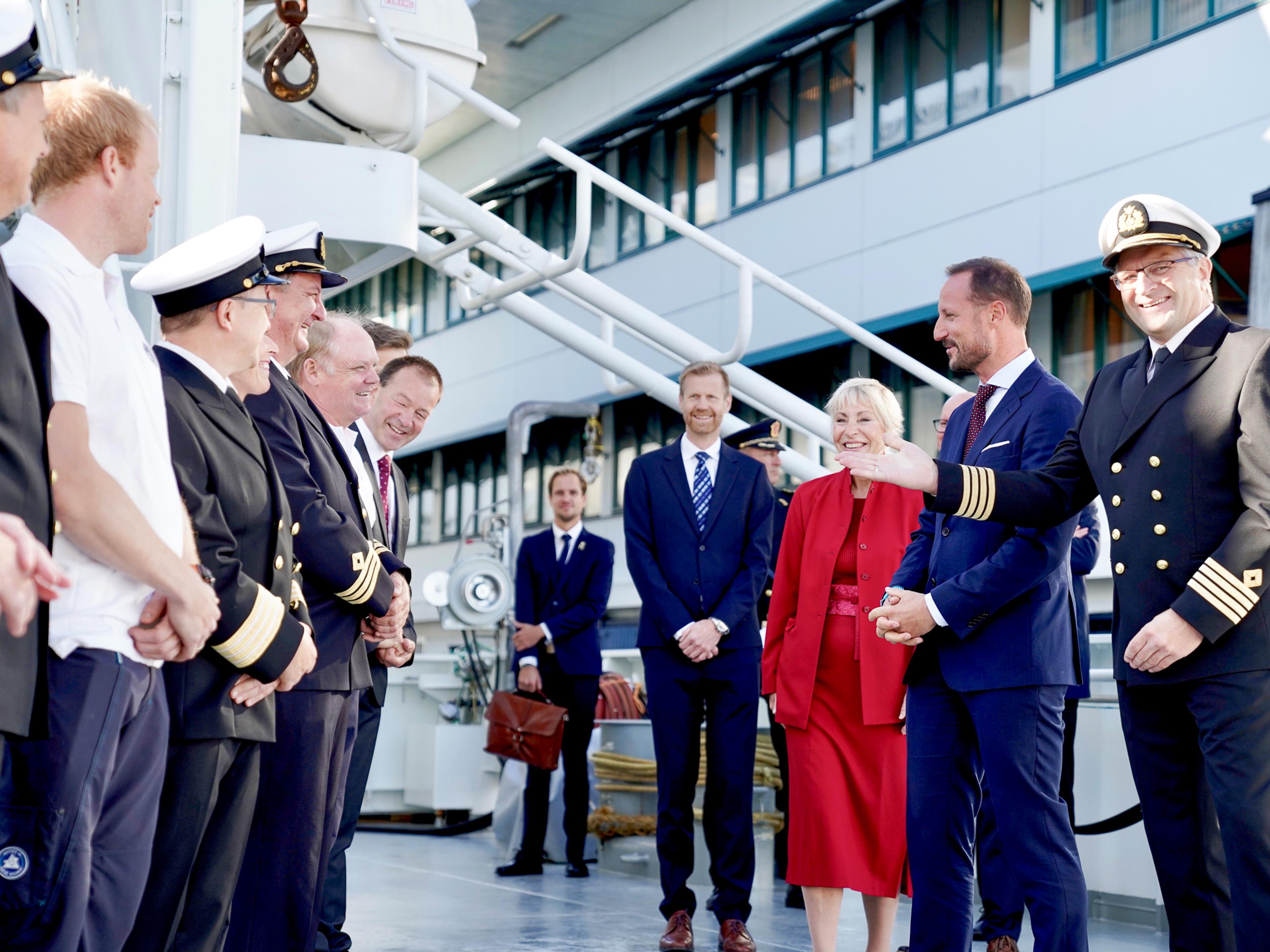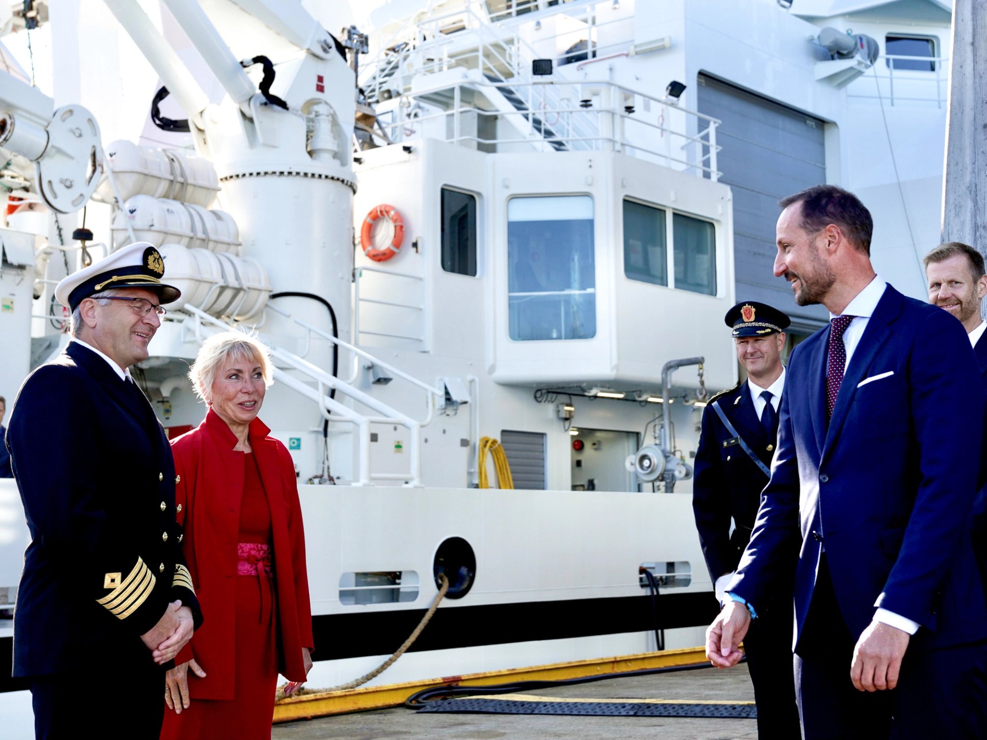 «Dr. Fridtjof Nansen» eies av Norad og opereres av Havforskningsinstituttet. Havforskningsdirektør Sissel Rogne og kaptein Tommy Steffensen ønsker Kronprinsen velkommen ved landgangen. Foto: Simen Løvberg Sund, Det kongelige hoff
