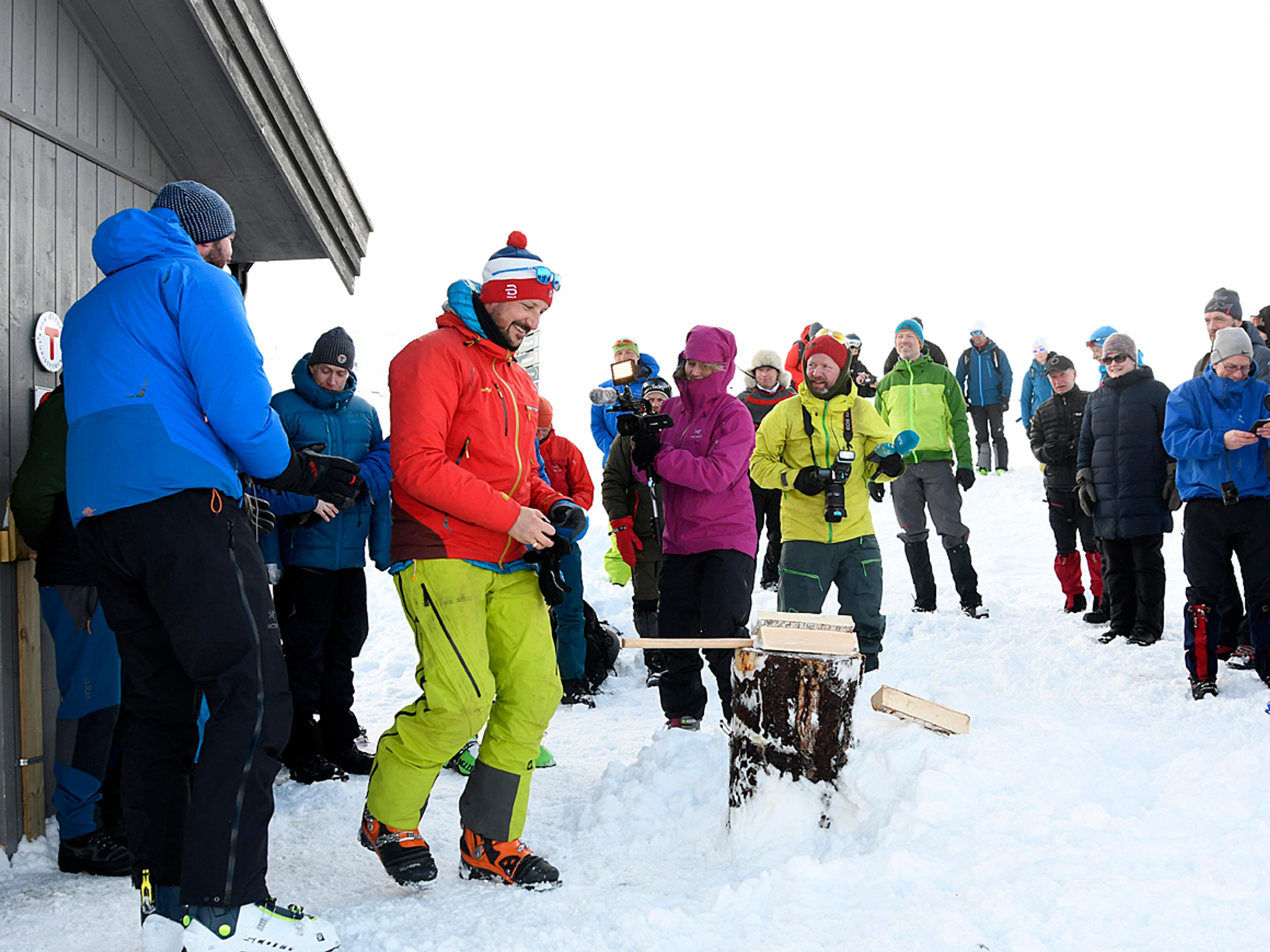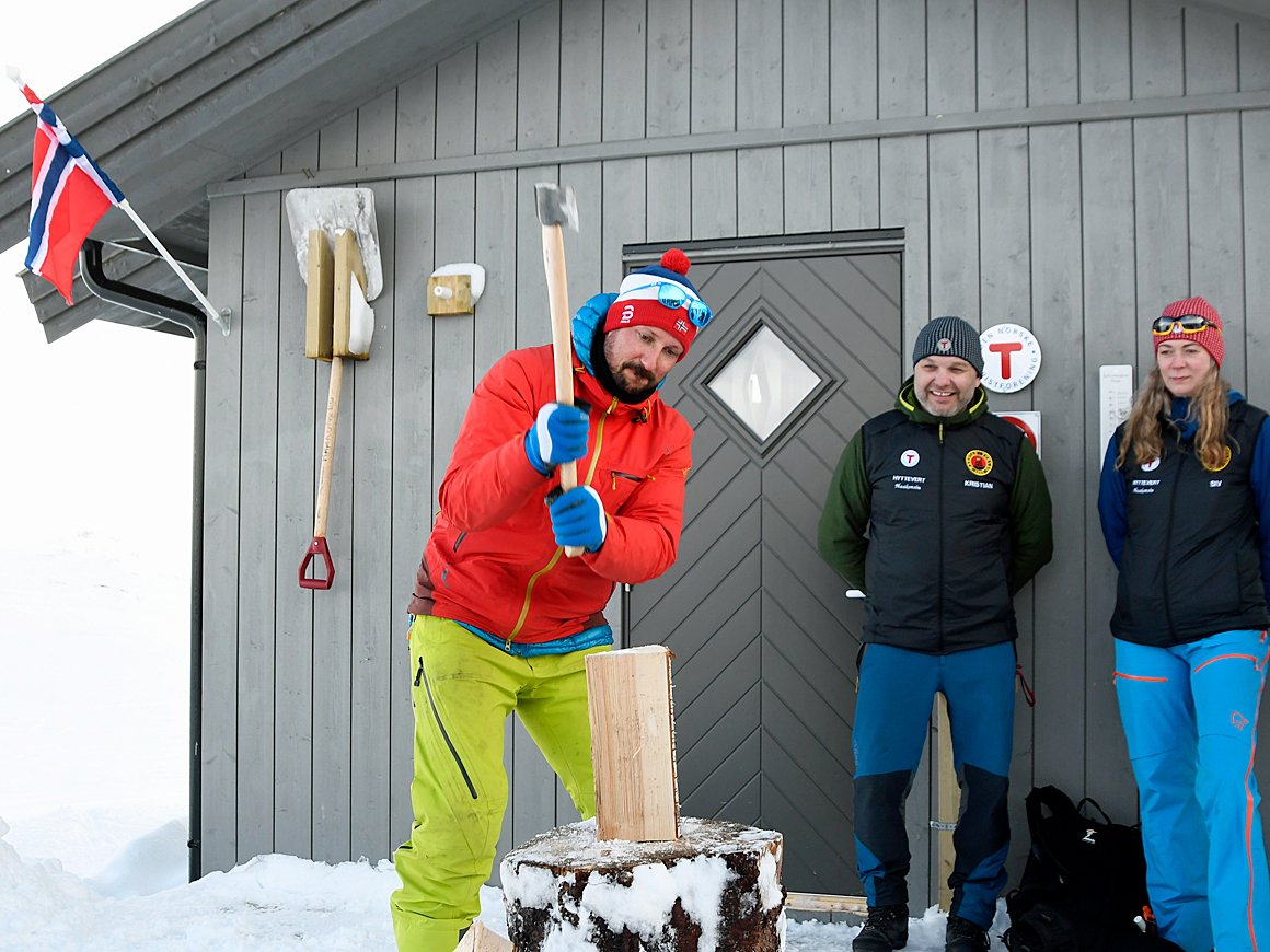Kronprins Haakon foretok den offisielle åpningen av DNT-hytta ved å kløyve en vedkubbe – ved til neste gjest på den nye turisthytta.