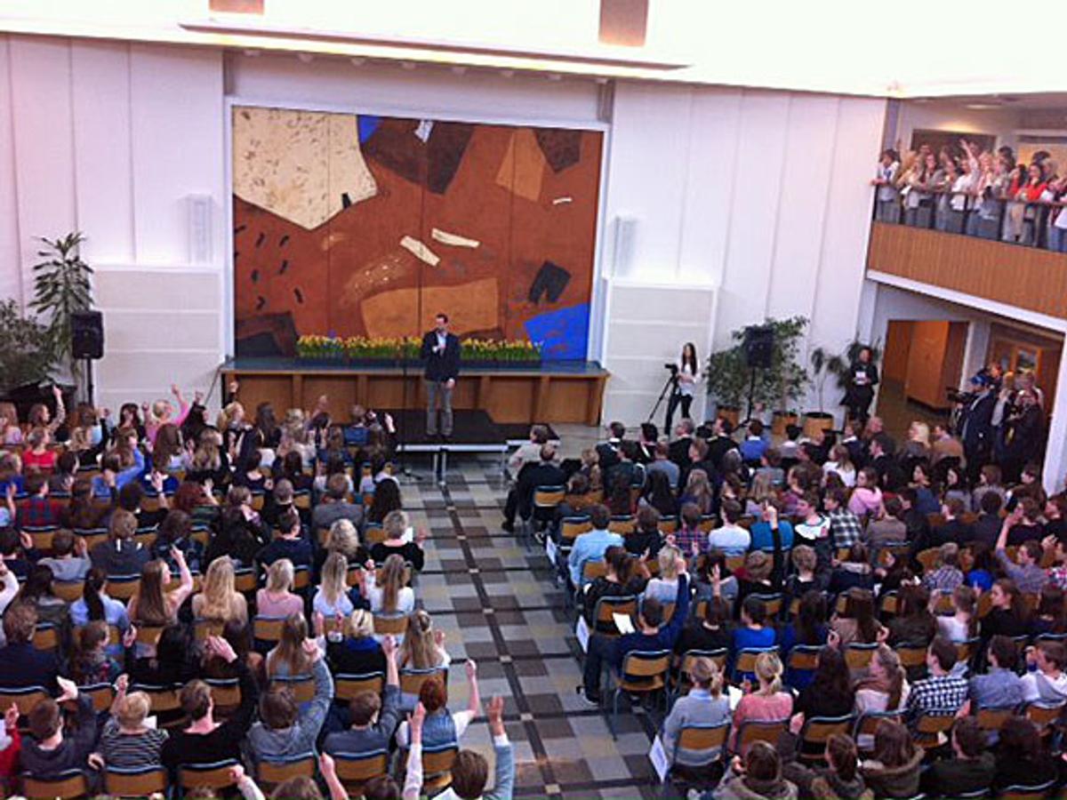640 elever ved Skeivang brukte halve skoledagen til å snakke om verdighet. Kronprinsen ledet selv samtalene i et av klasserommene.