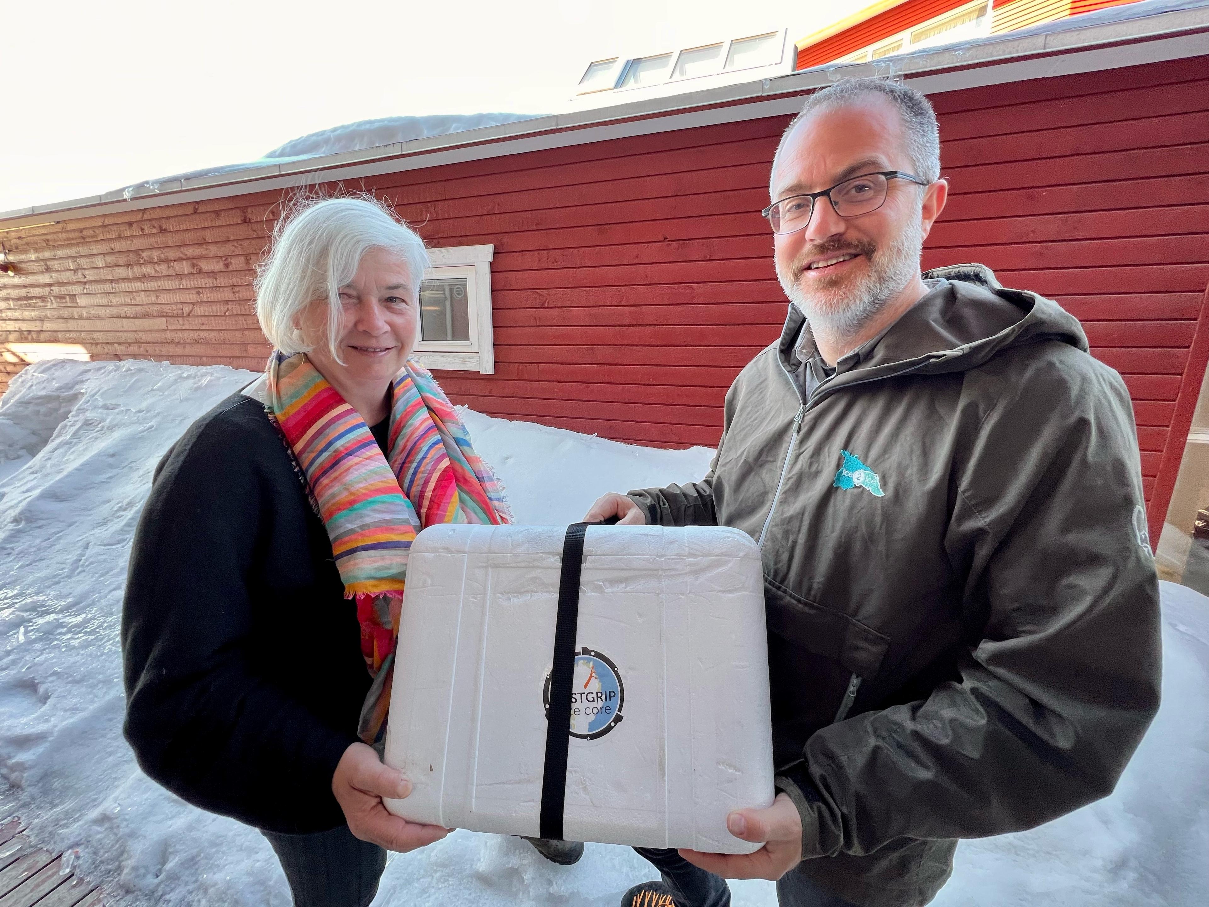 På Isfjordsenteret orienterte de ekspedisjonsmedlemmene om forskningen som nå foregår på innlandsisen. De overleverte også oppdraget om å samle snøprøver til forskerne på EastGRIP til Dag Rune Olsen, rektor ved UiT.