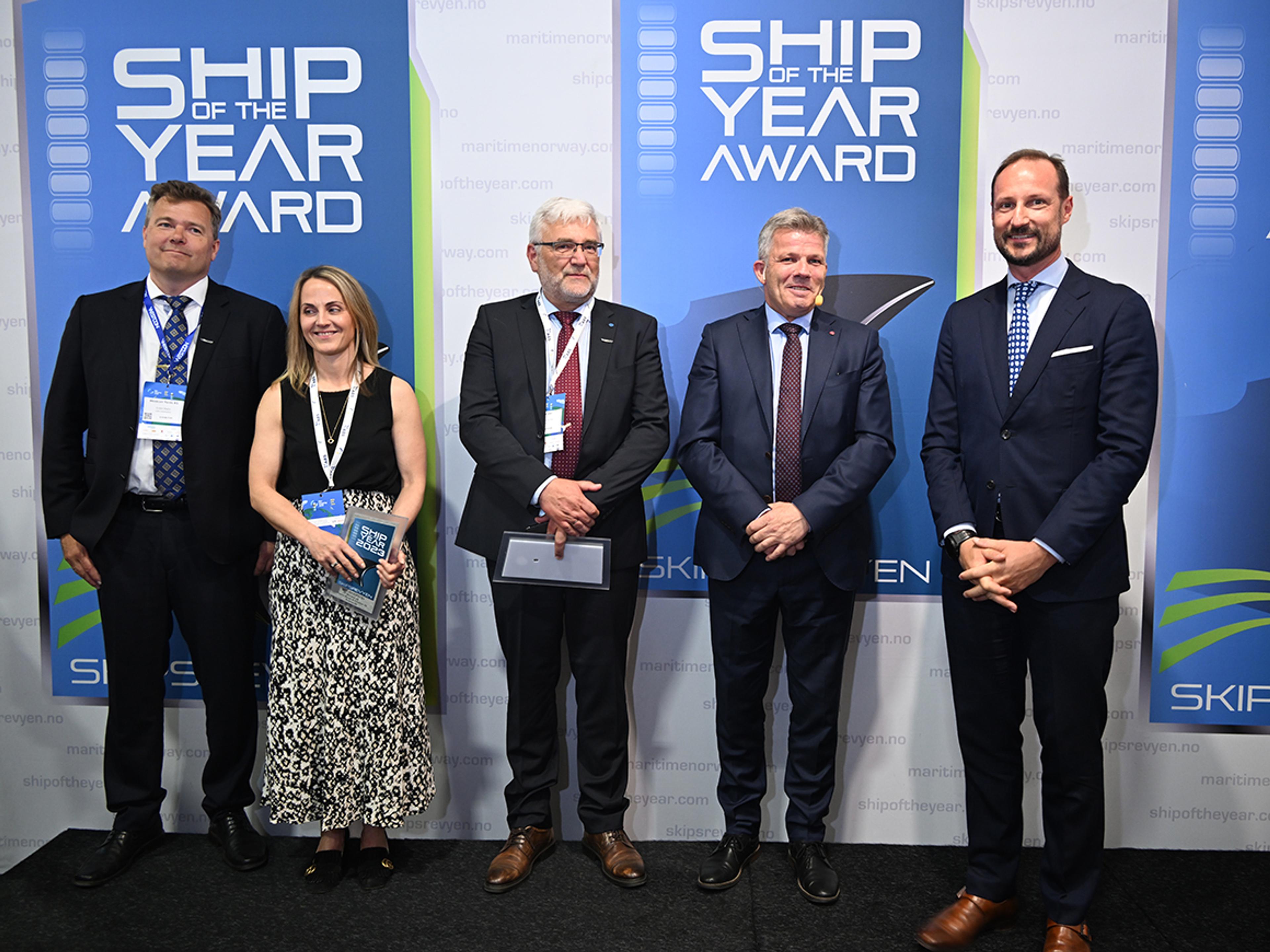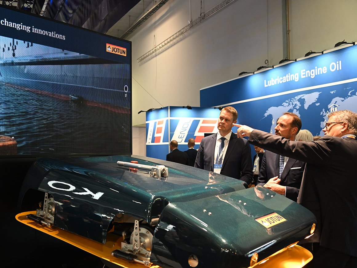 Under omvisinga gjorde Kronprinsen fleire stopp der han møtte aktørar som jobbar med spennande prosjekt for ei berekraftig og sirkulær shippingframtid, blant anna Jotun, DNV og Norske Maritime Eksportører.