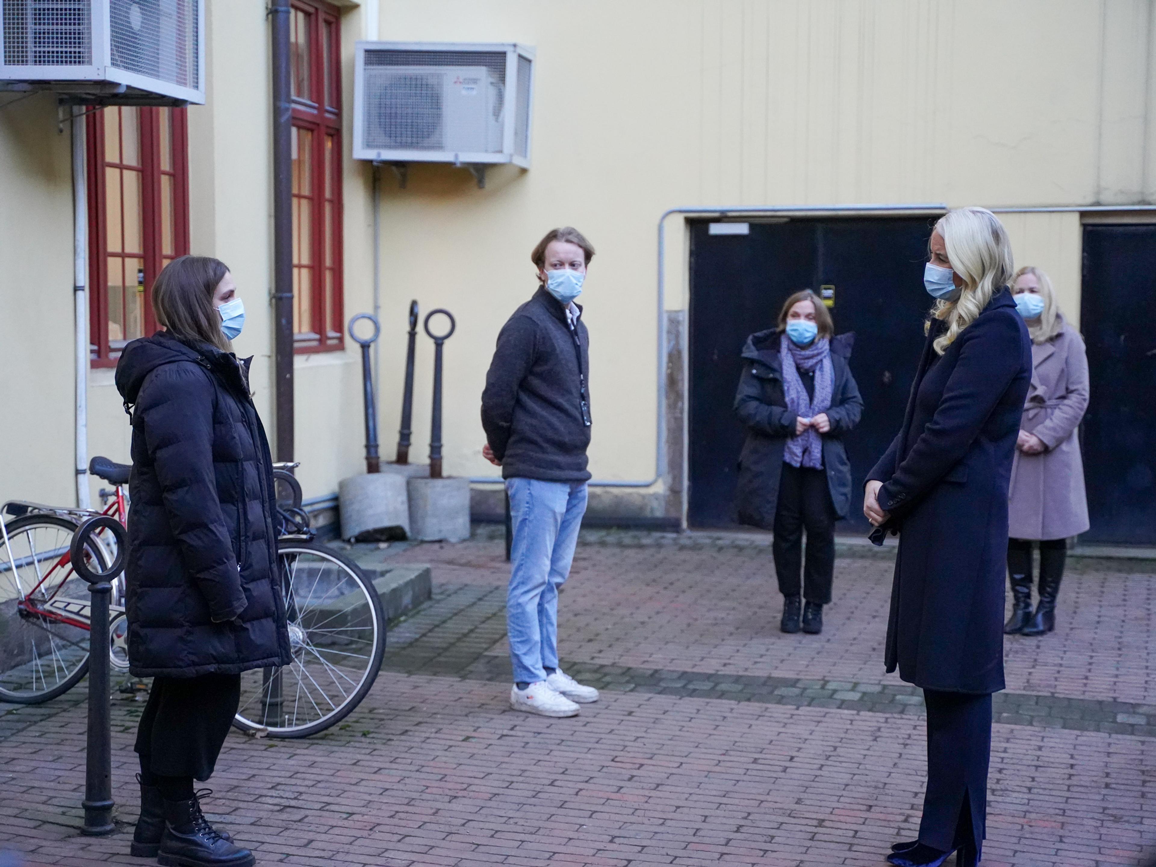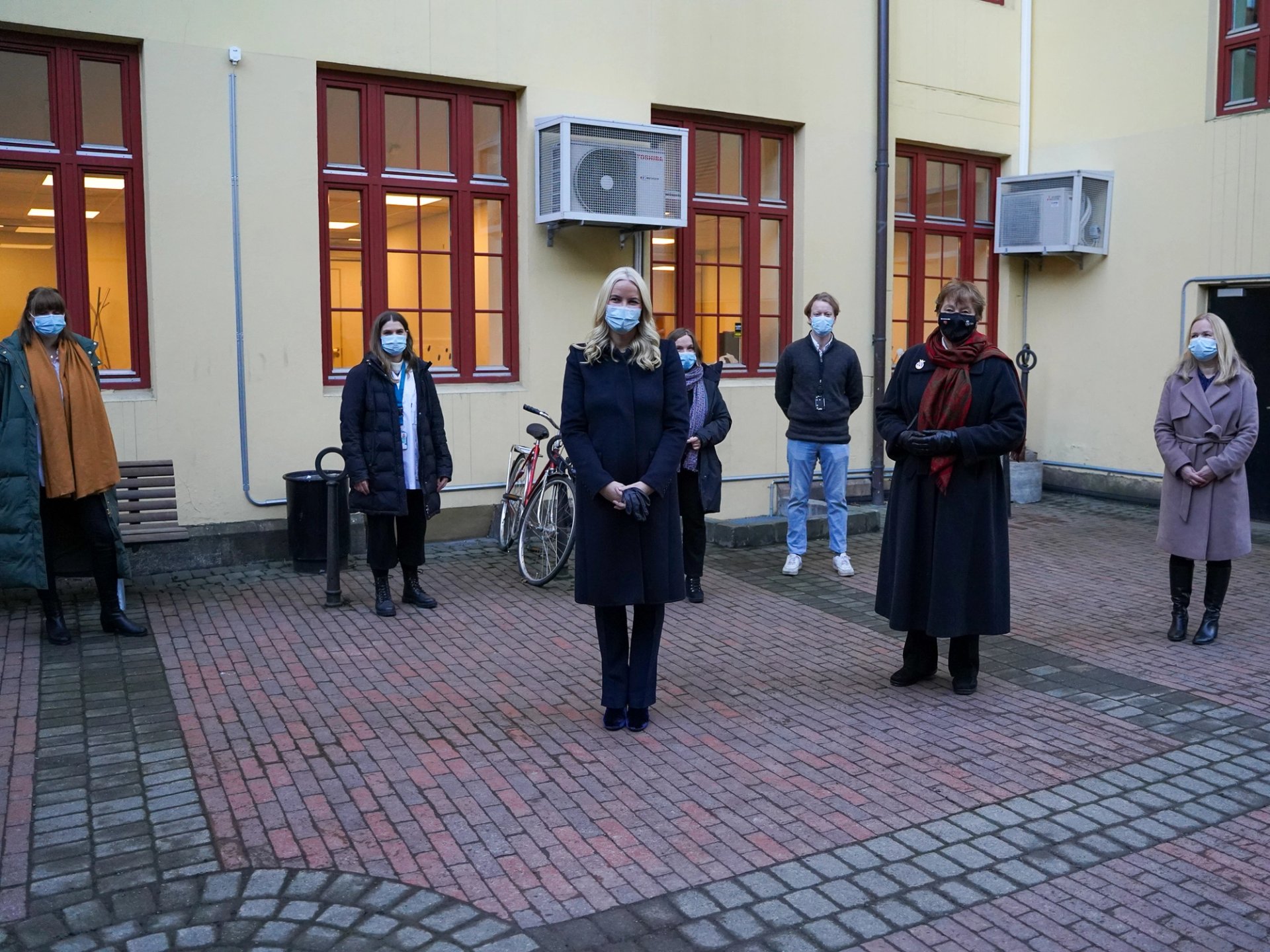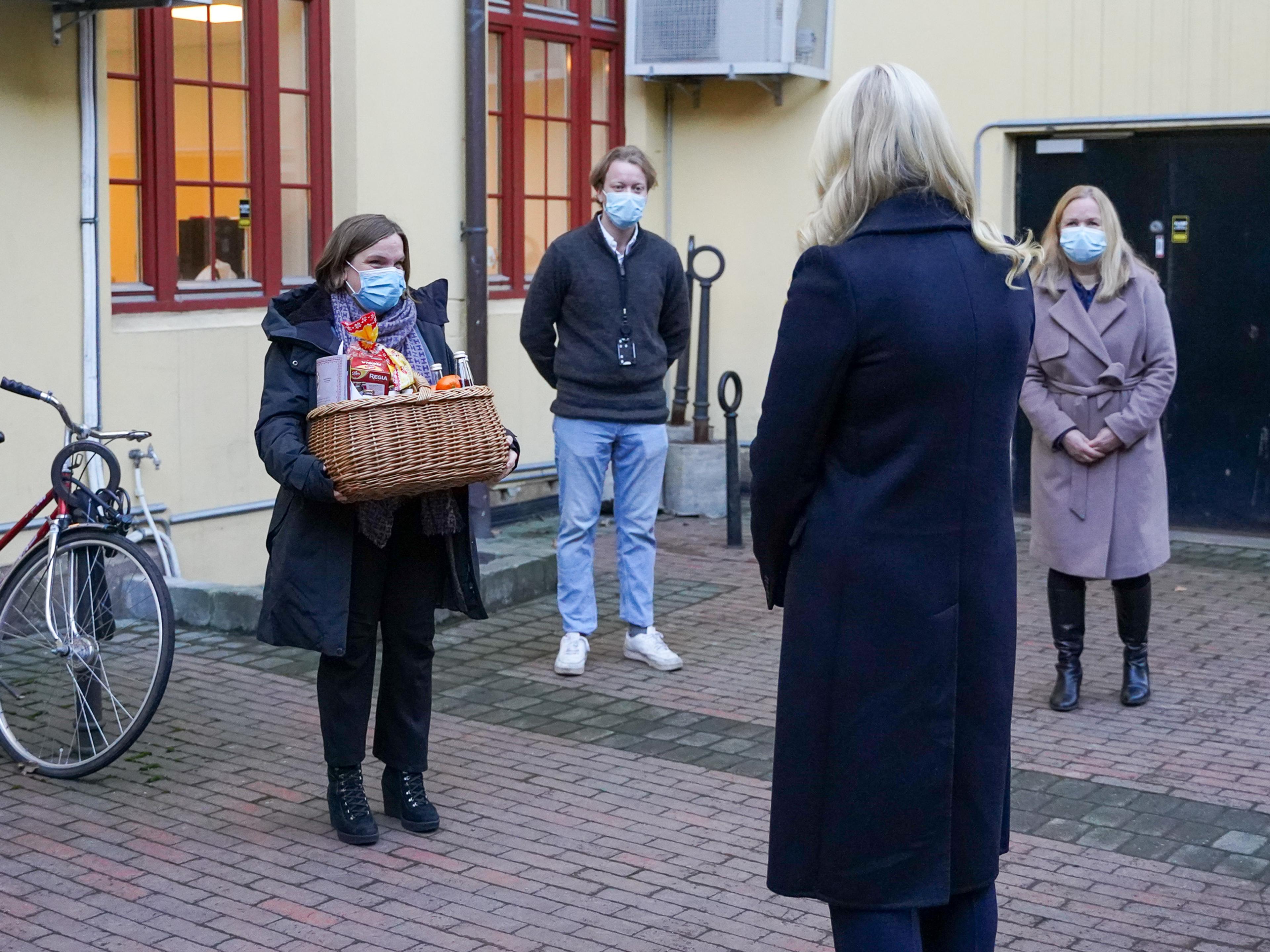 Besøket gjekk føre seg ute i bakgarden i Hausmannsgate 5, mens personar med timeavtale for vaksinering hasta forbi. Kronprinsessa var imponert over innsatsen til dei ho møtte på Grünerløkka i dag.