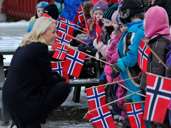 Kronprinsesse Mette-Marit er på et todagers besøk i Trøndelag, og ankom Levanger i dag morges. Her ble hun tatt varmt imot av barnehagebarn som hadde møtt fram utenfor Leira asylmottak.