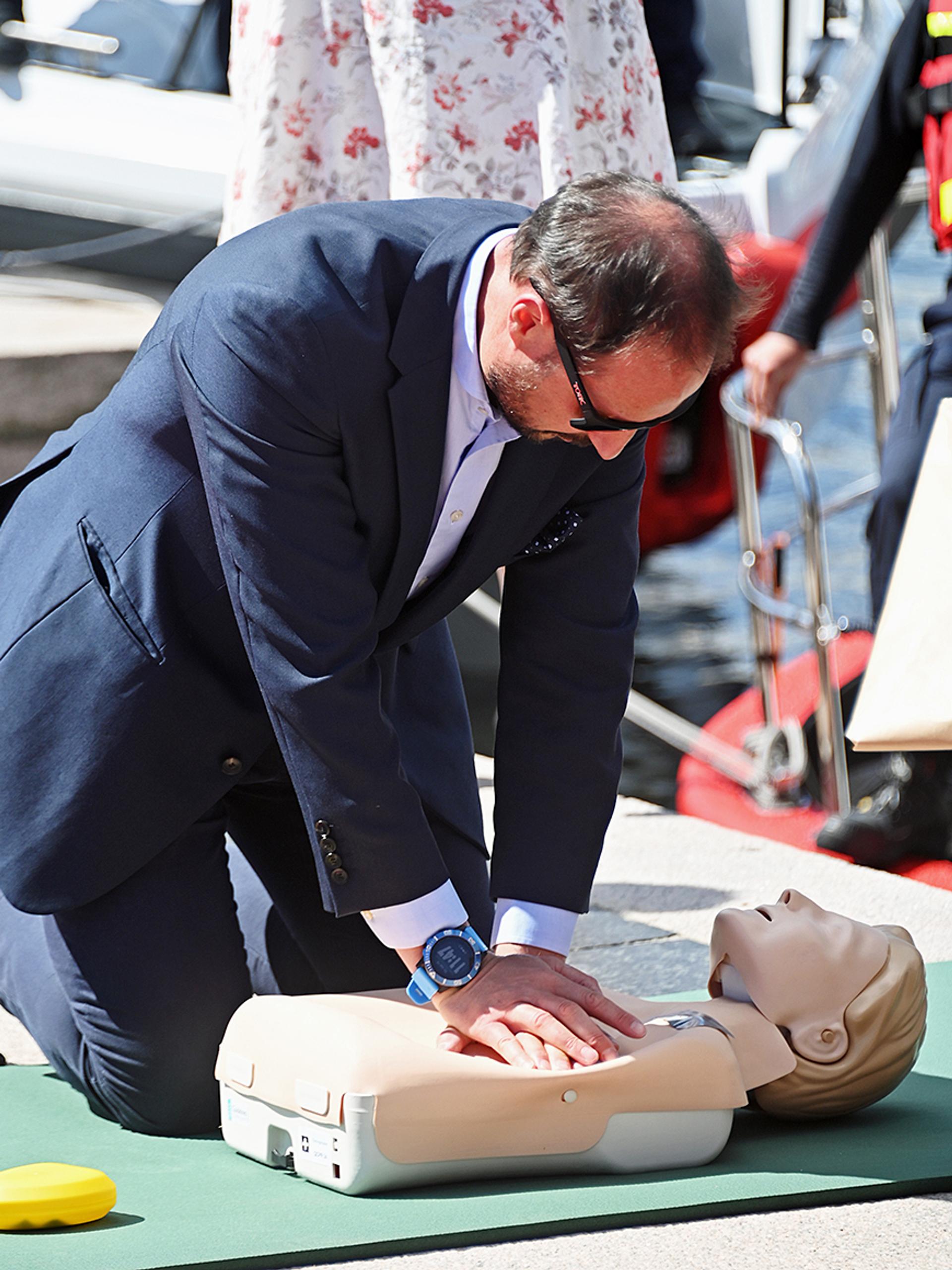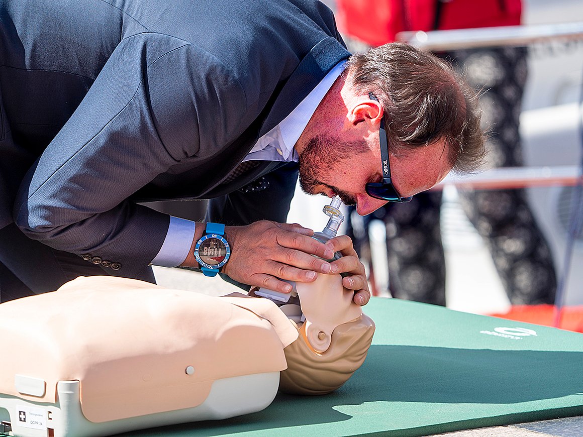 Direktør ved RS-akademiet, Matt Skue, og båtfører Hanne Heimdal demonstrerte hjerte- og lungeredning på redningsdukker. Deretter fikk Kronprins Haakon prøve seg på livredning på redningsdukker.