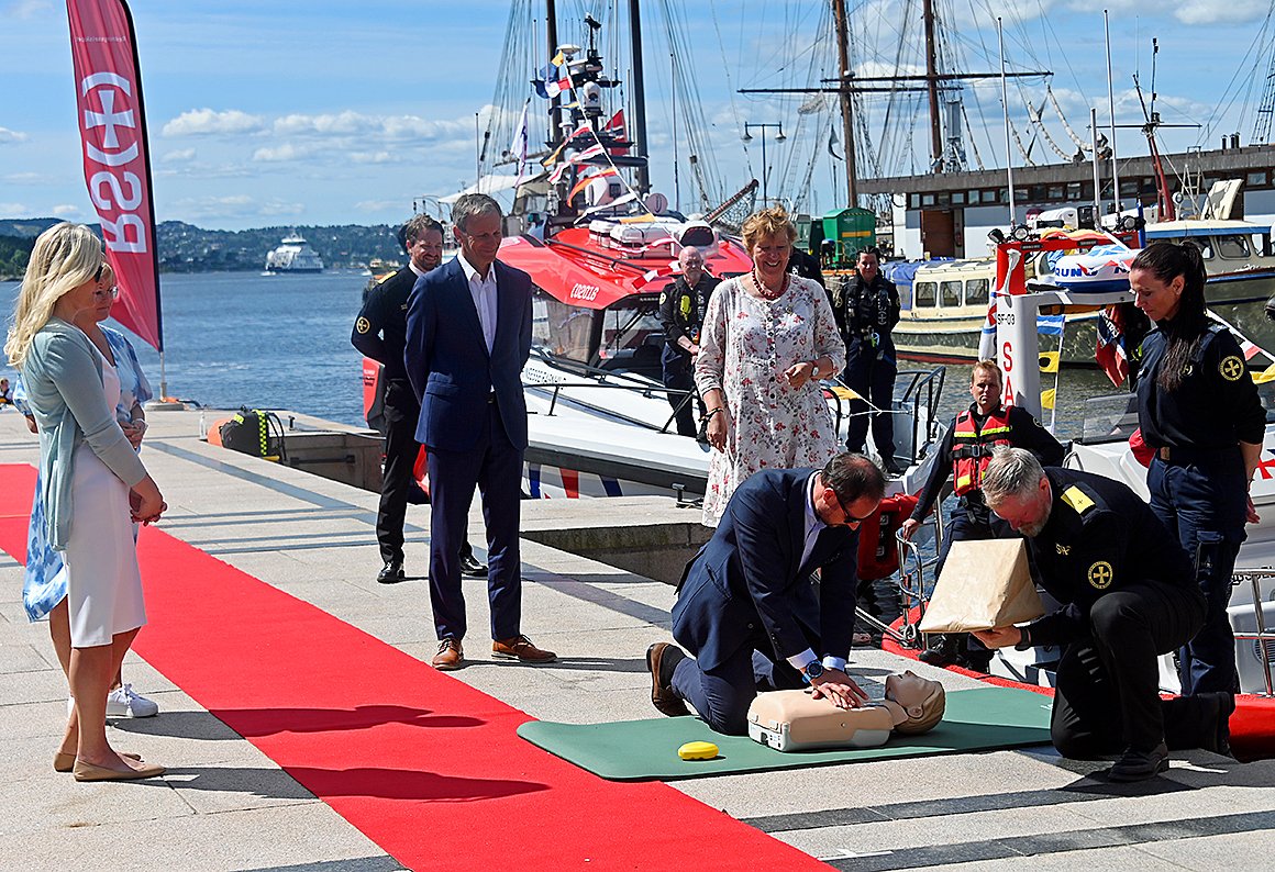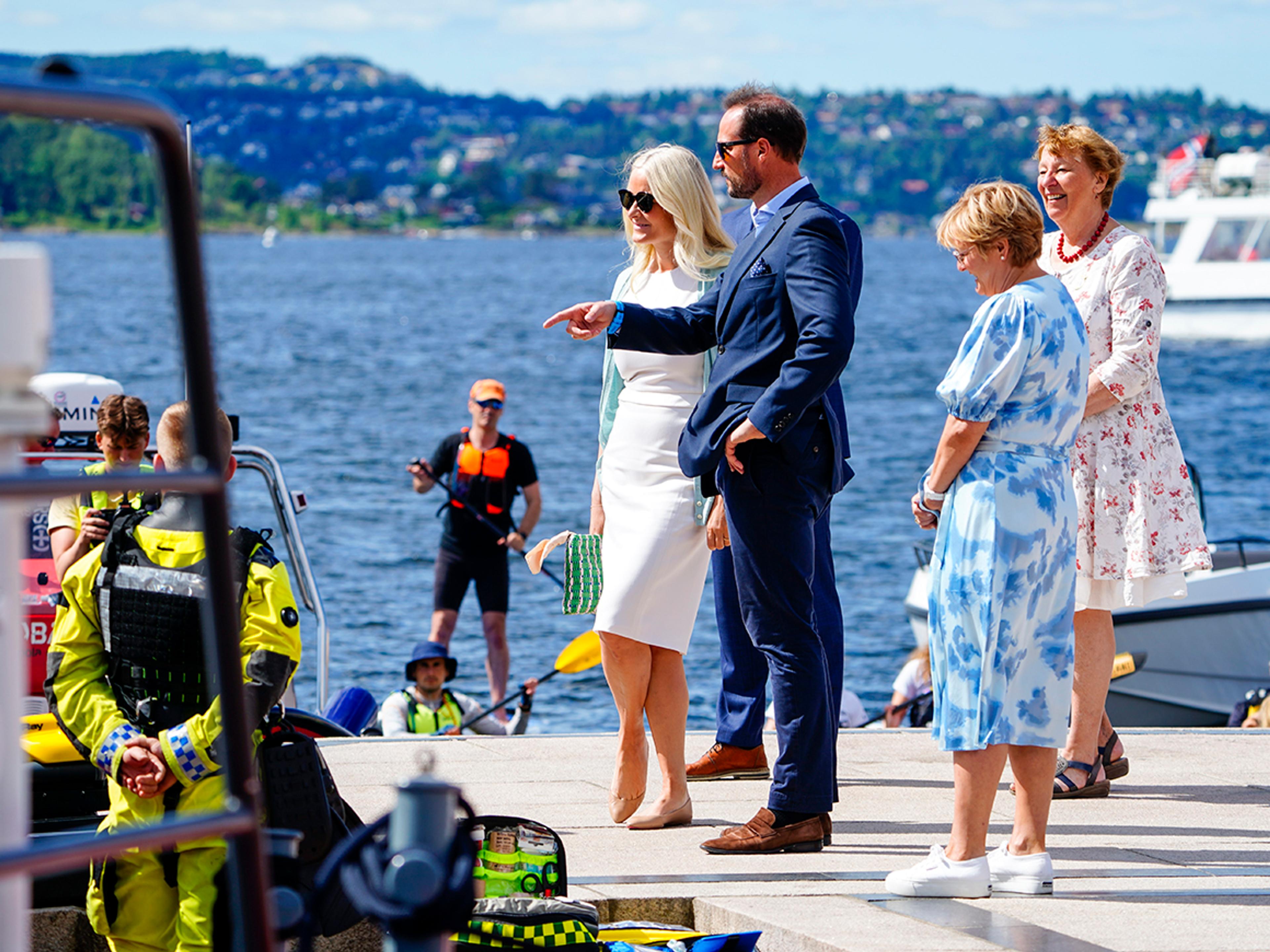 Deres Kongelige Høyheter Kronprinsen og Kronprinsessen fikk i formiddag se og prøve seg på livredning under Redningsselskapets åpning av båtsommeren på Honnørbrygga i Oslo.